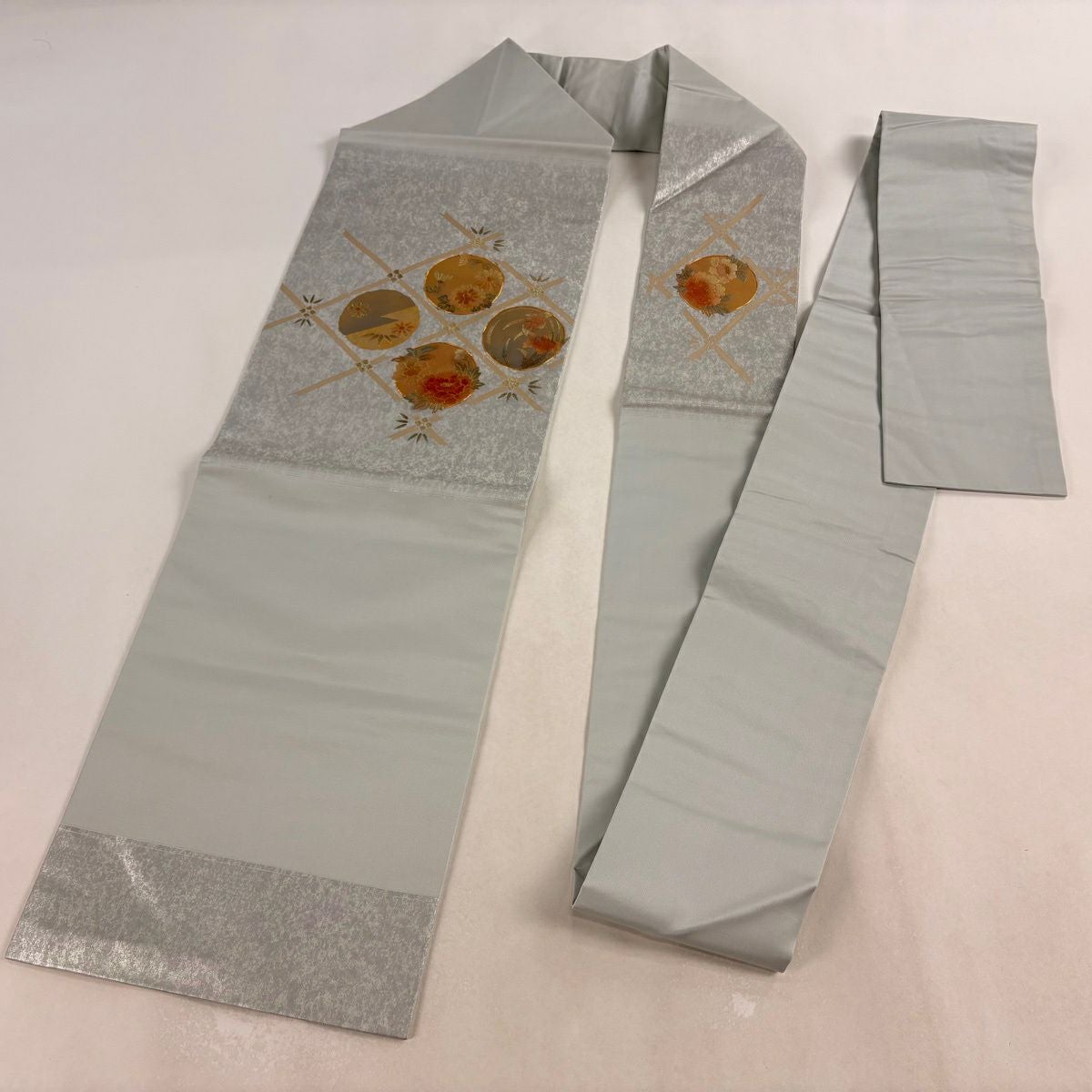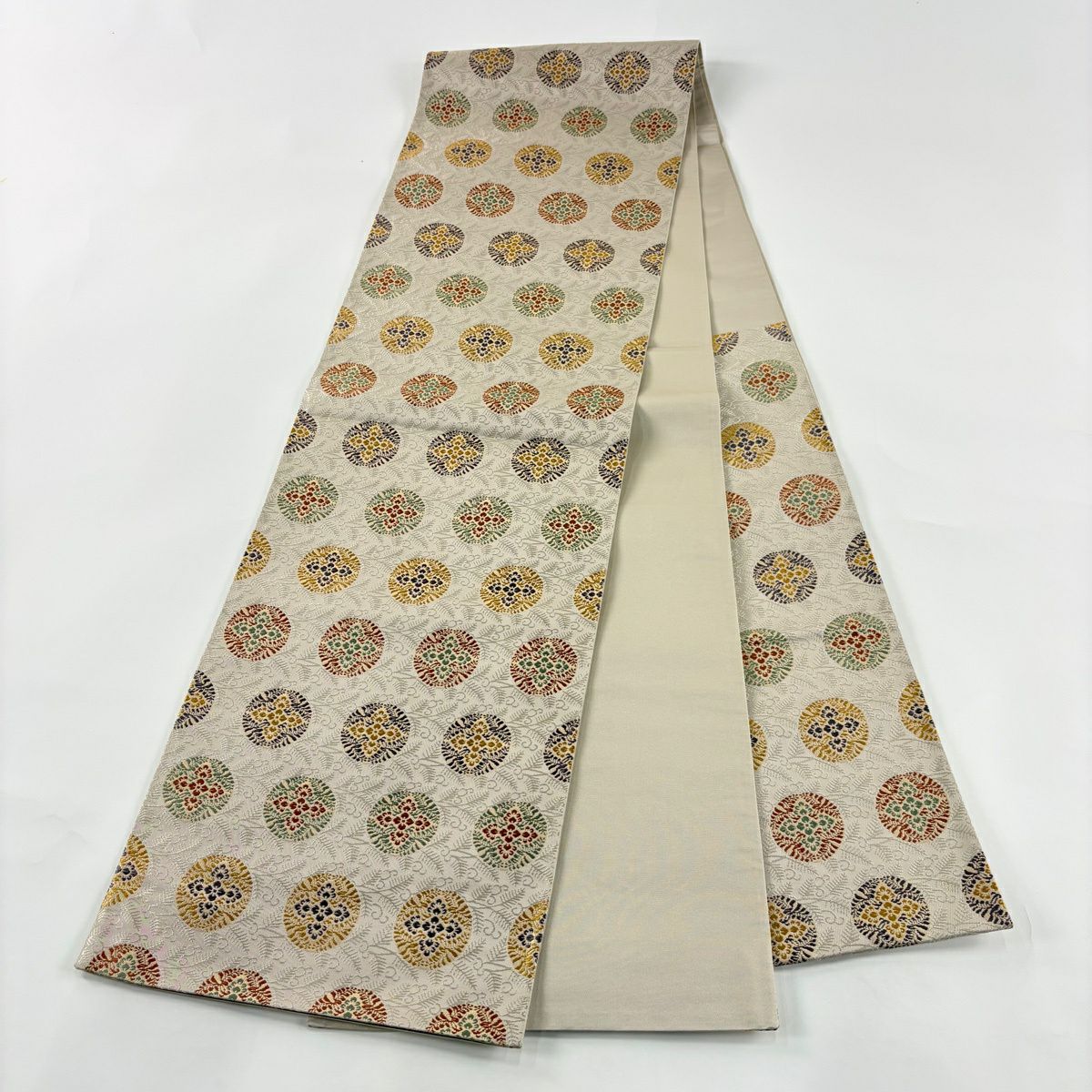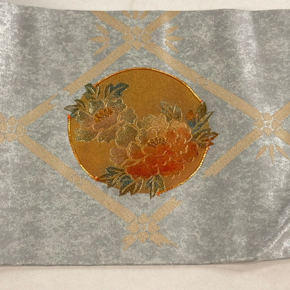 【美品】 名古屋帯 秀品 格天井 花丸文 箔 金彩 銀色 正絹
