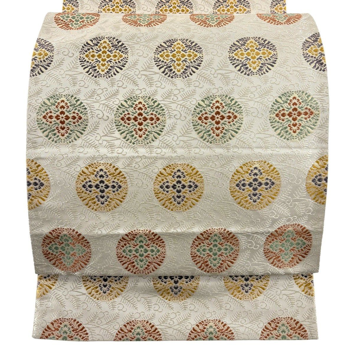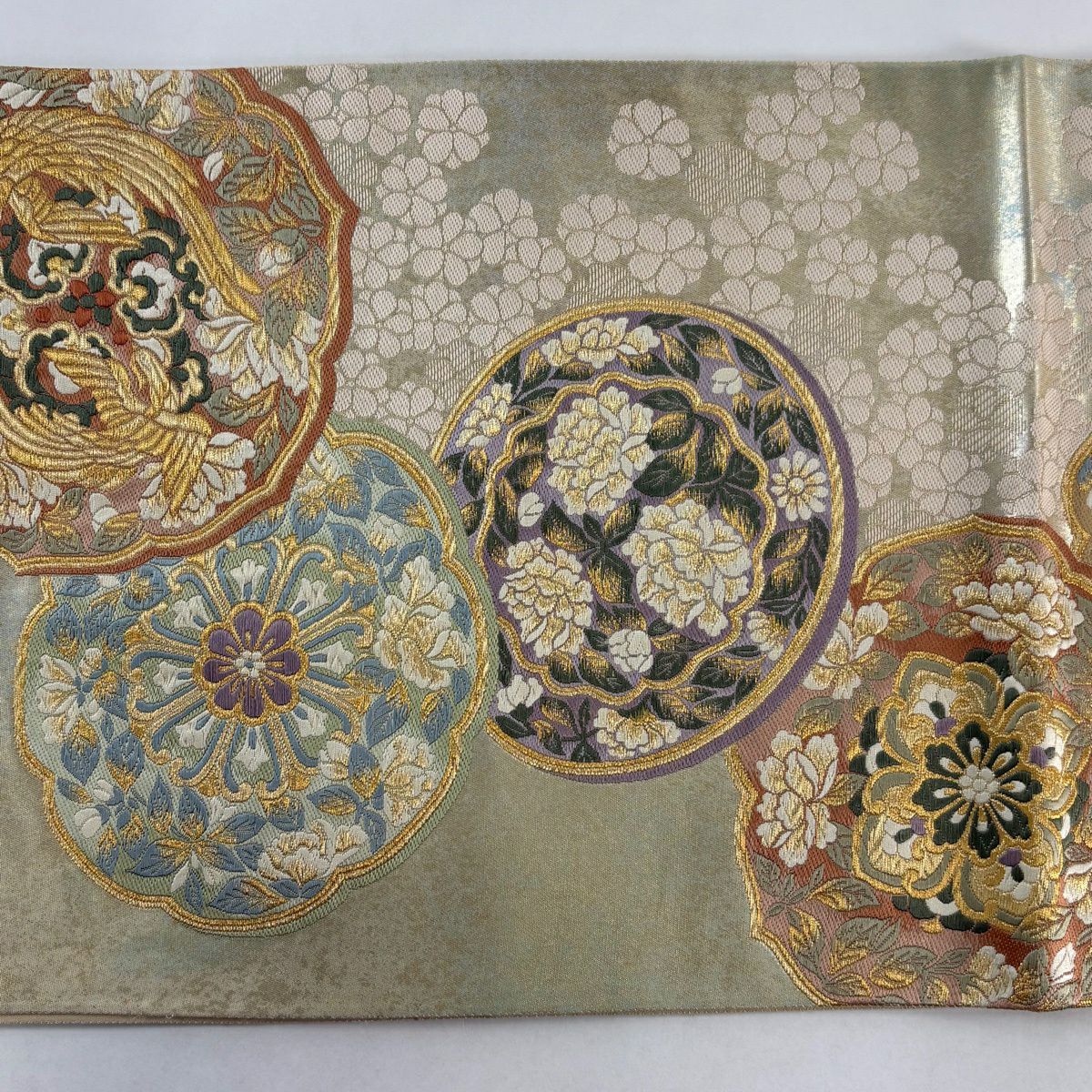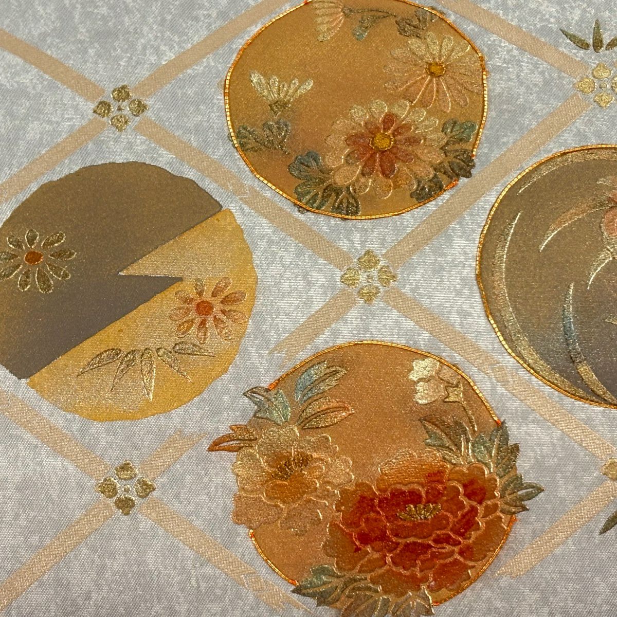 【美品】 名古屋帯 秀品 格天井 花丸文 箔 金彩 銀色 正絹