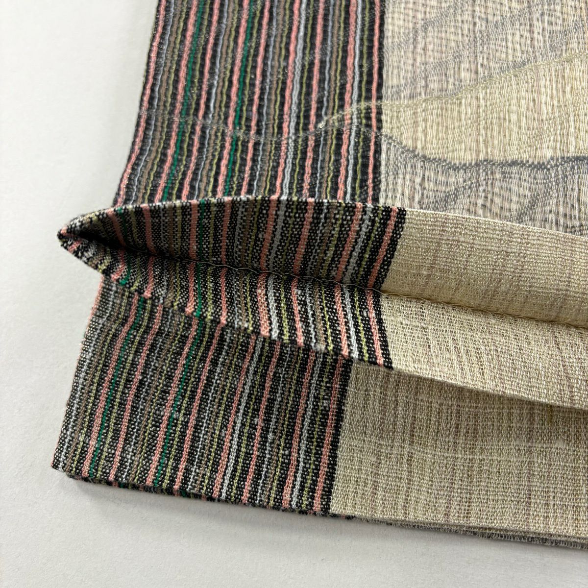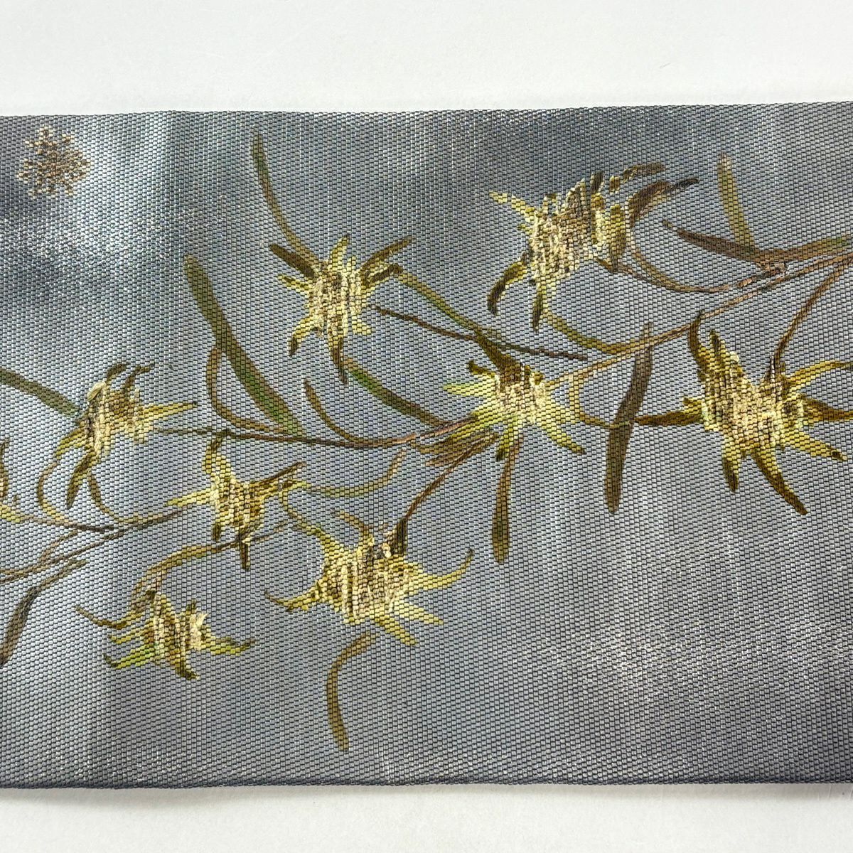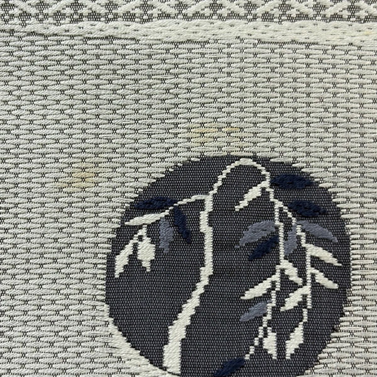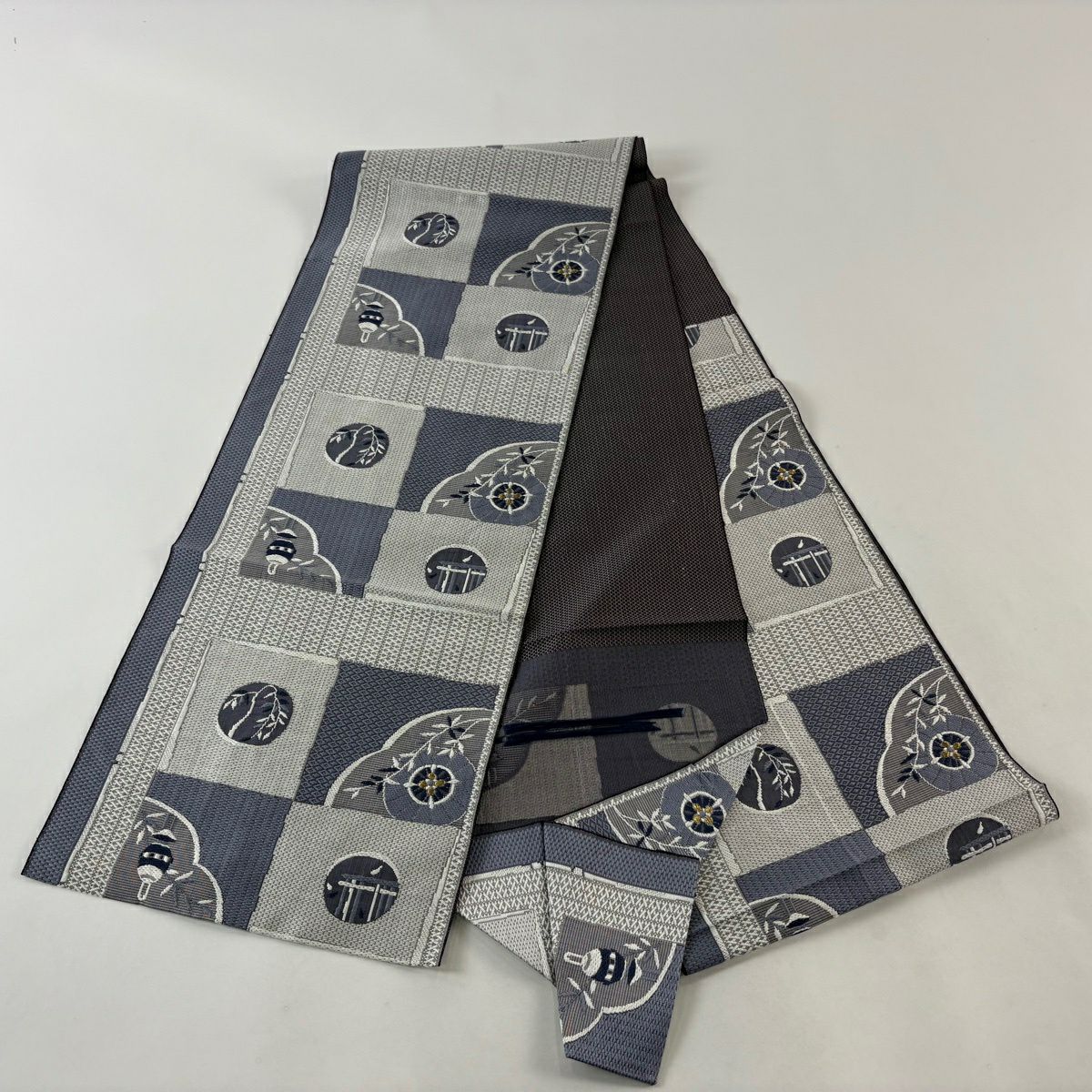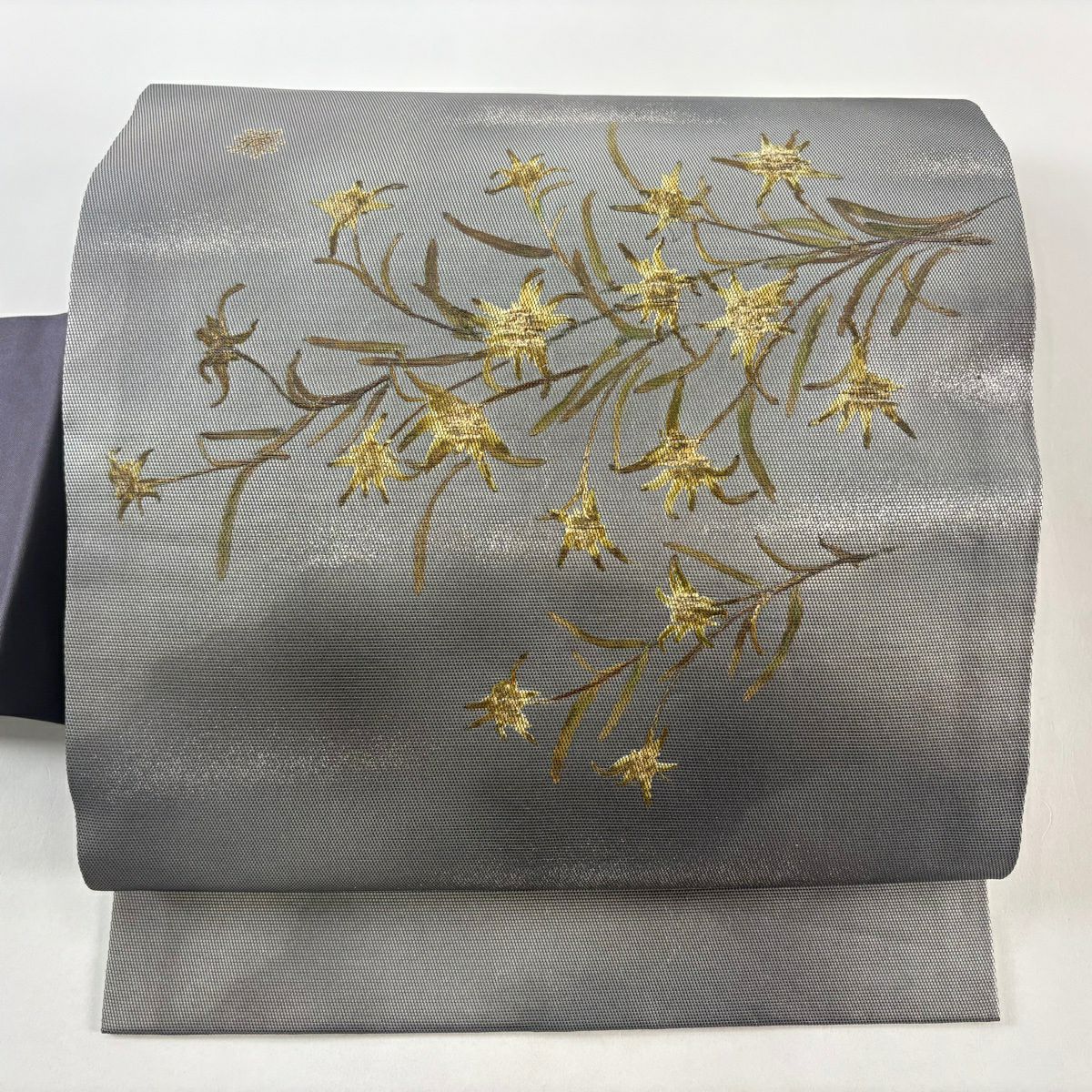 名古屋帯 秀品 八寸名古屋帯 松葉仕立て 番傘 柳 金糸 灰色 正絹