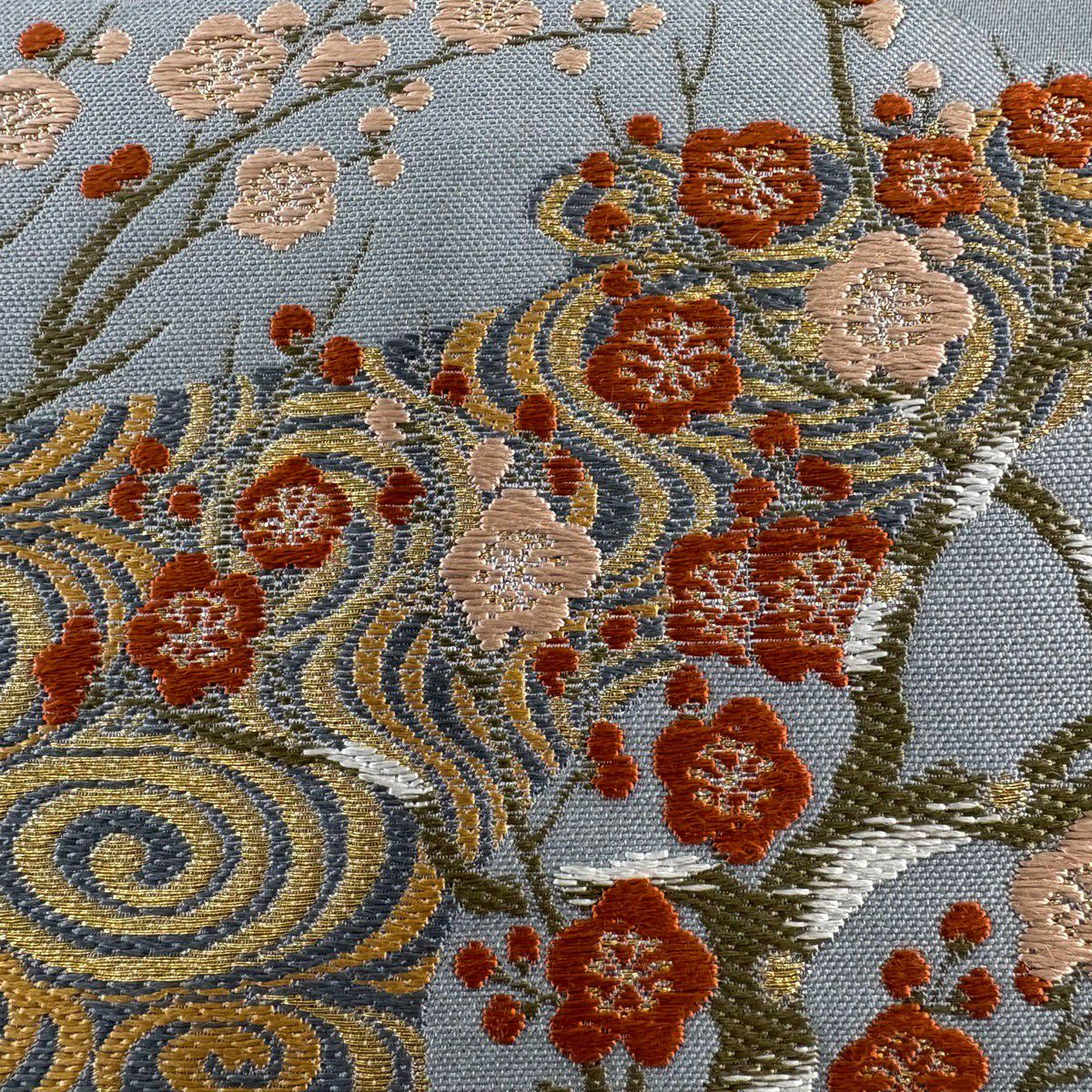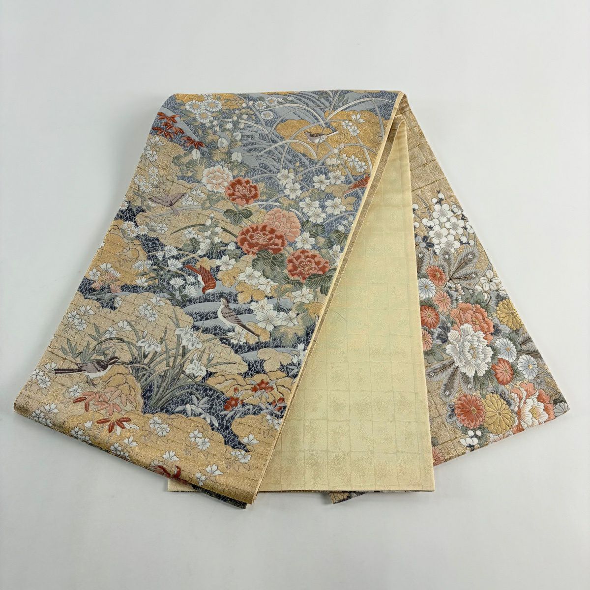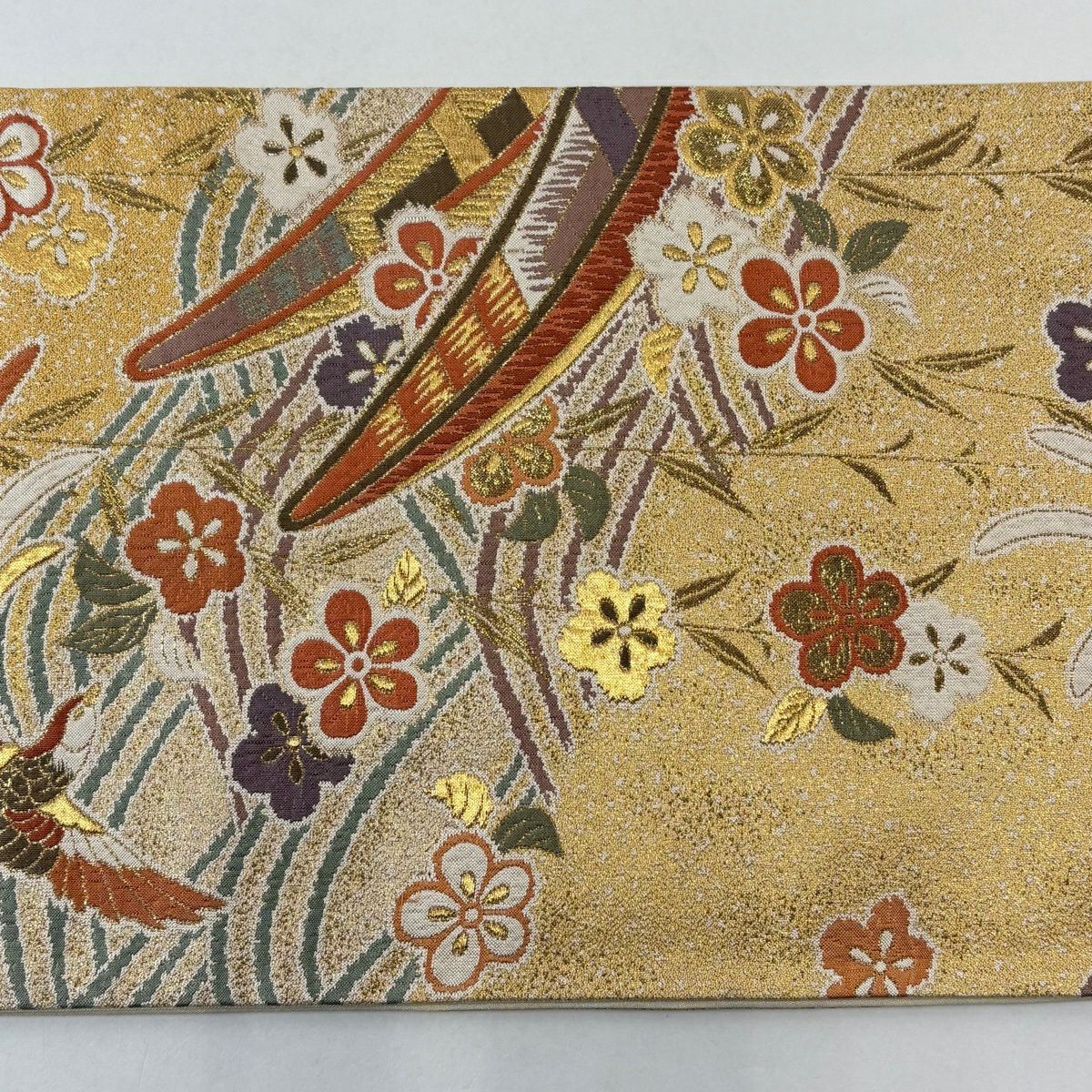 【美品】 袋帯 秀品 尾長鳥 梅 金糸 箔 山吹色 六通 正絹