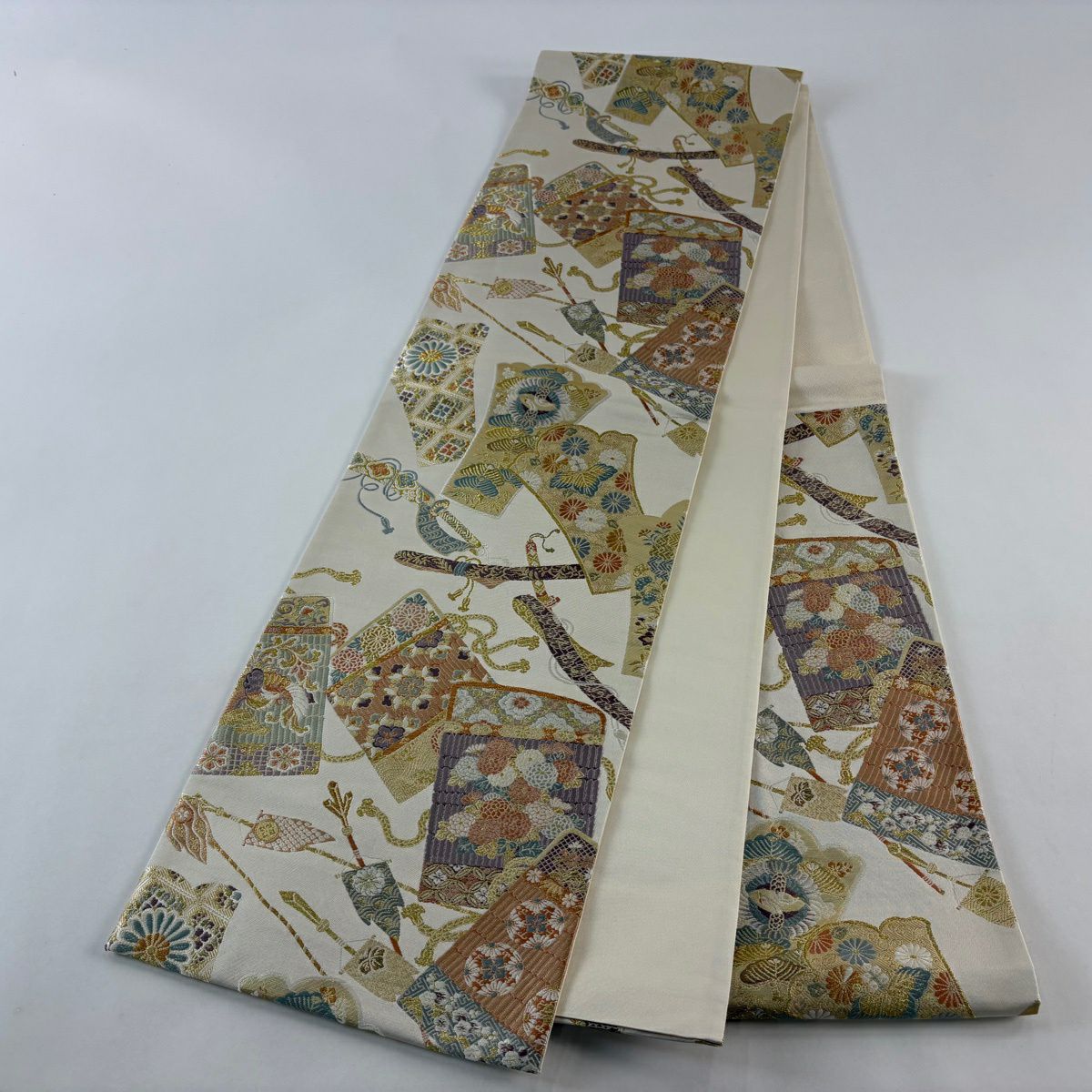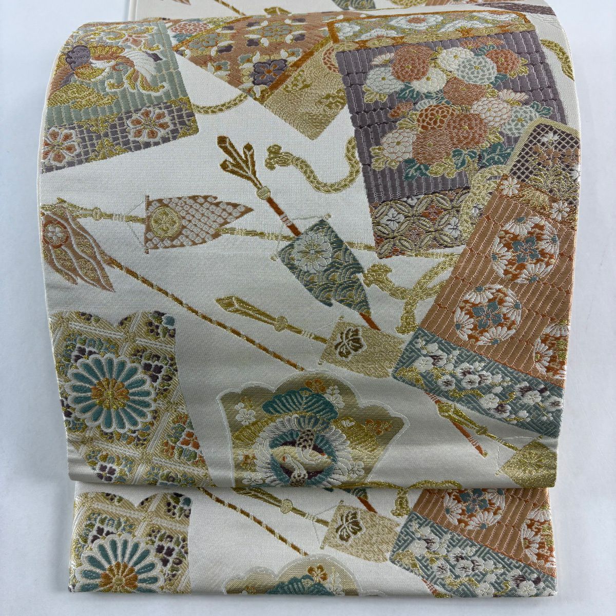 【美品】 袋帯 秀品 鎧威 刀 金糸 箔 クリーム 六通 正絹