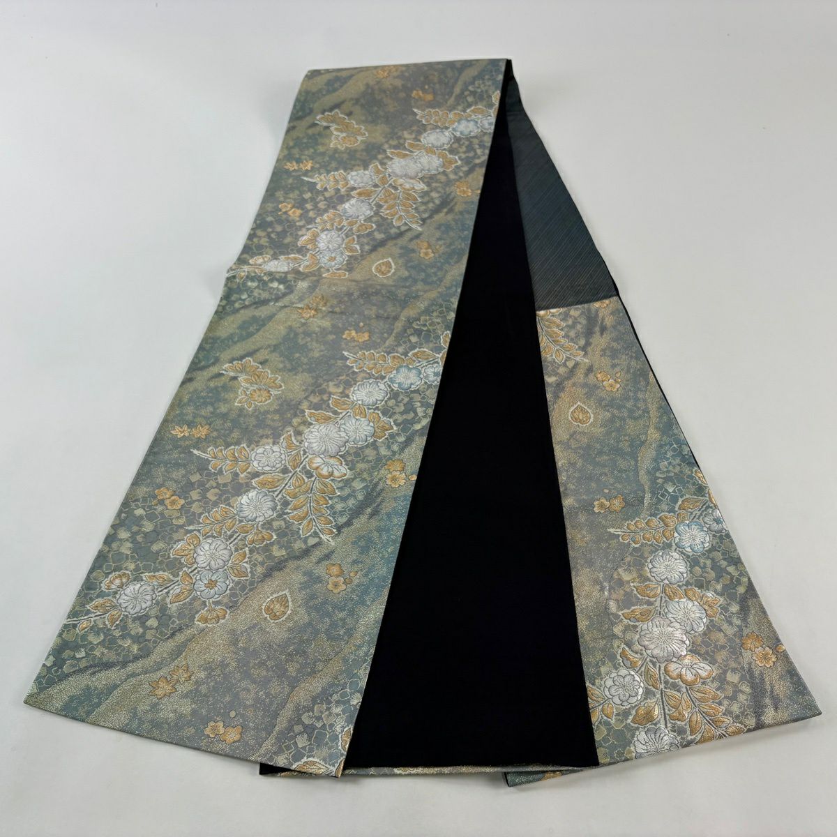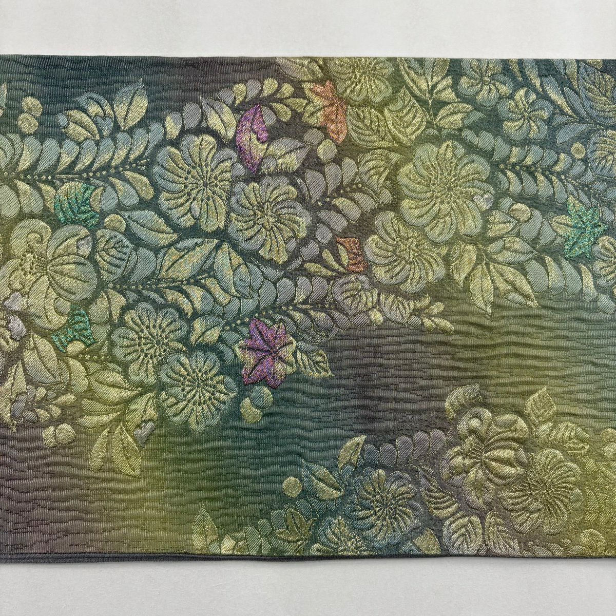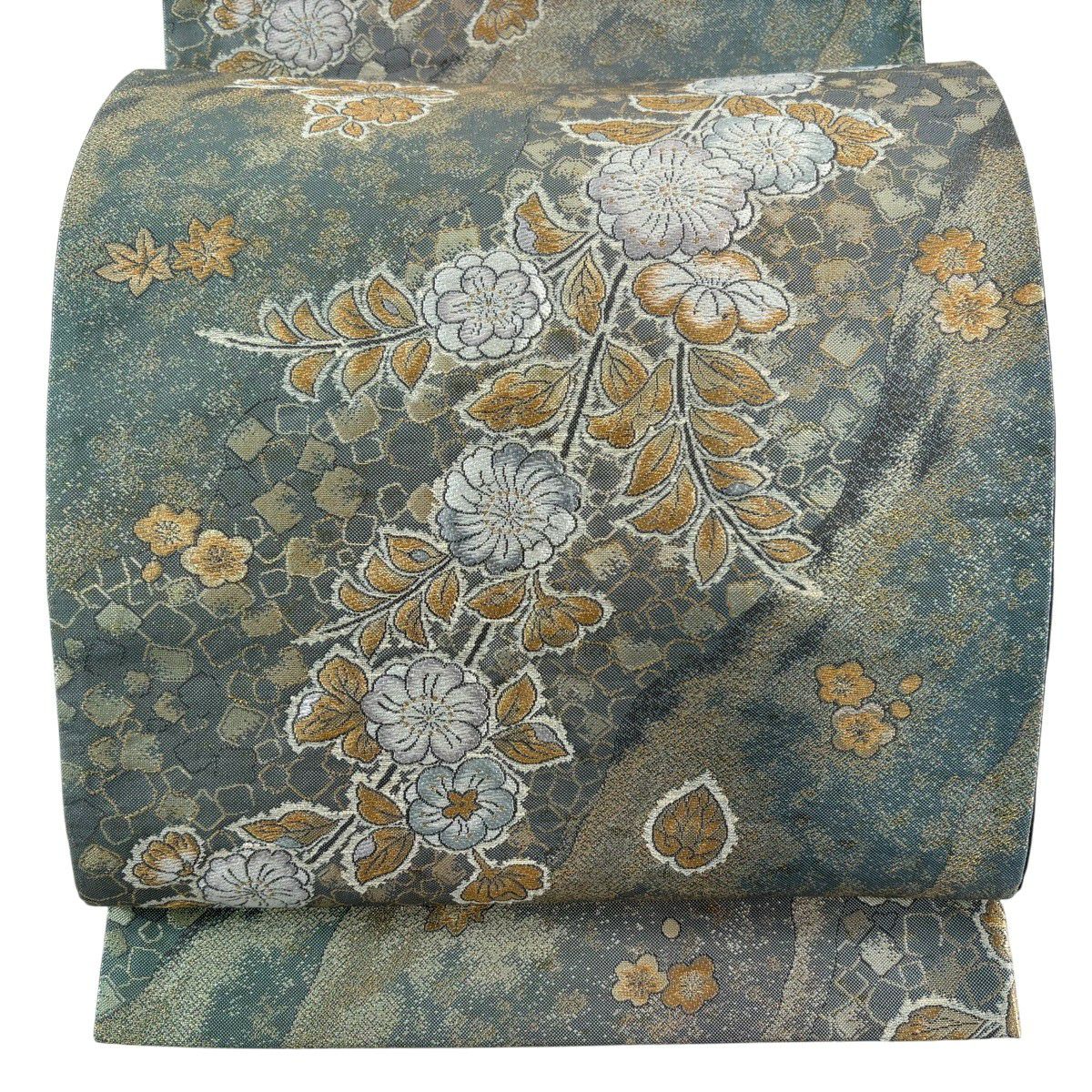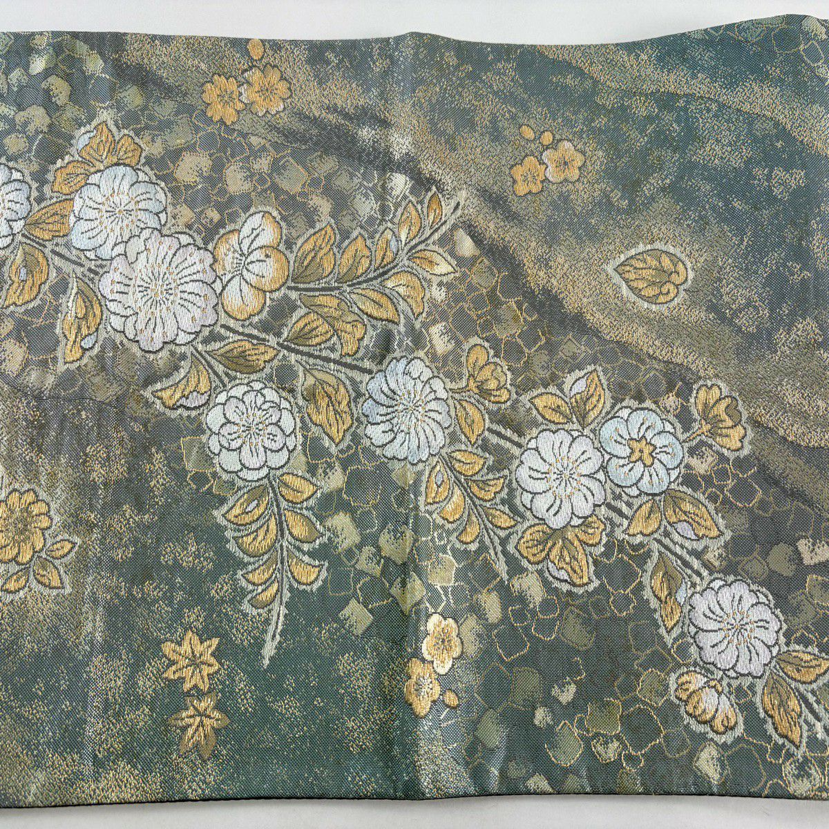 【美品】 袋帯 秀品 草花 箔散らし 刺繍 箔 灰緑 六通 正絹