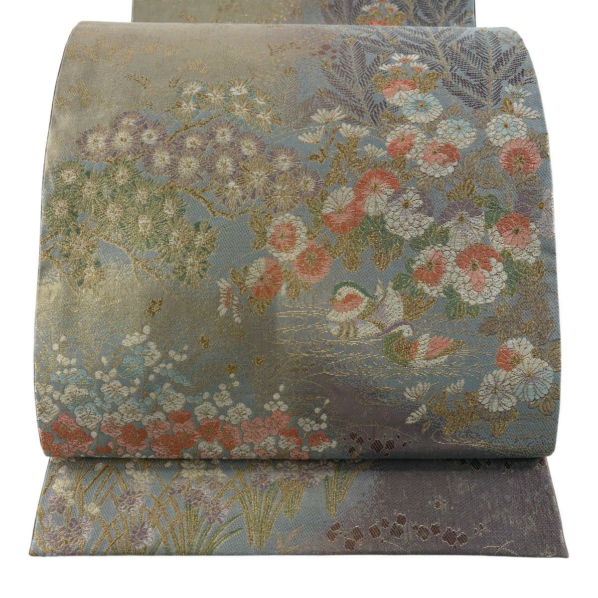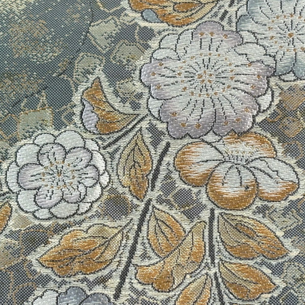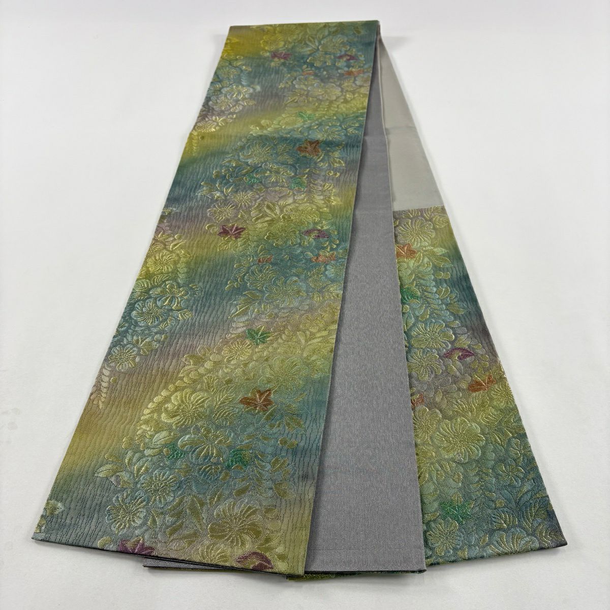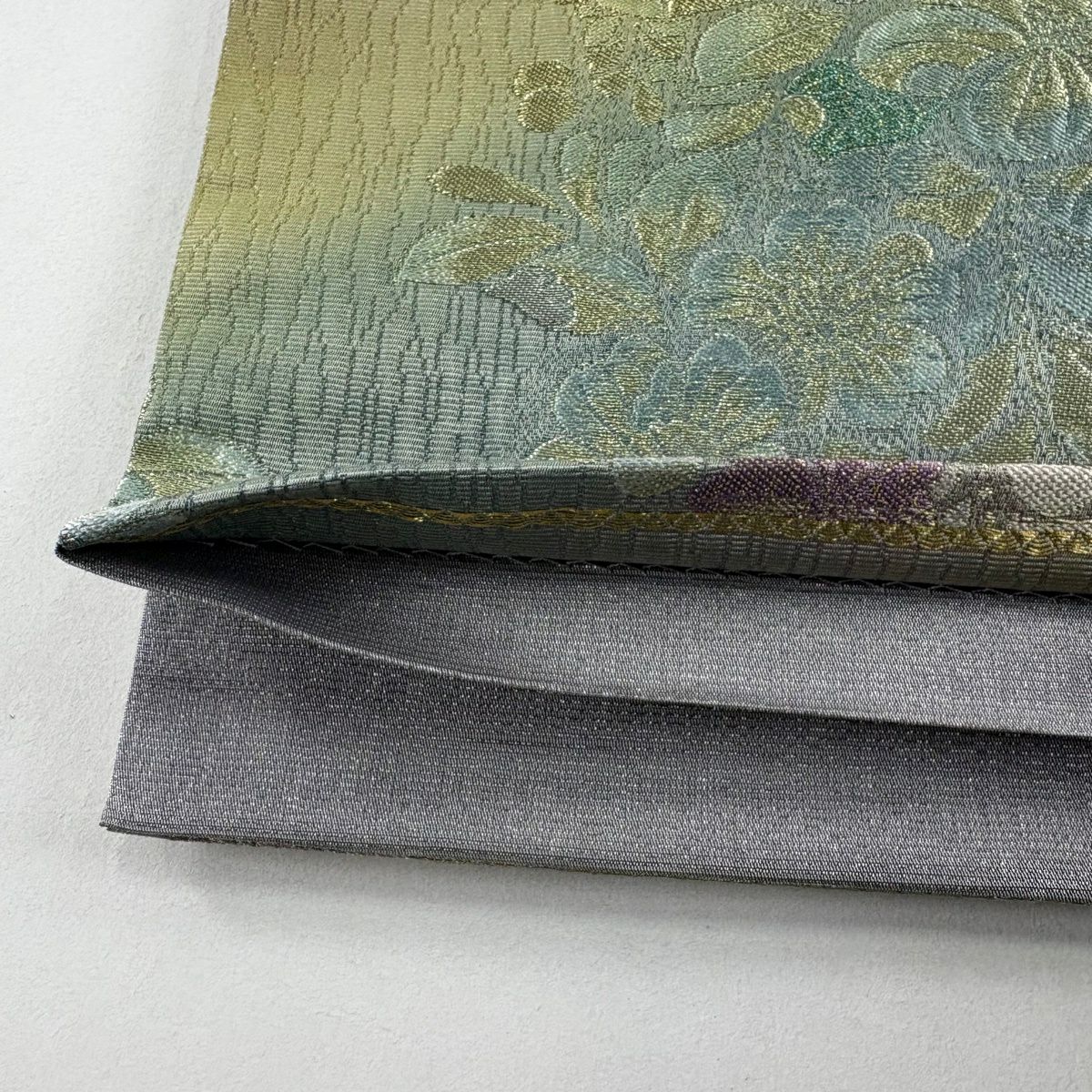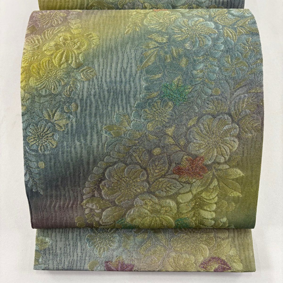 【美品】 袋帯 秀品 草花 箔散らし 刺繍 箔 灰緑 六通 正絹