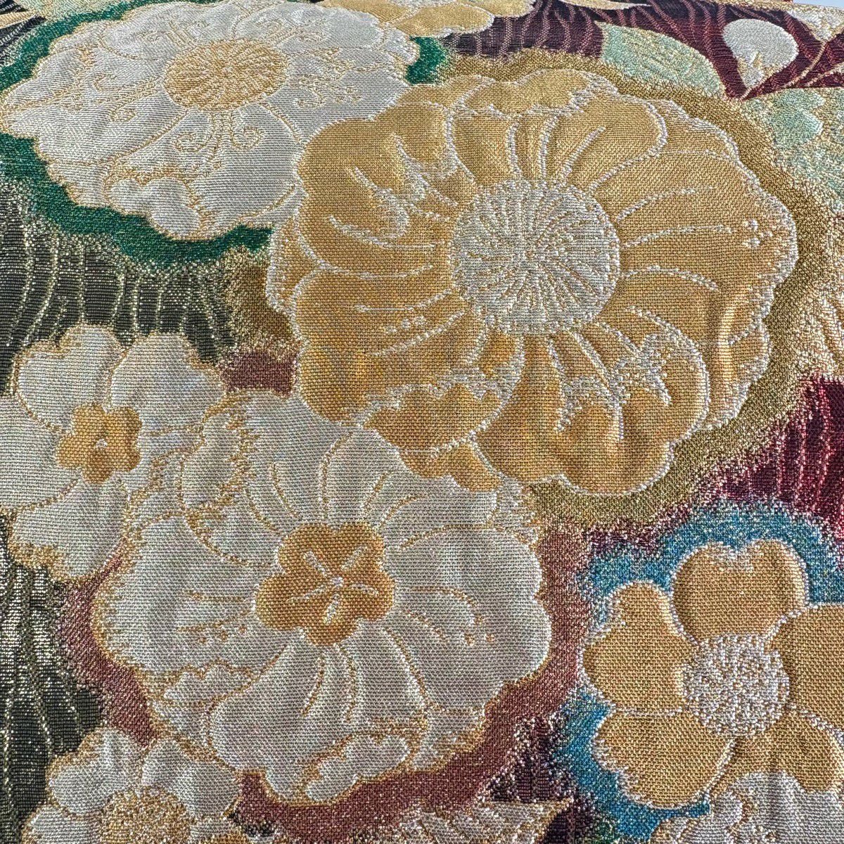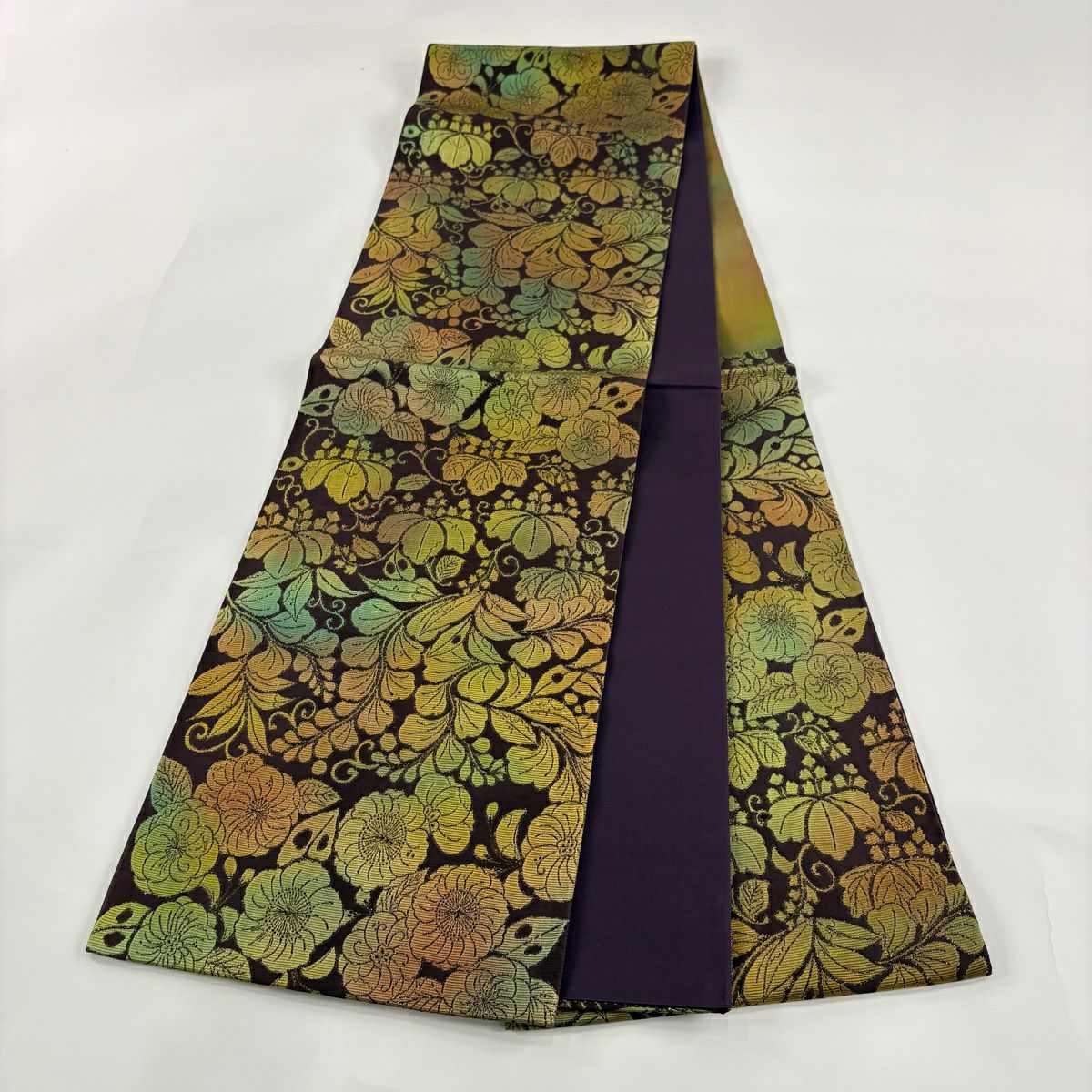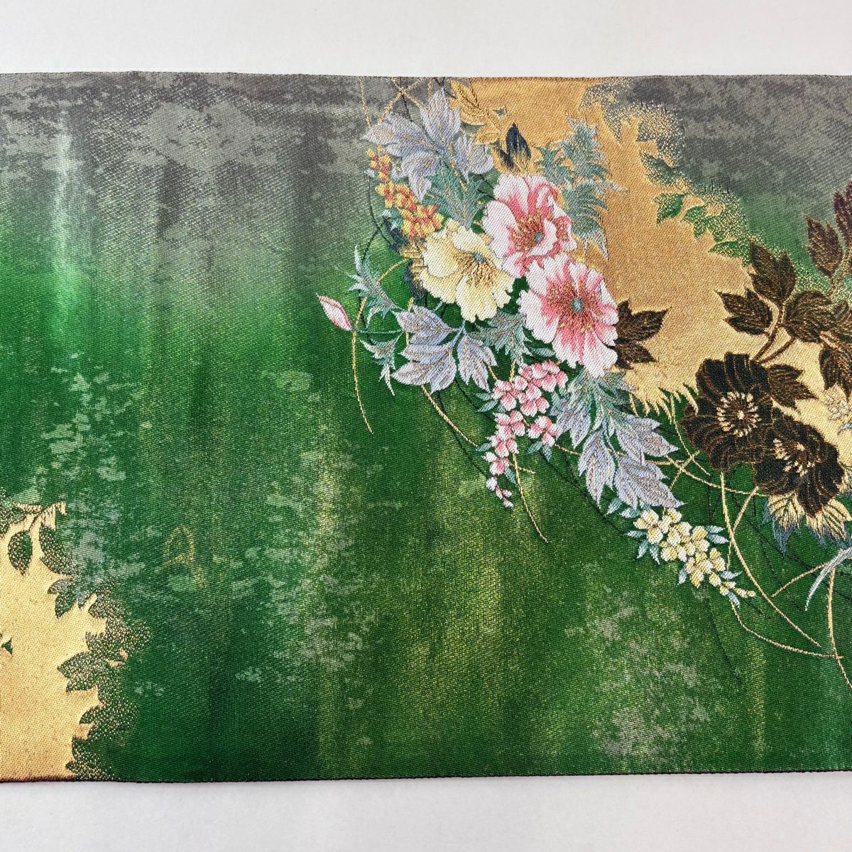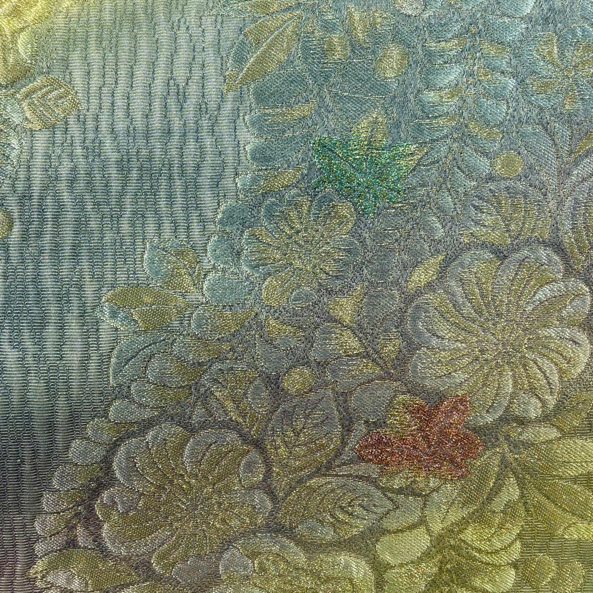 【美品】 袋帯 秀品 振袖向き 草花 金糸 箔 緑 六通 正絹