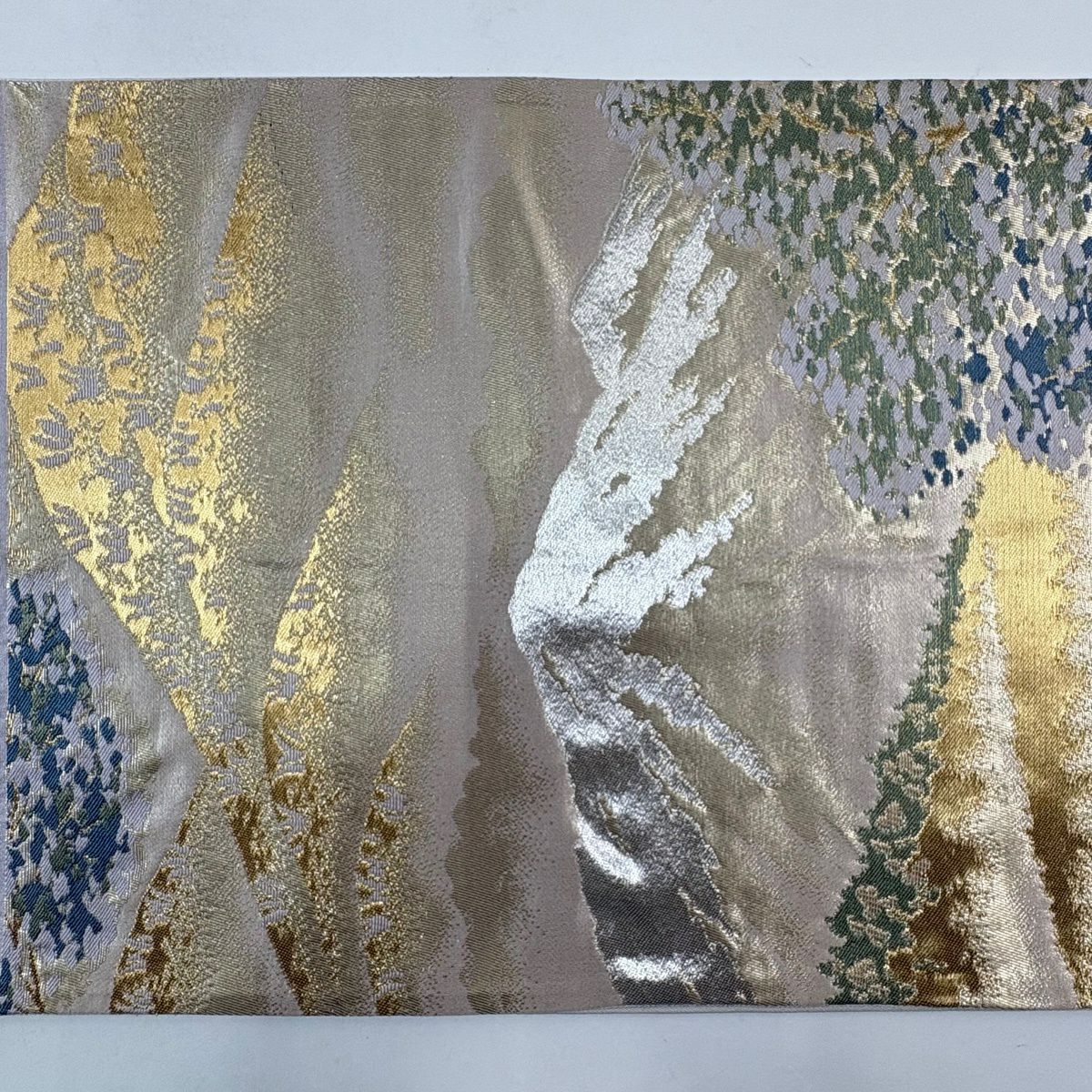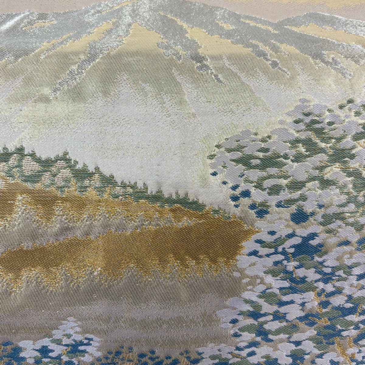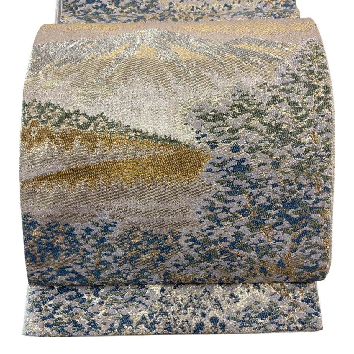 袋帯 秀品 山並み 樹木 金銀糸 箔 ベージュ 六通 正絹