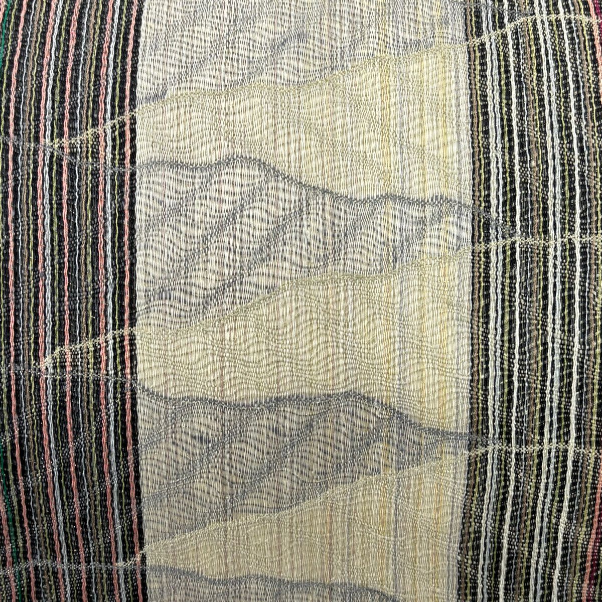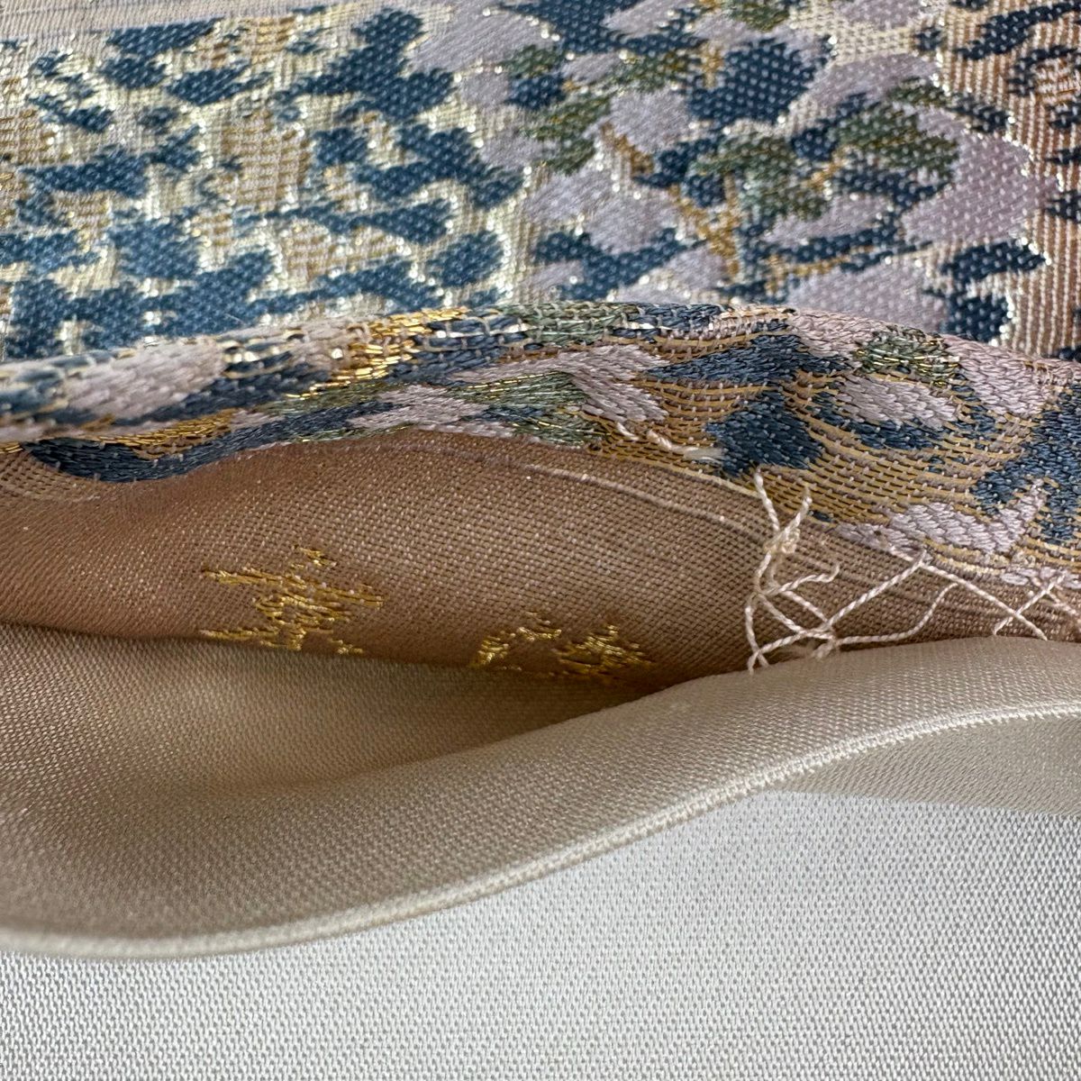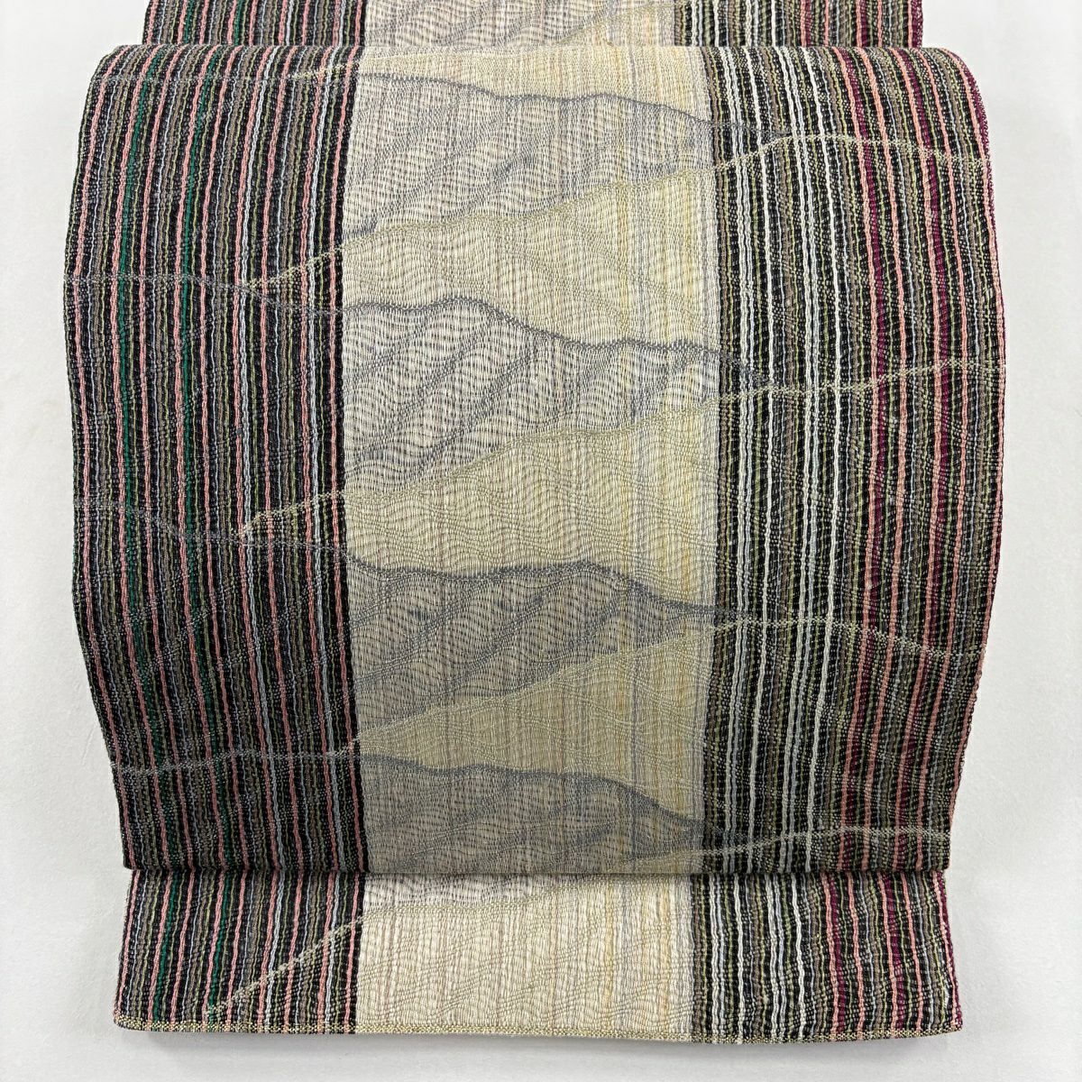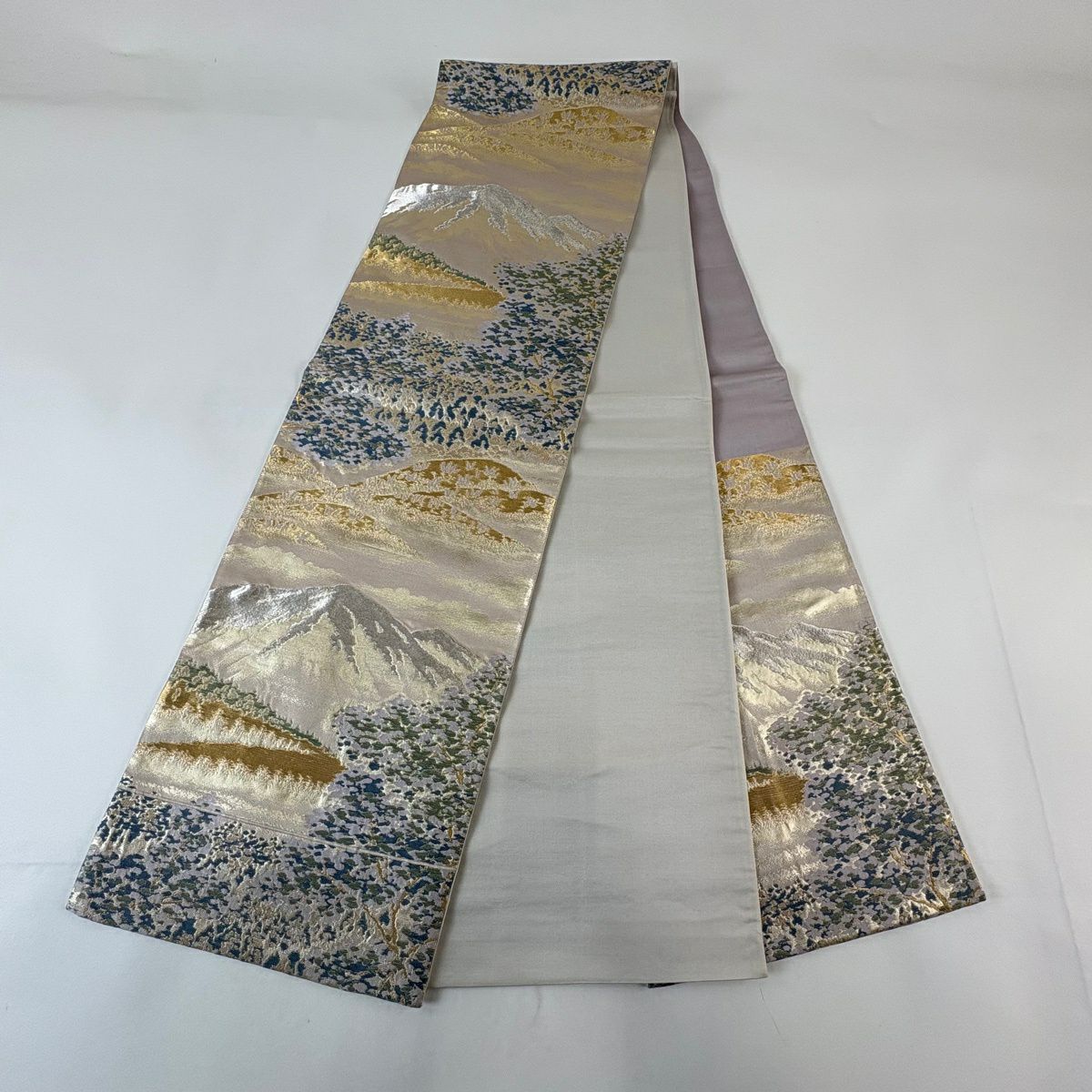袋帯 秀品 山並み 樹木 金銀糸 箔 ベージュ 六通 正絹