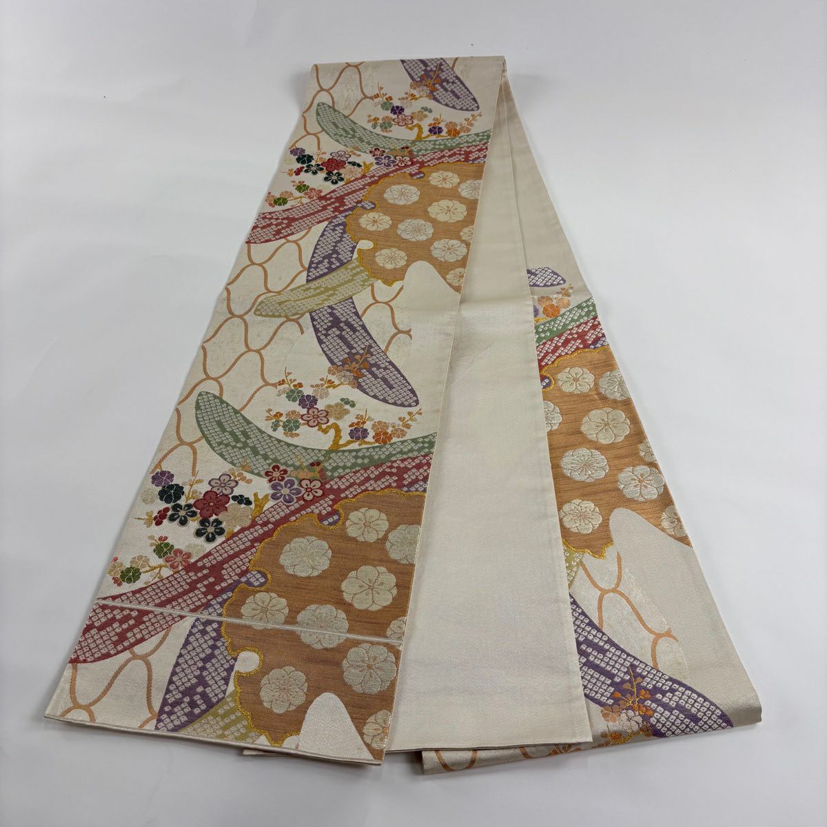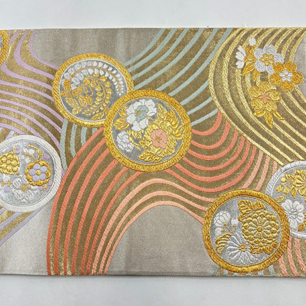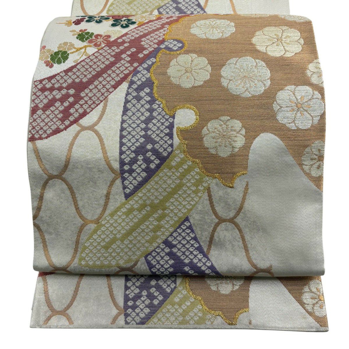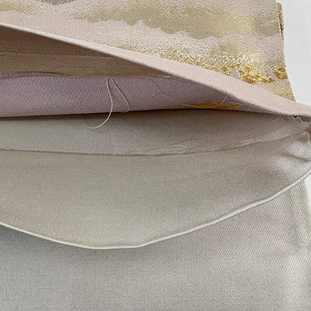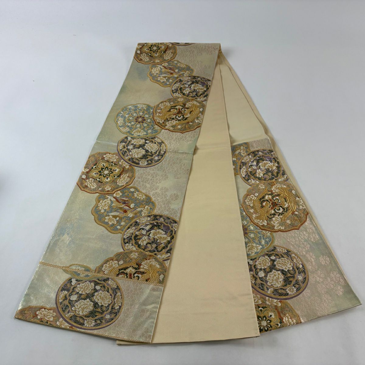【美品】 袋帯 秀品 華文 霞 金糸 ベージュ 六通 正絹
