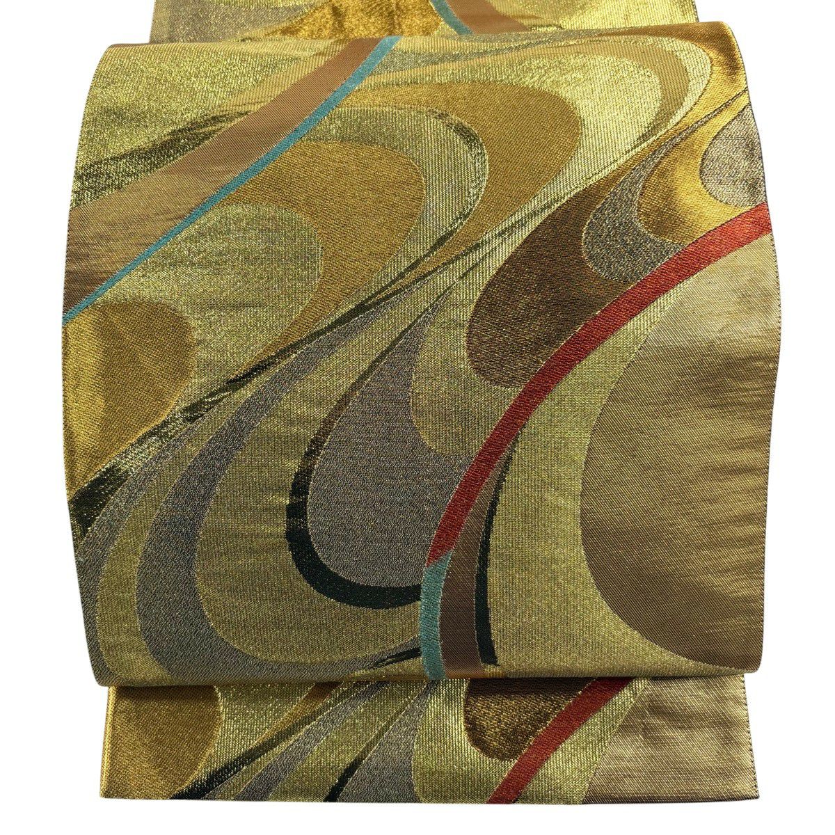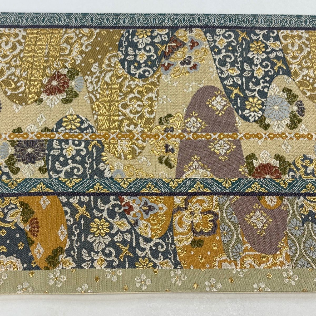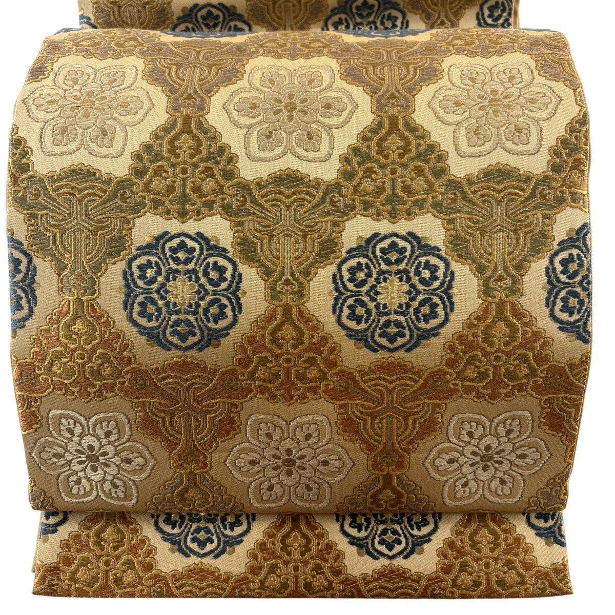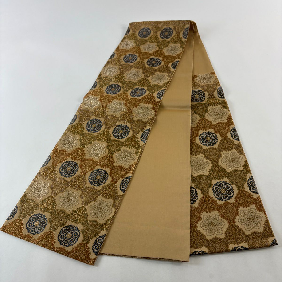 【美品】 袋帯 秀品 華文 幾何学模様 箔 黄土色 六通 正絹