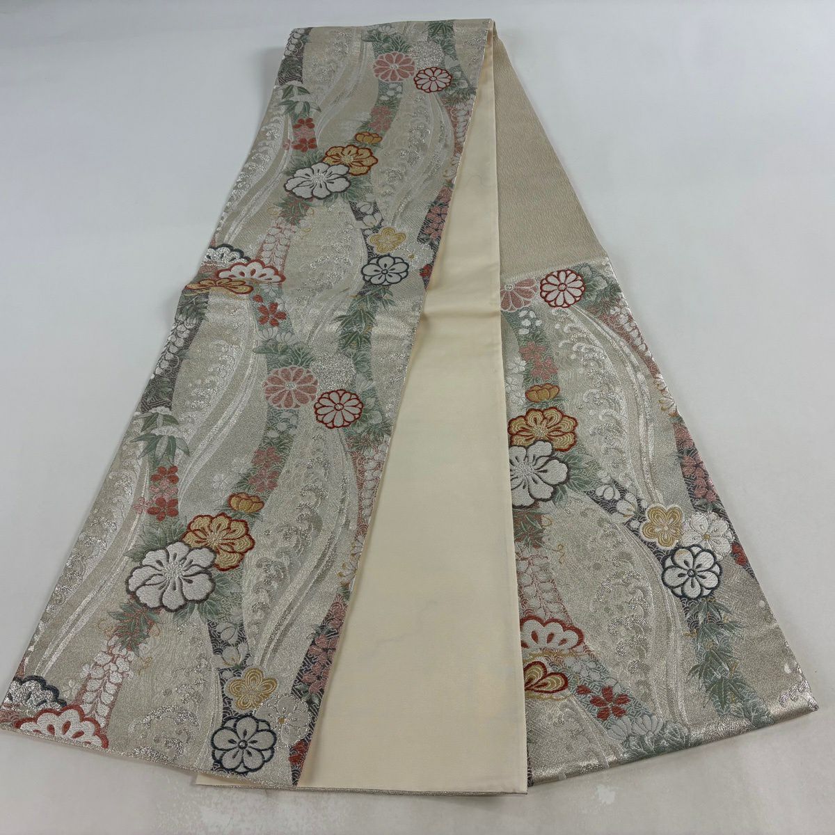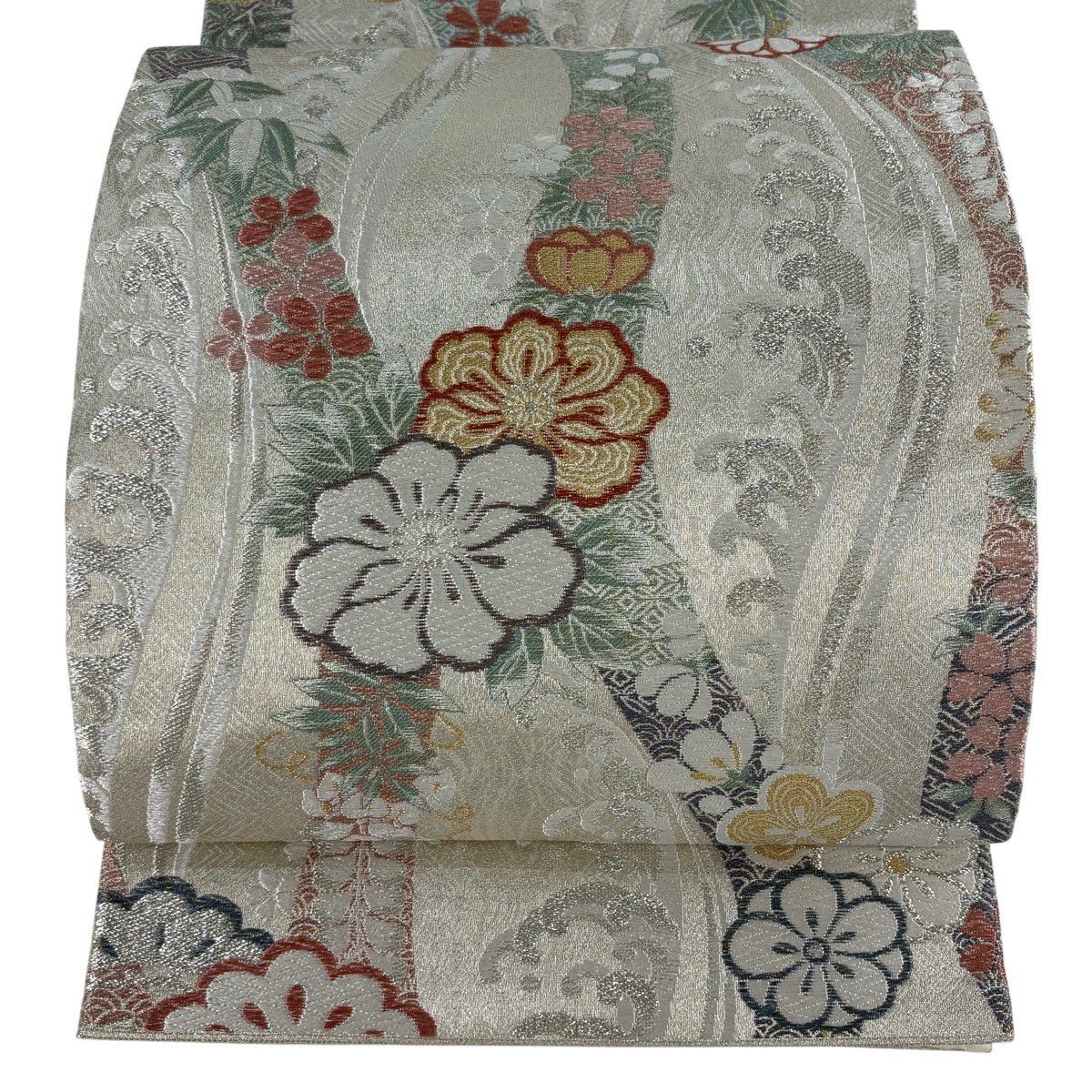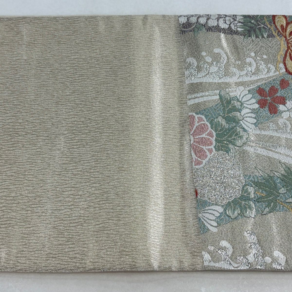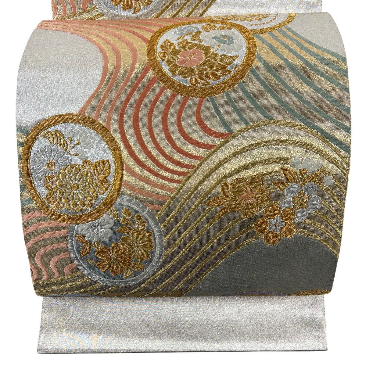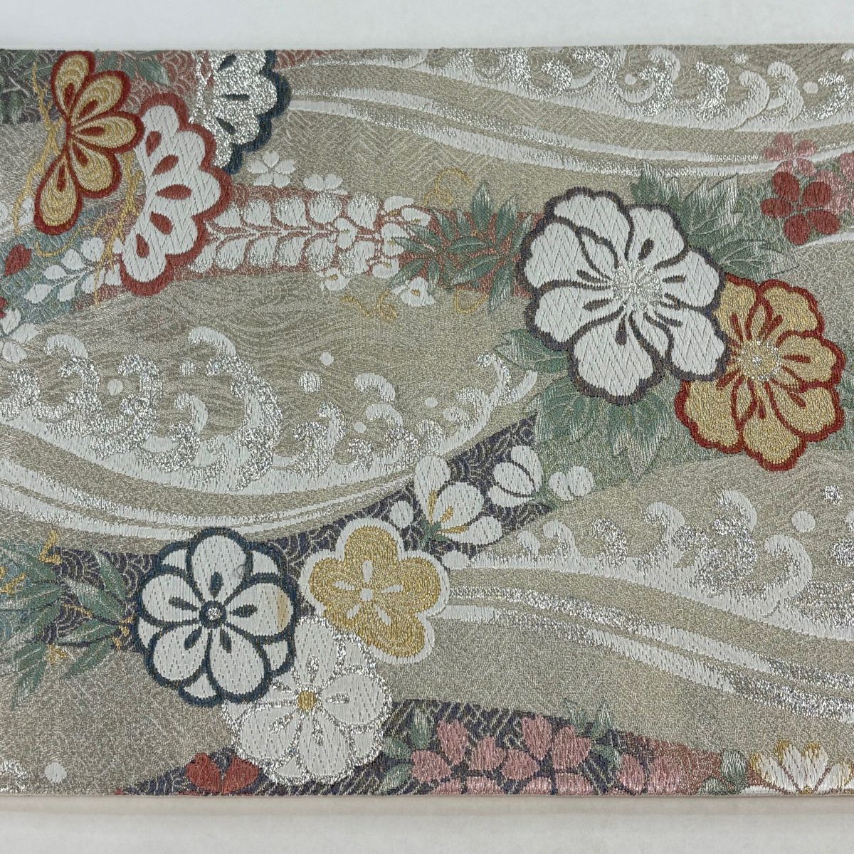 【美品】 袋帯 秀品 草花 波頭 金銀糸 箔 灰白 六通 正絹