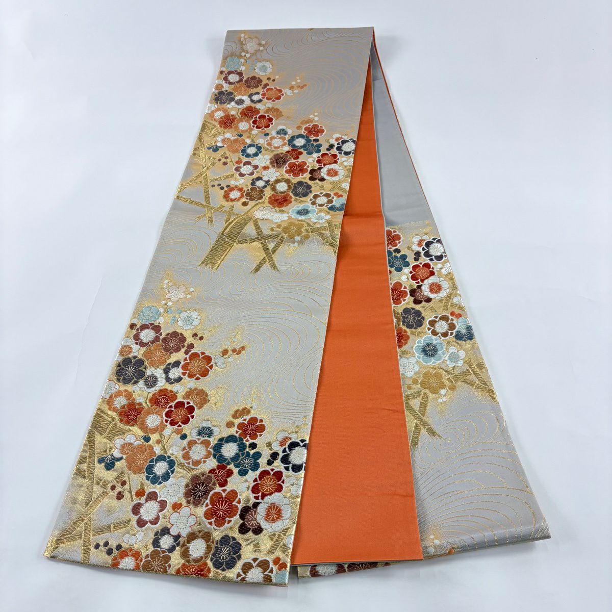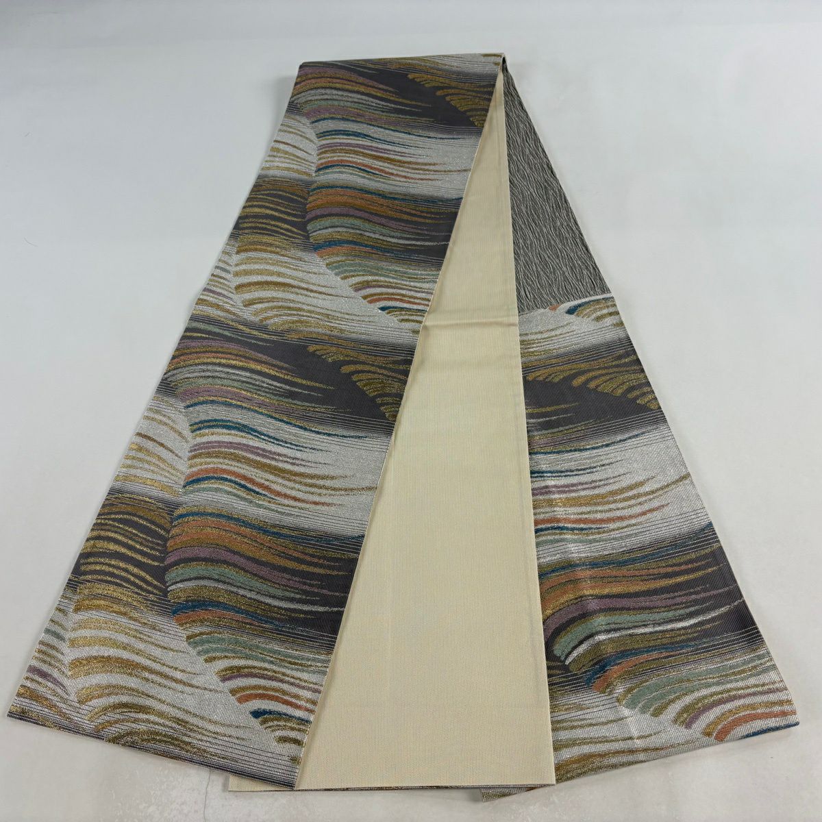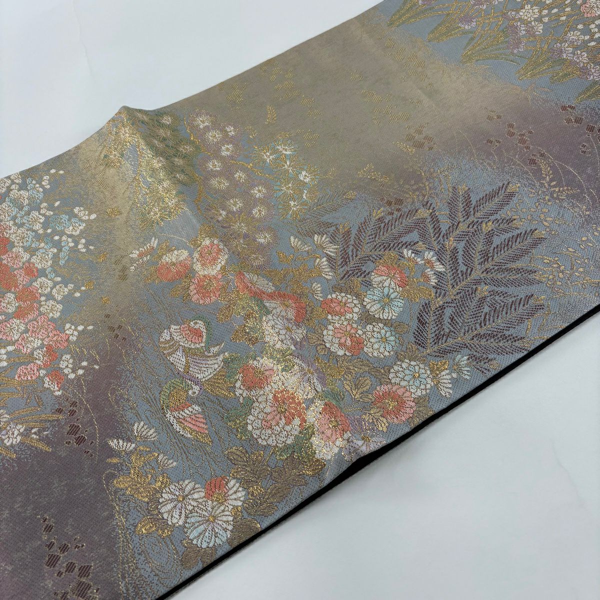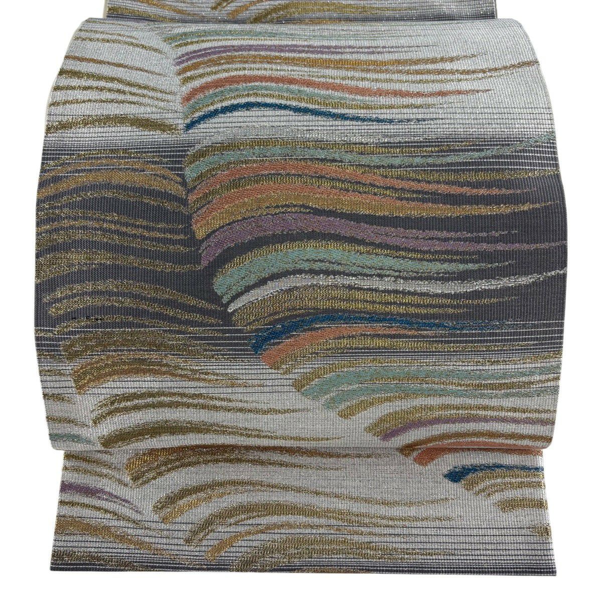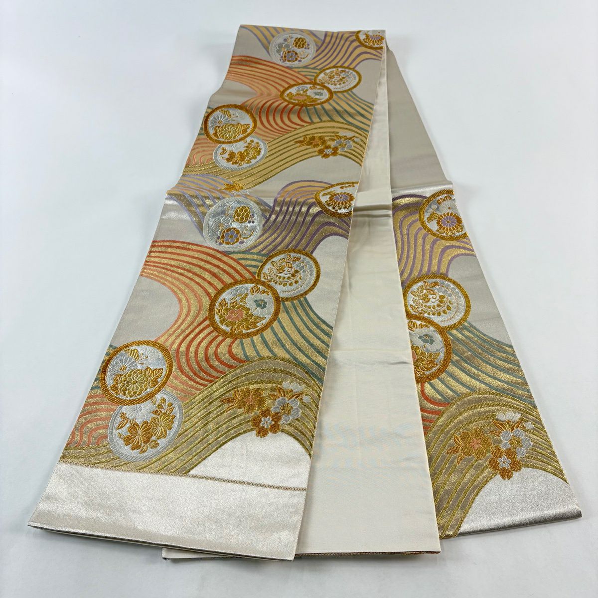 【美品】 袋帯 秀品 草花 波頭 金銀糸 箔 灰白 六通 正絹