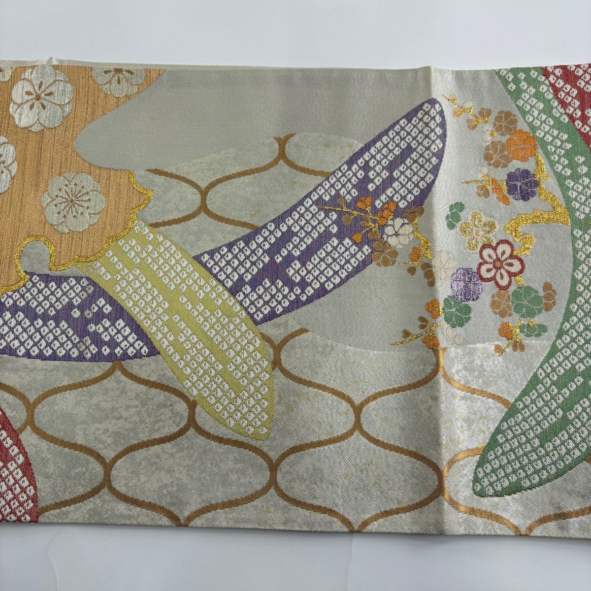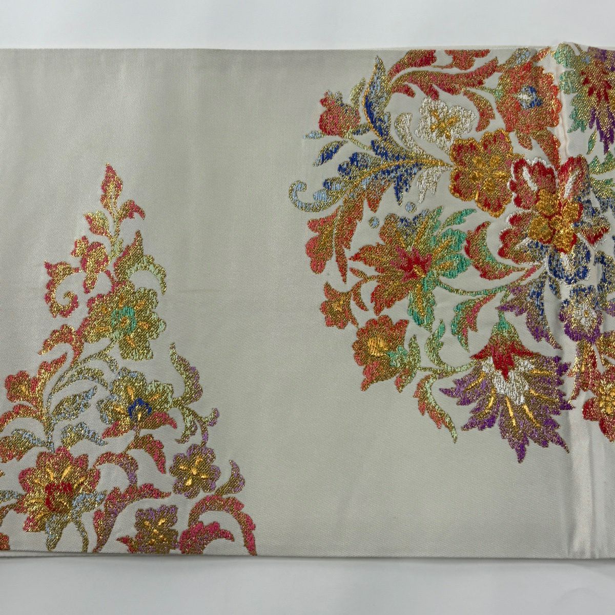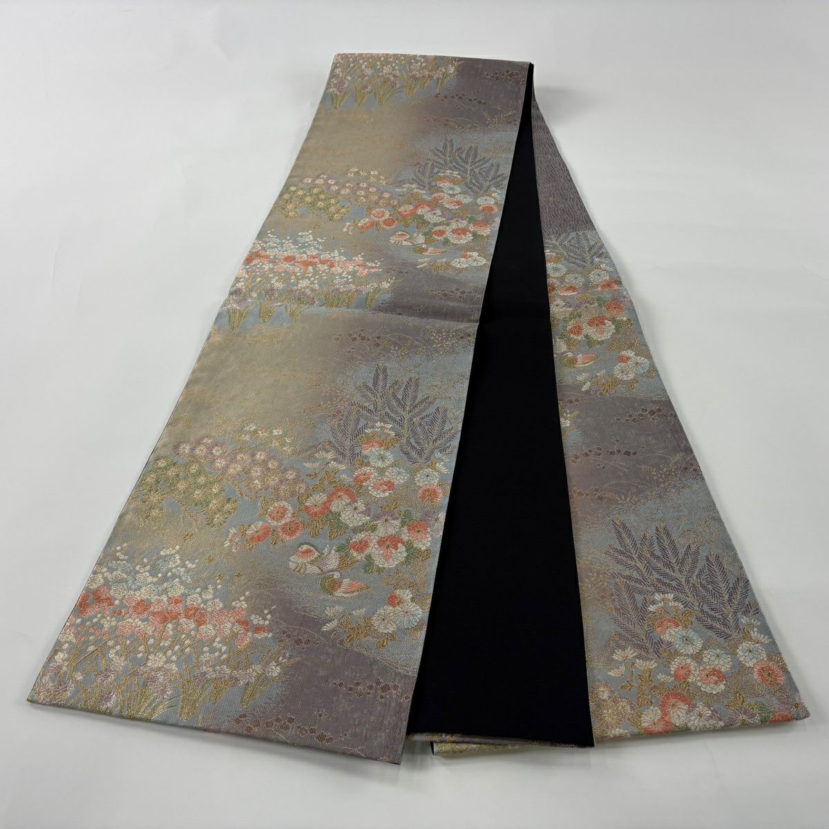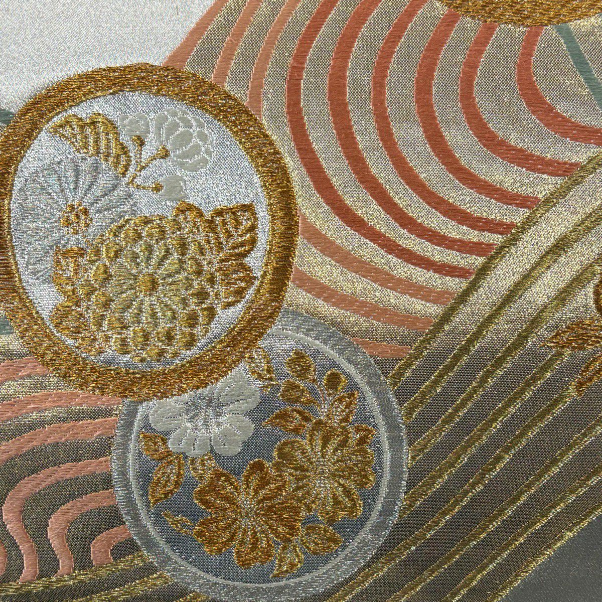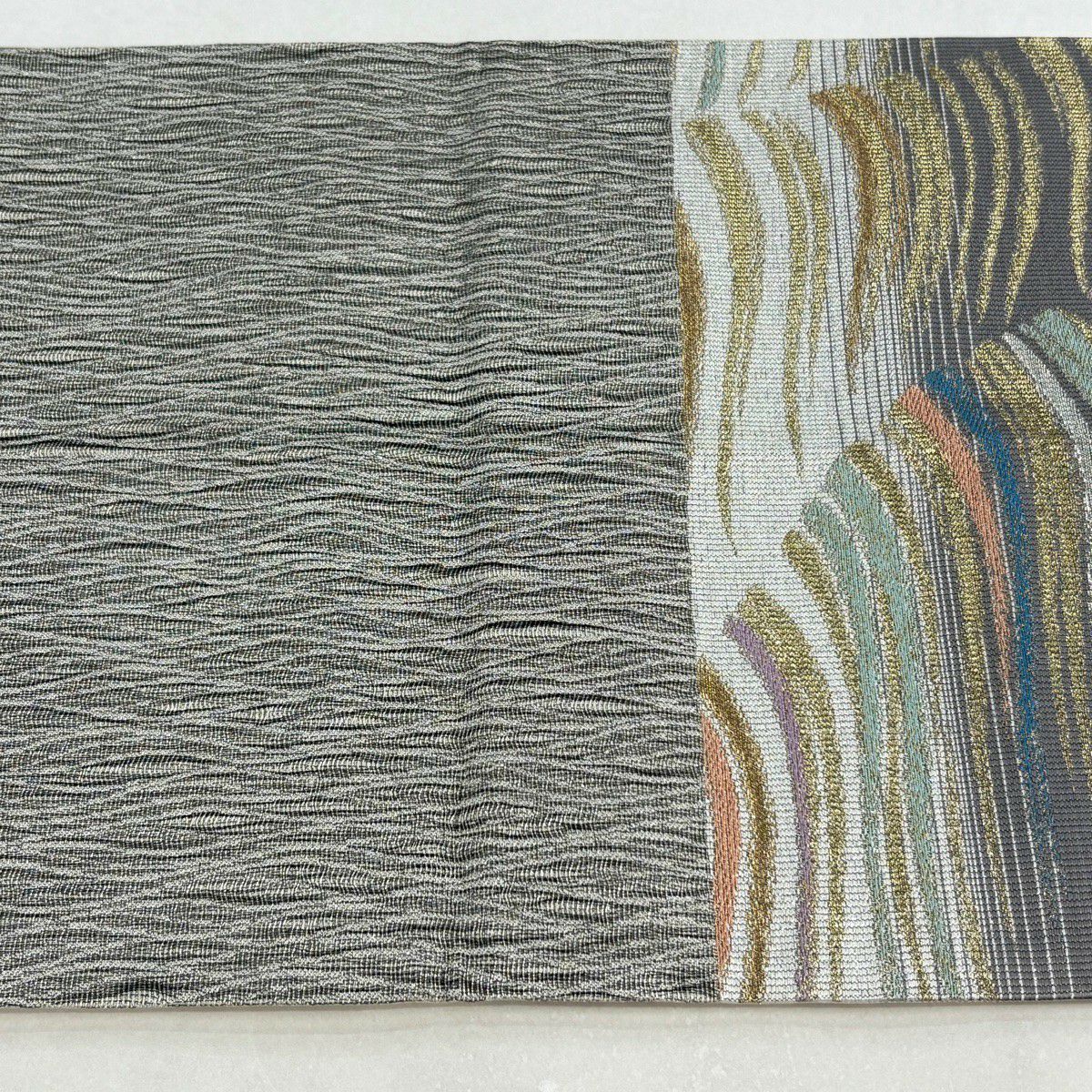 【美品】 袋帯 秀品 草花 波頭 金銀糸 箔 灰白 六通 正絹