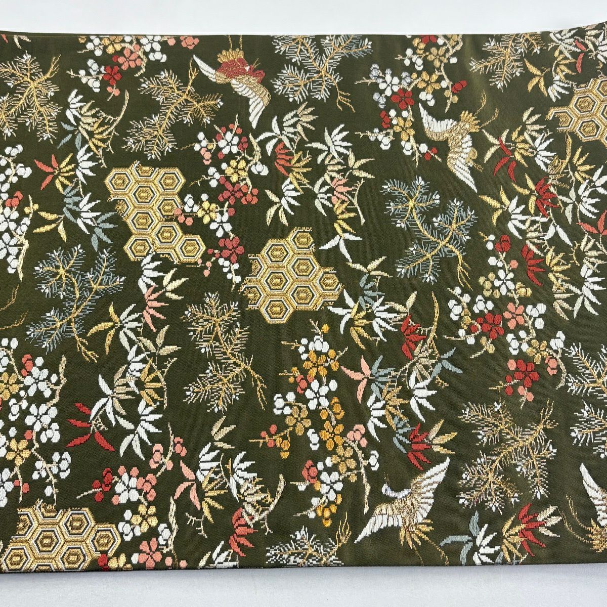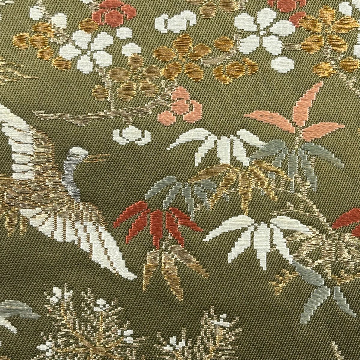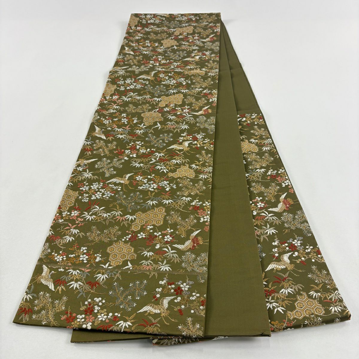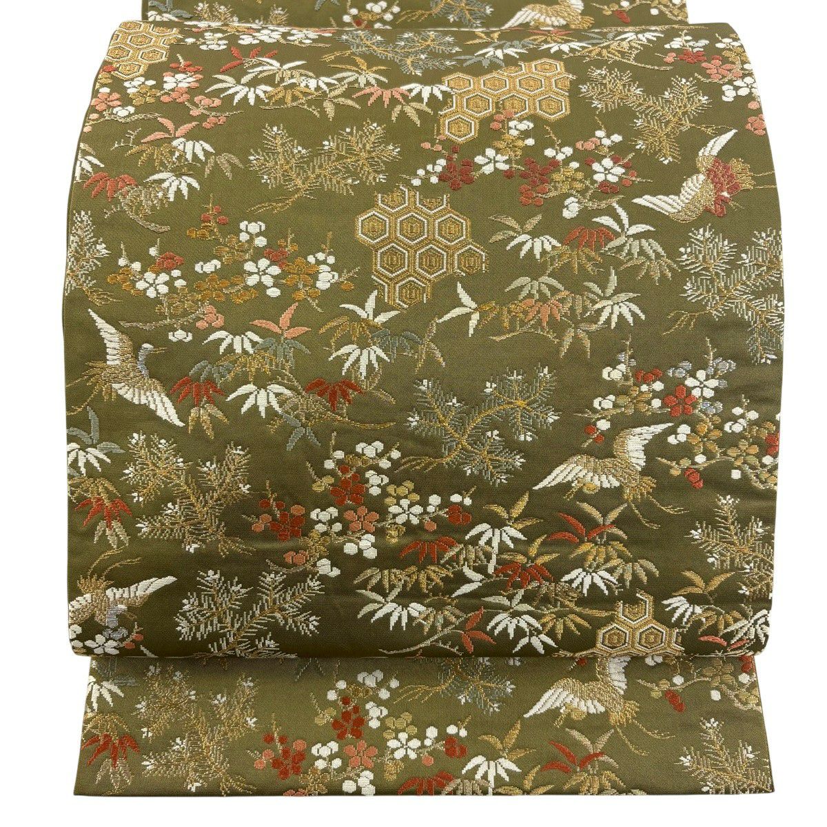 【美品】 袋帯 秀品 松竹梅 鶴 金銀糸 箔 鶯色 六通 正絹