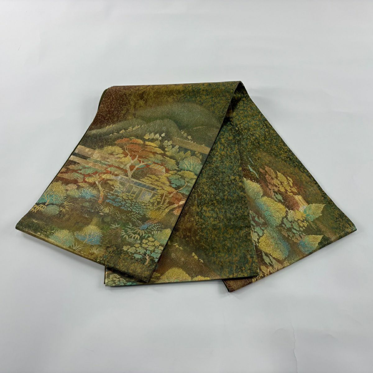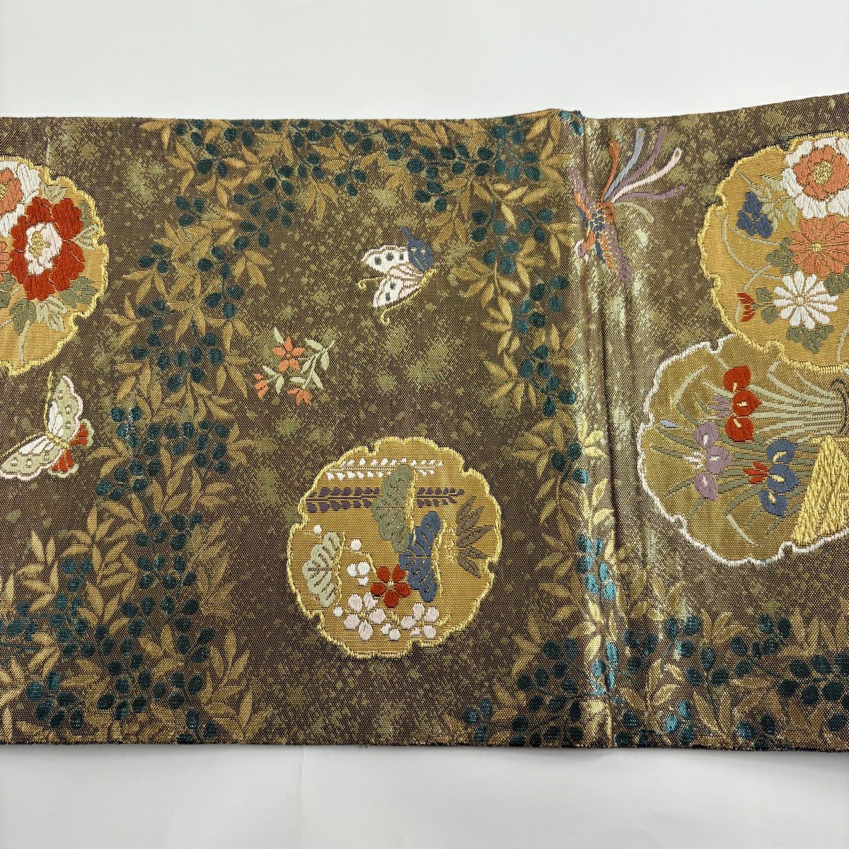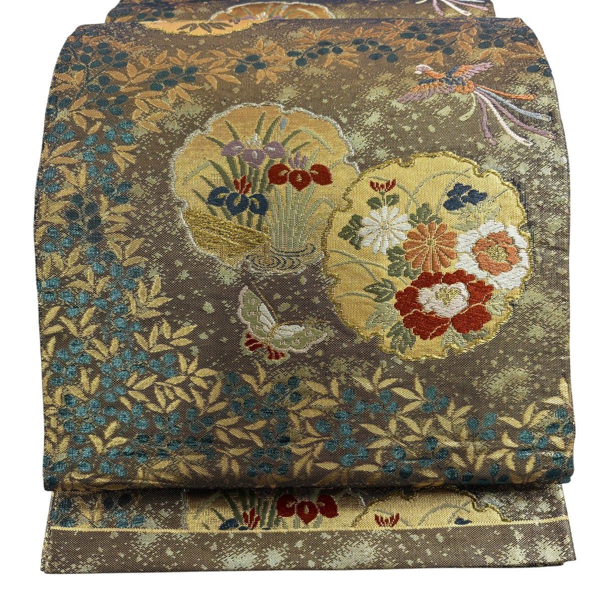 【美品】 袋帯 秀品 草花 疋田 金糸 箔 茶緑色 六通 正絹
