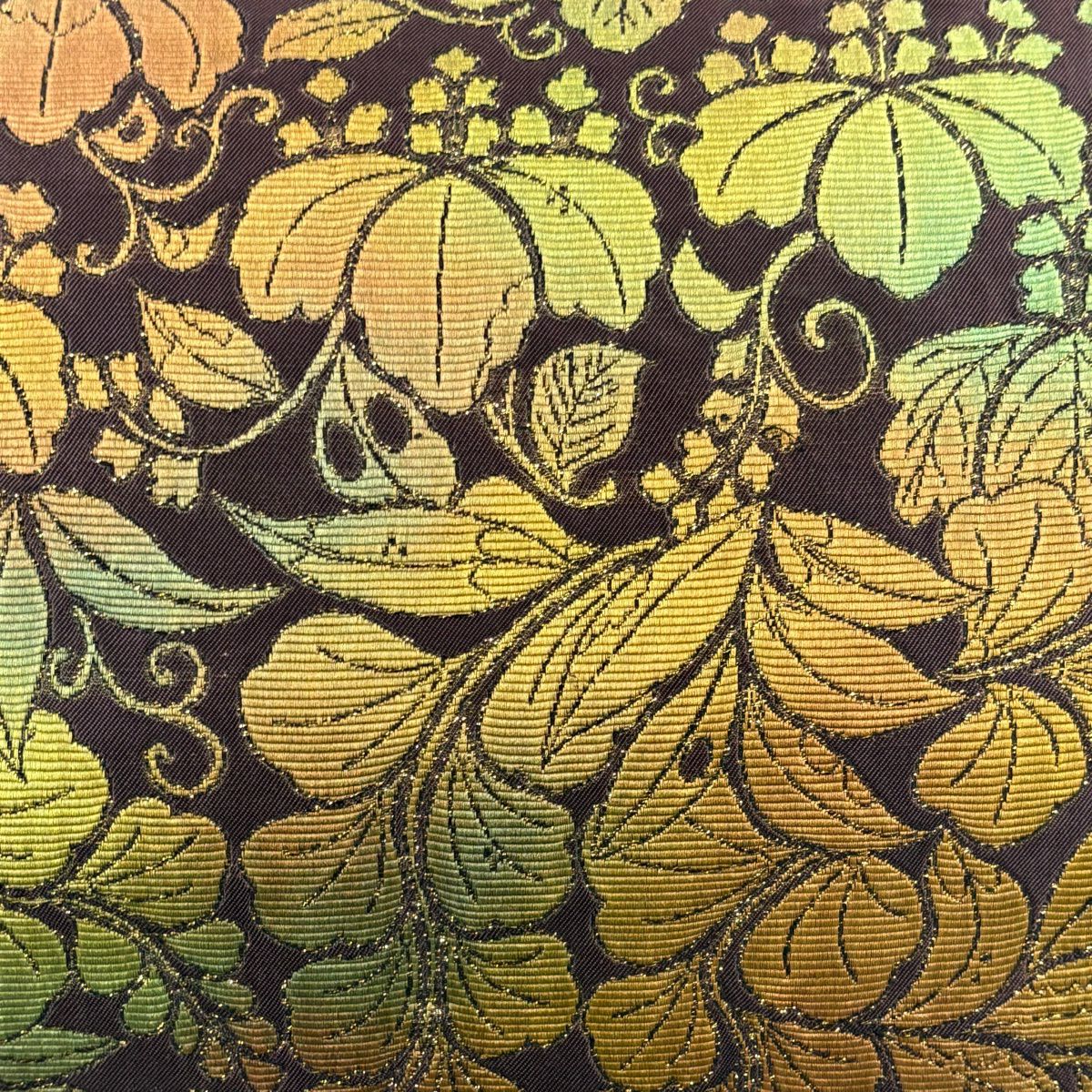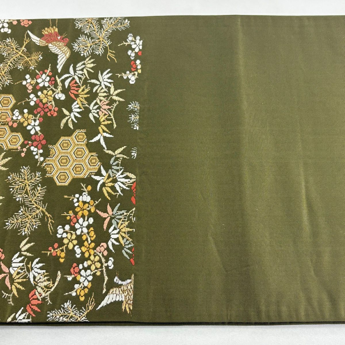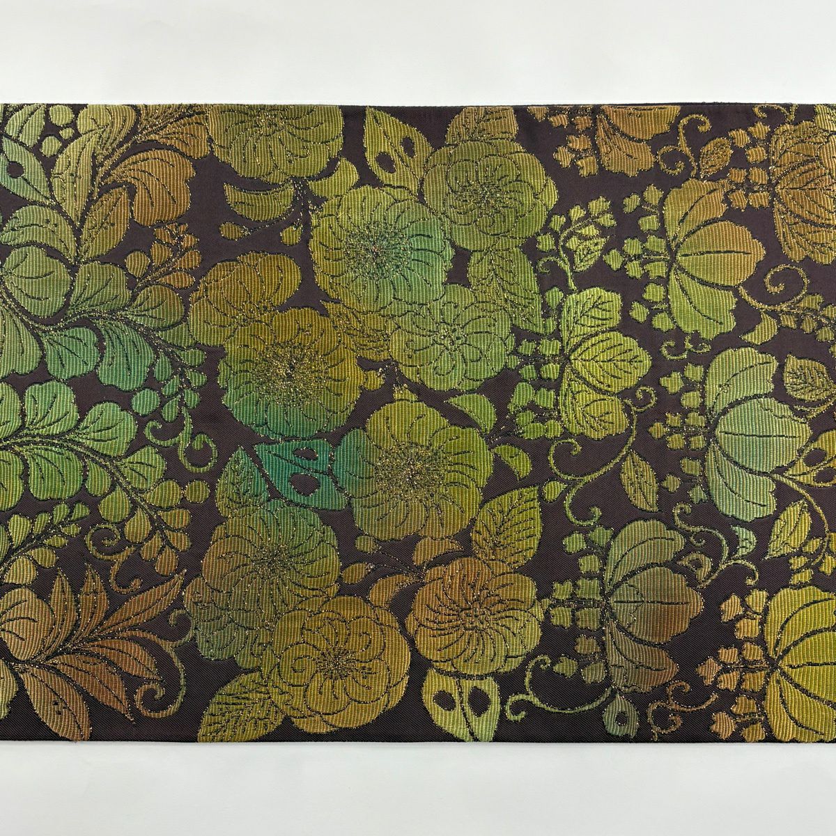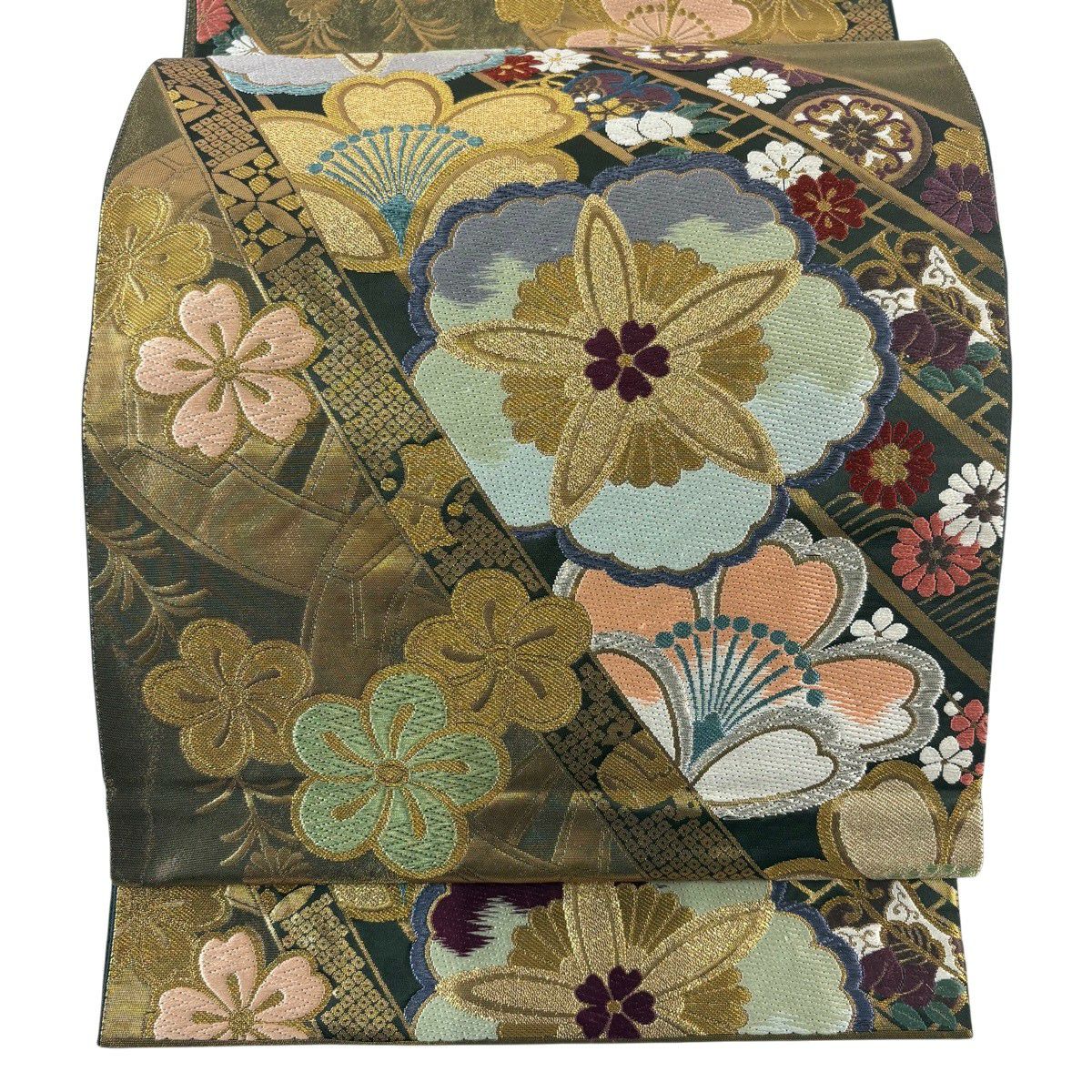 【美品】 袋帯 秀品 草花 疋田 金糸 箔 茶緑色 六通 正絹
