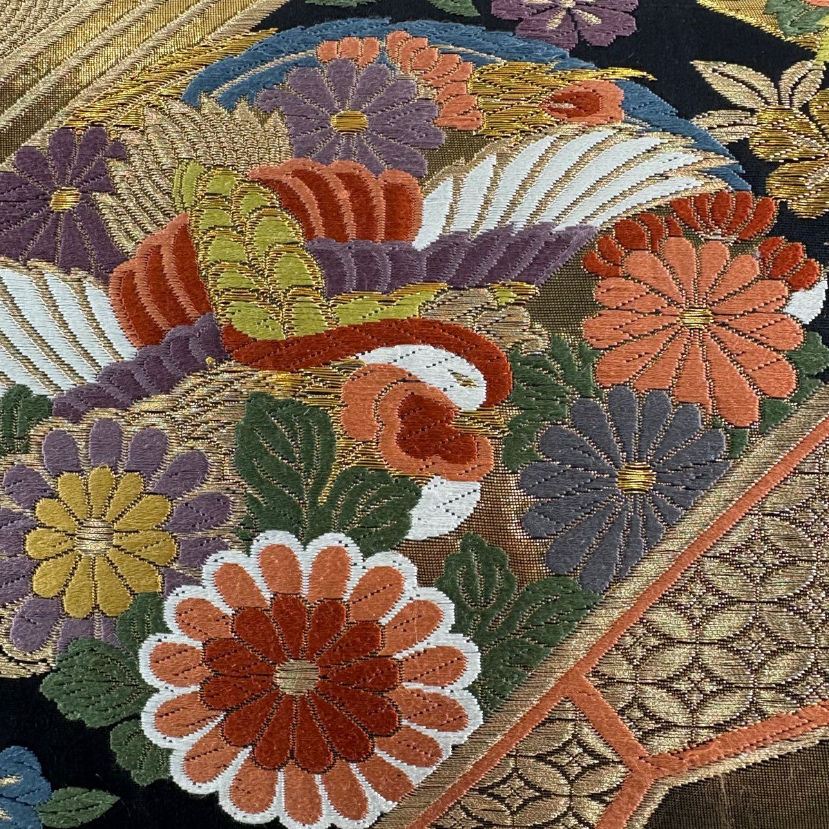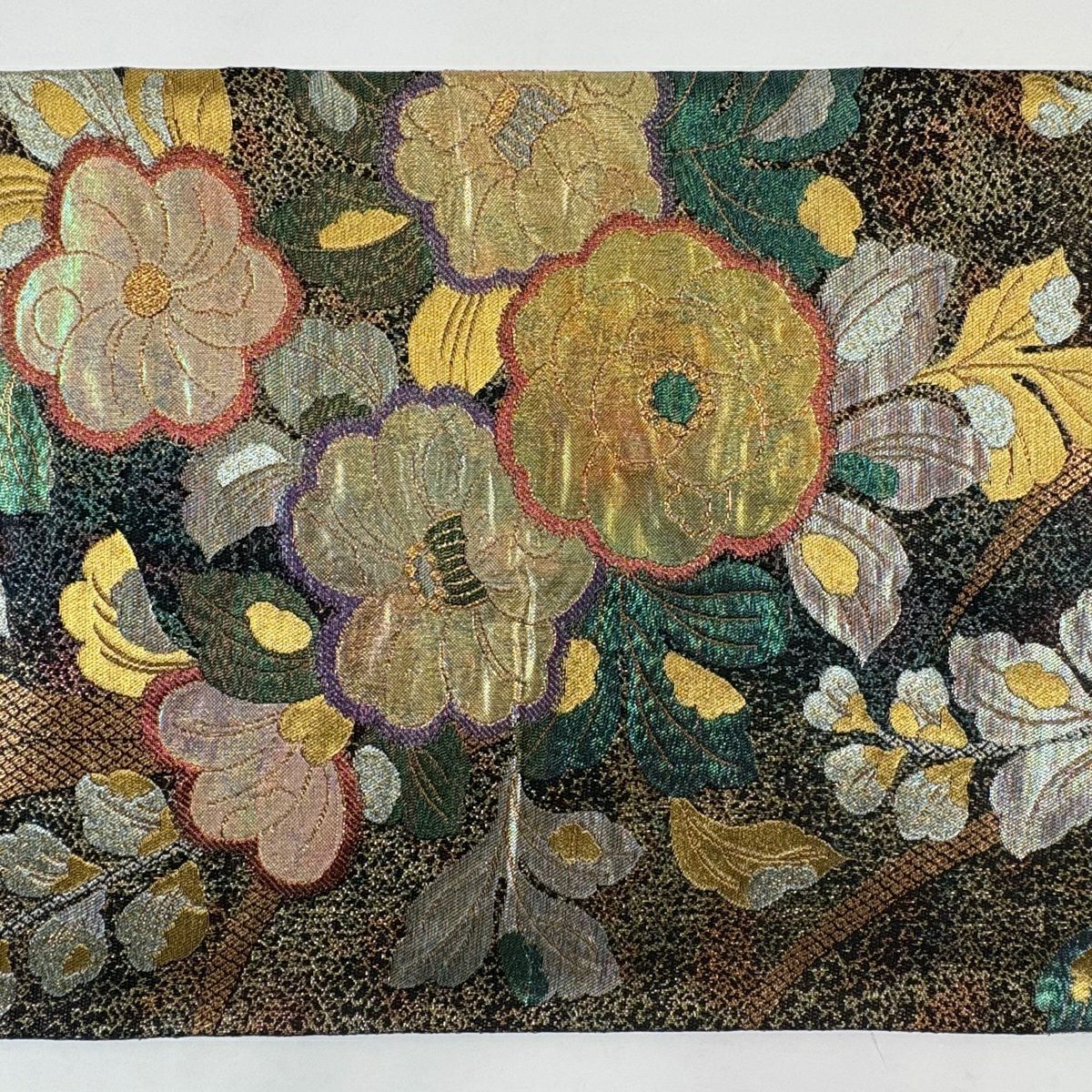 【美品】 袋帯 秀品 花鳥 片輪車 金糸 唐織 黒 六通 正絹