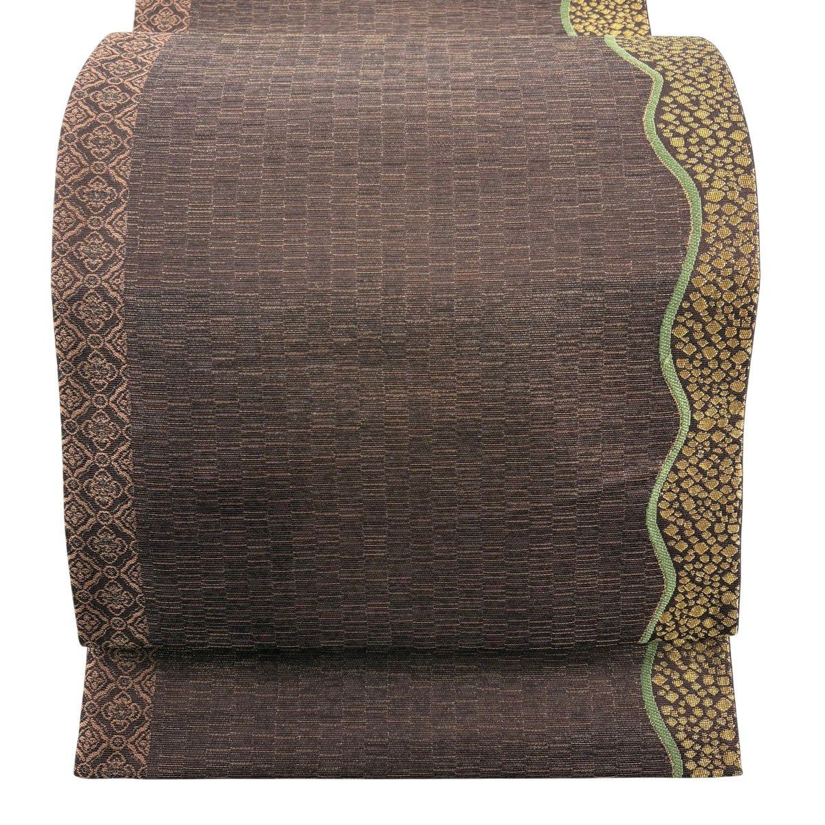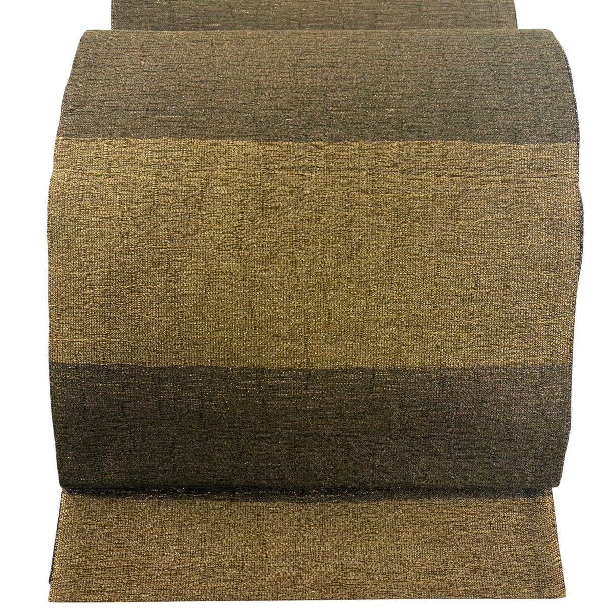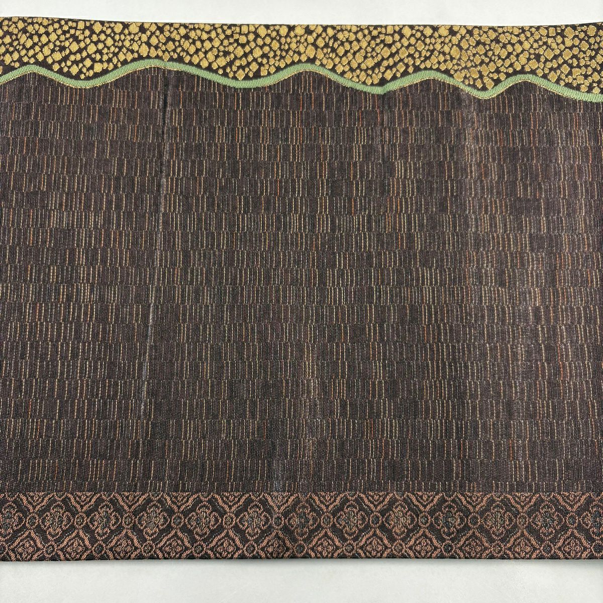 【美品】 袋帯 秀品 段縞 幾何学模様 箔 茶緑色 全通 正絹