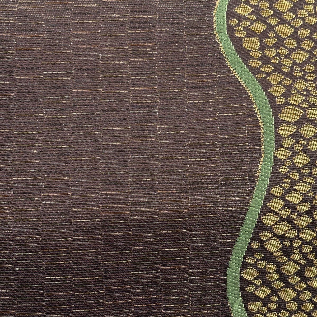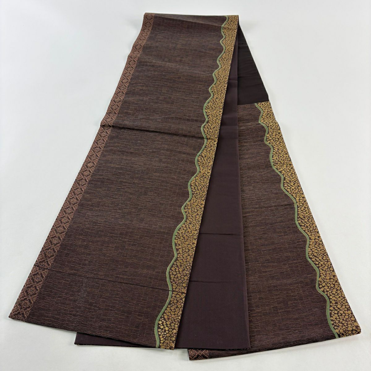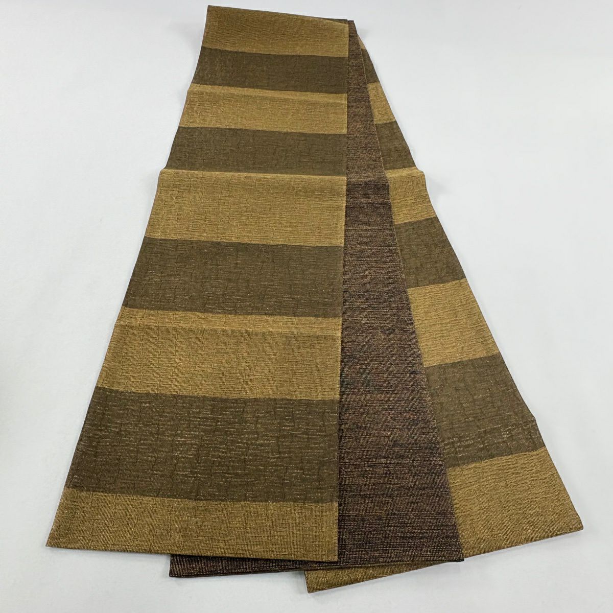 【美品】 袋帯 秀品 段縞 幾何学模様 箔 茶緑色 全通 正絹