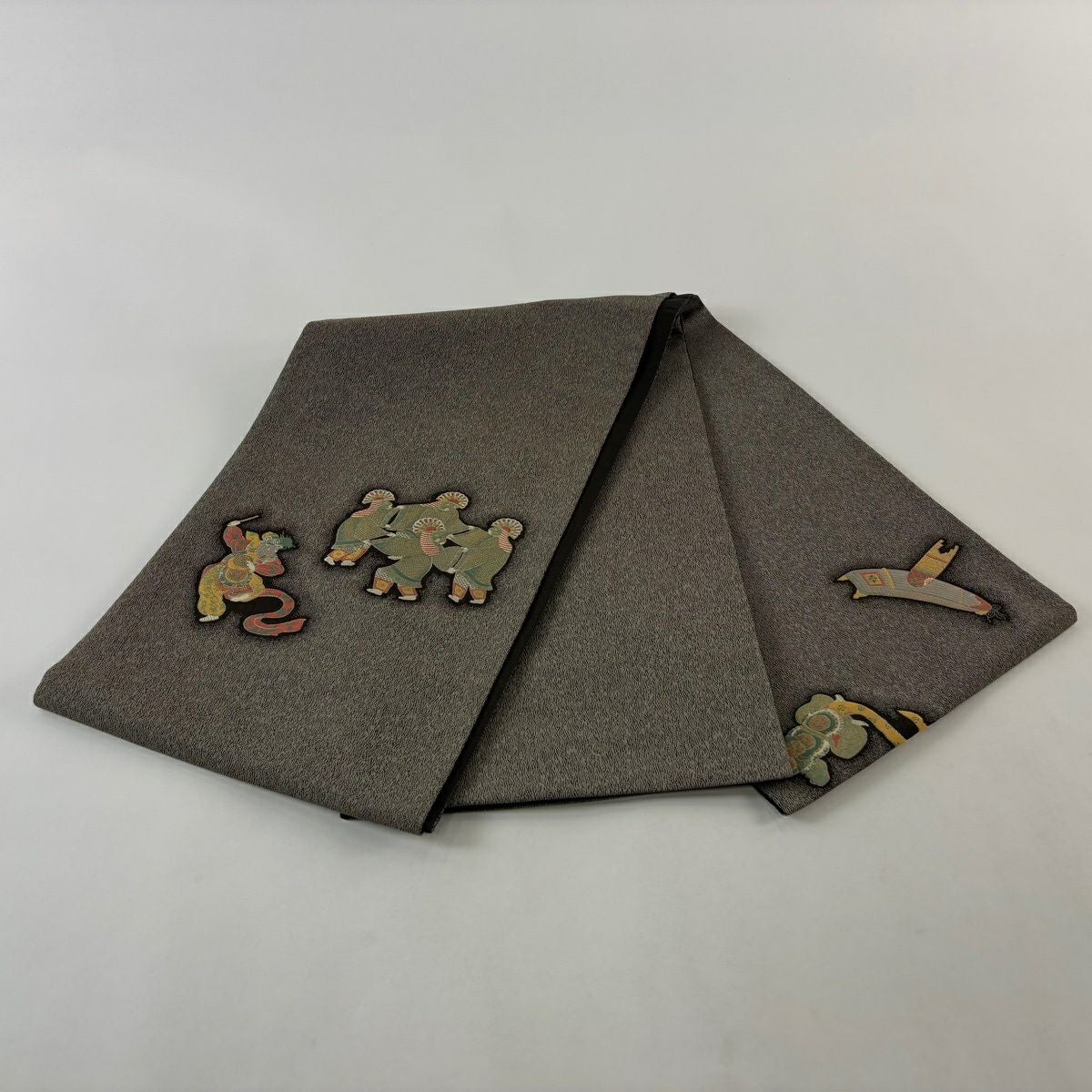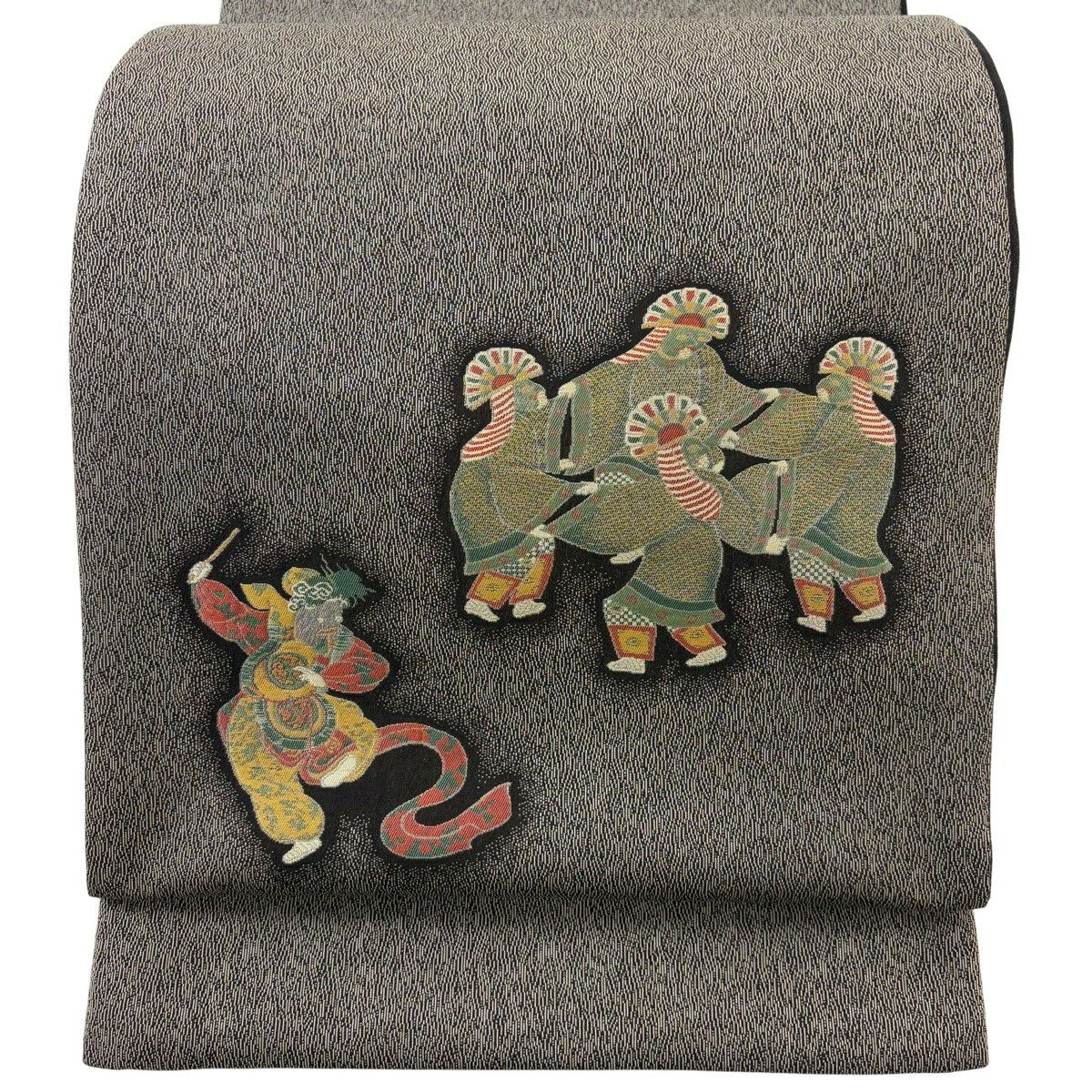 【美品】 袋帯 秀品 舞踊 和楽器 銀糸 灰茶 お太鼓柄 正絹