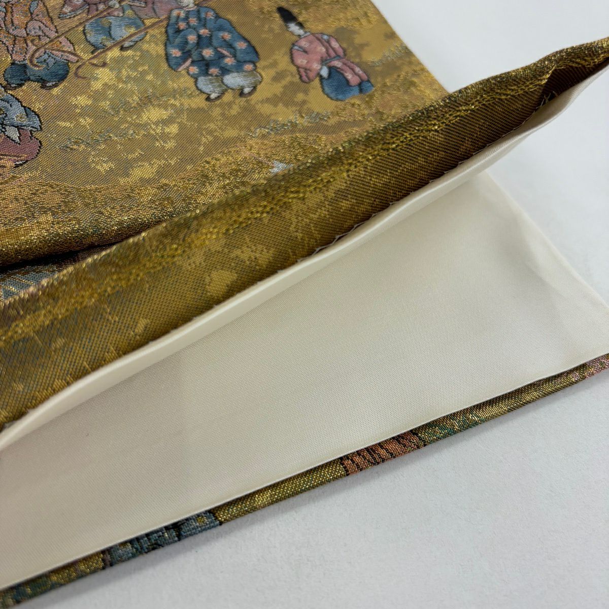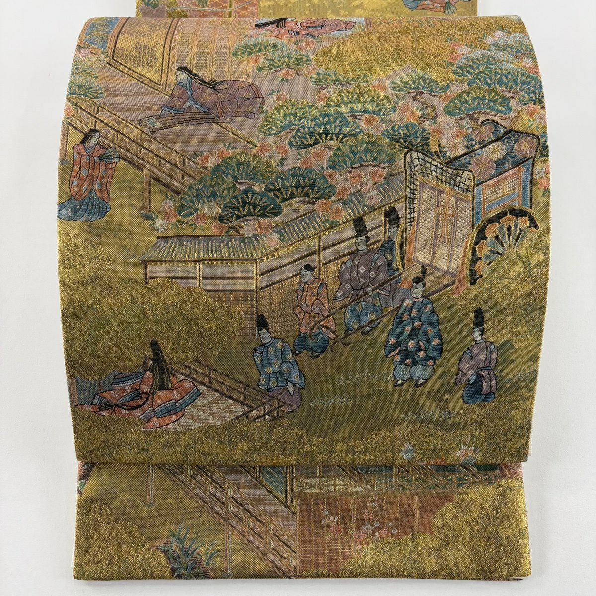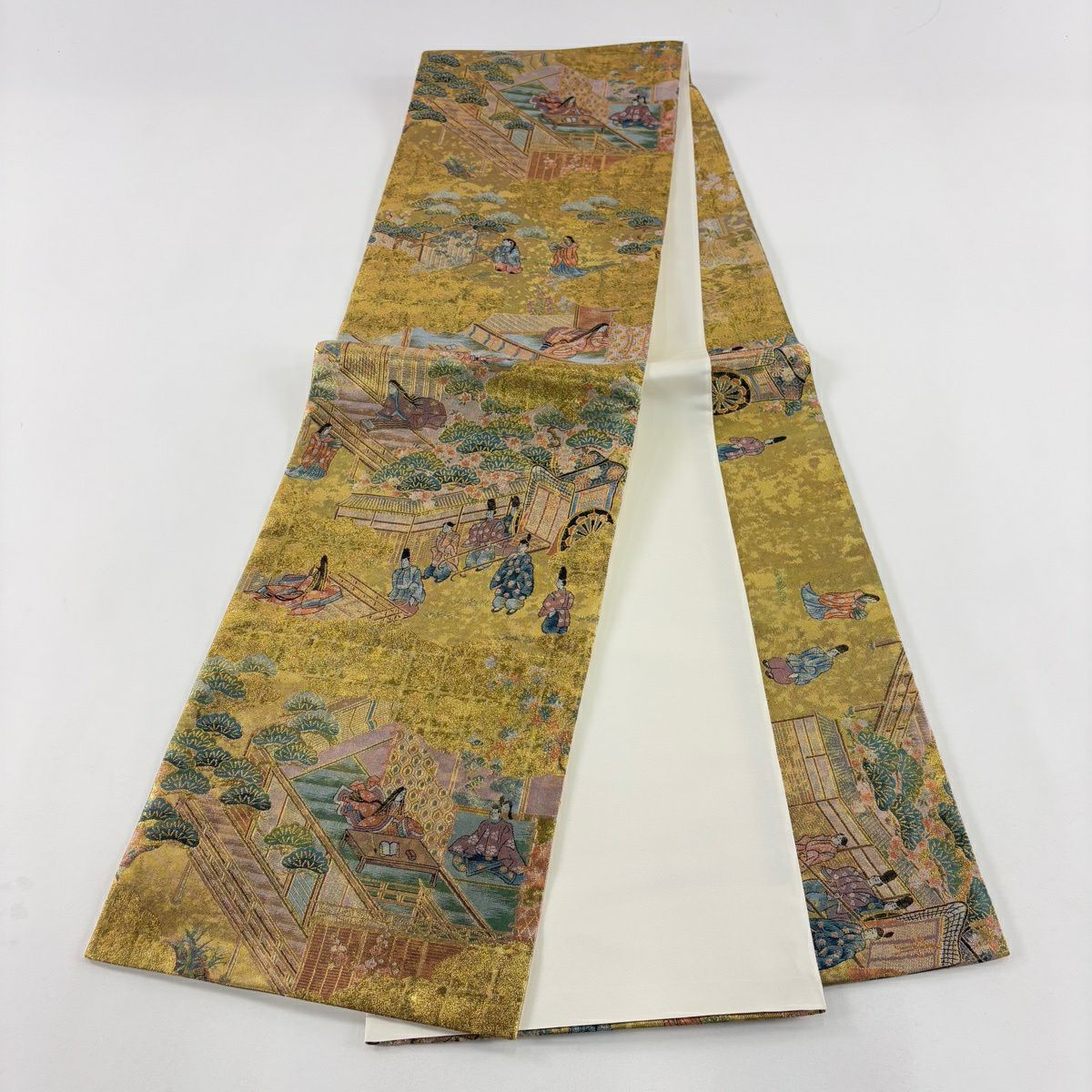 【美品】 袋帯 秀品 御所風景 人物 箔 金色 お太鼓柄 正絹