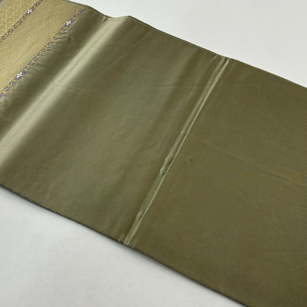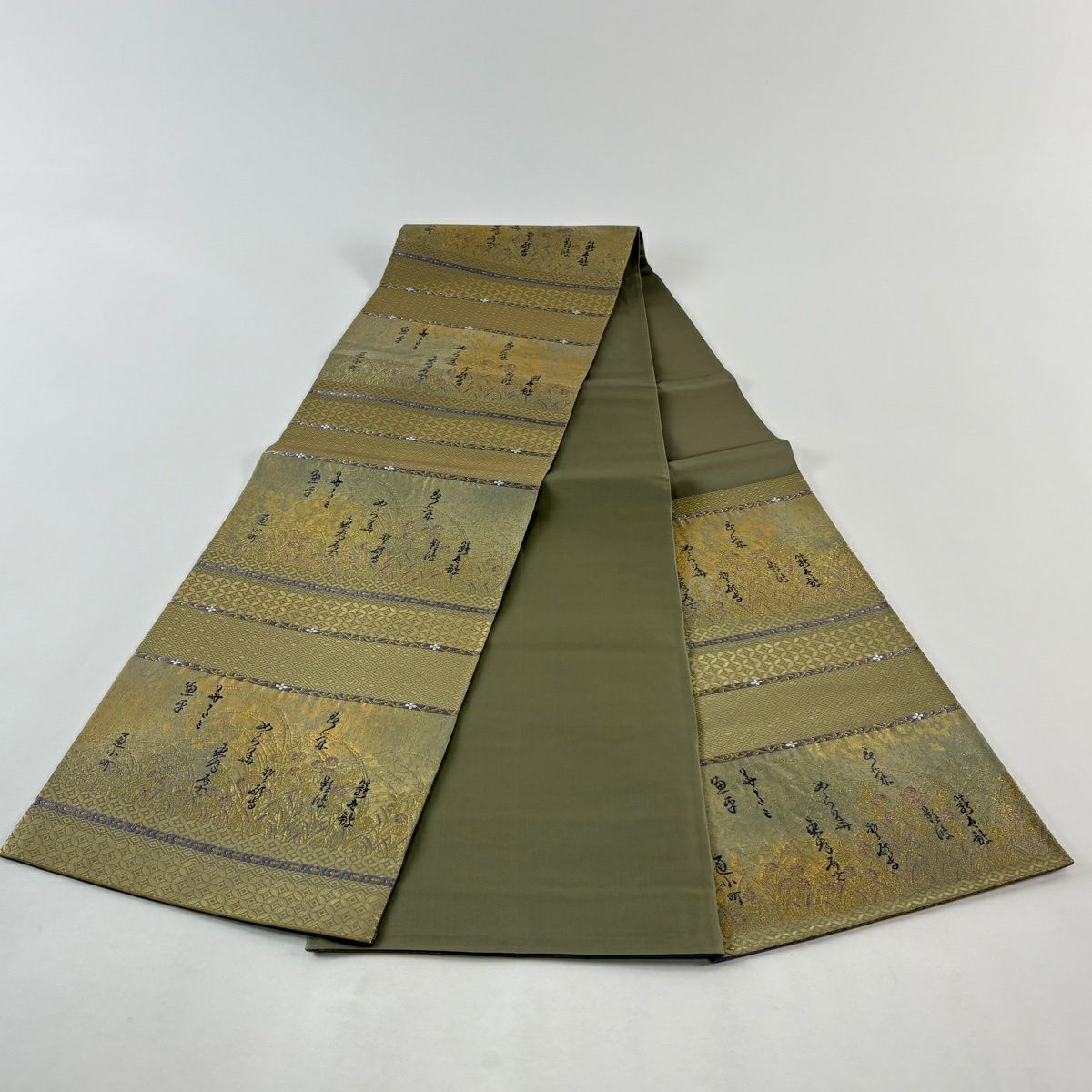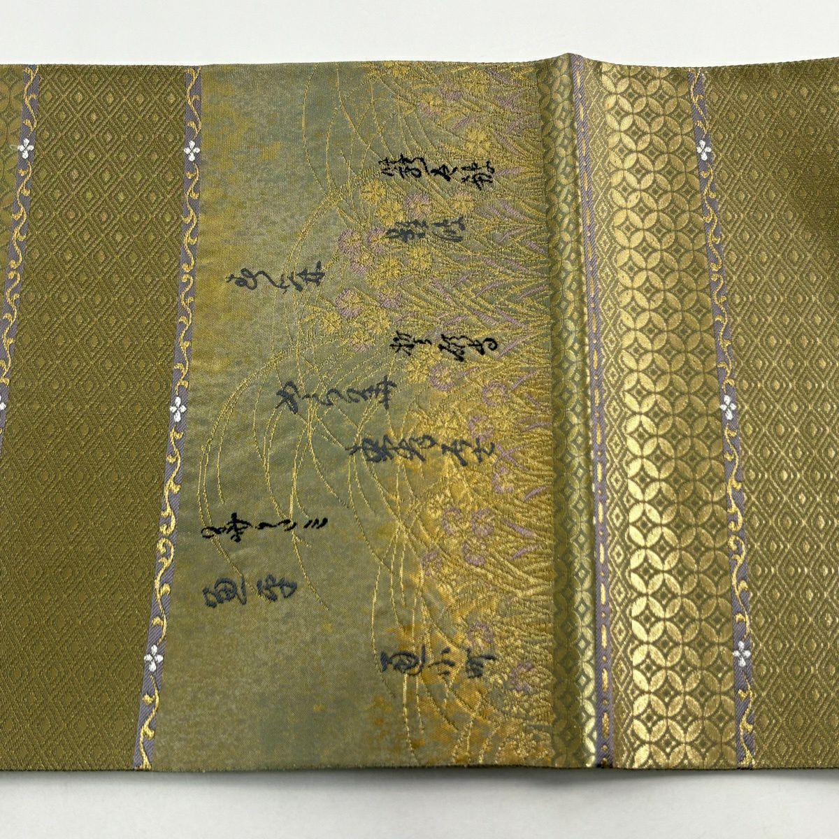 【美品】 袋帯 秀品 文字文 草花 箔 刺繍 鶯色 六通 正絹