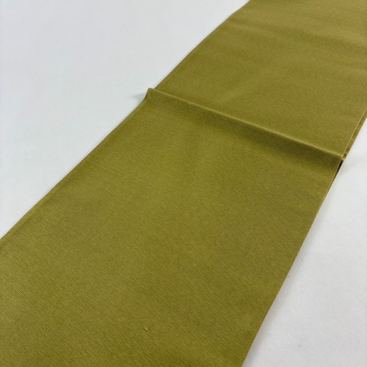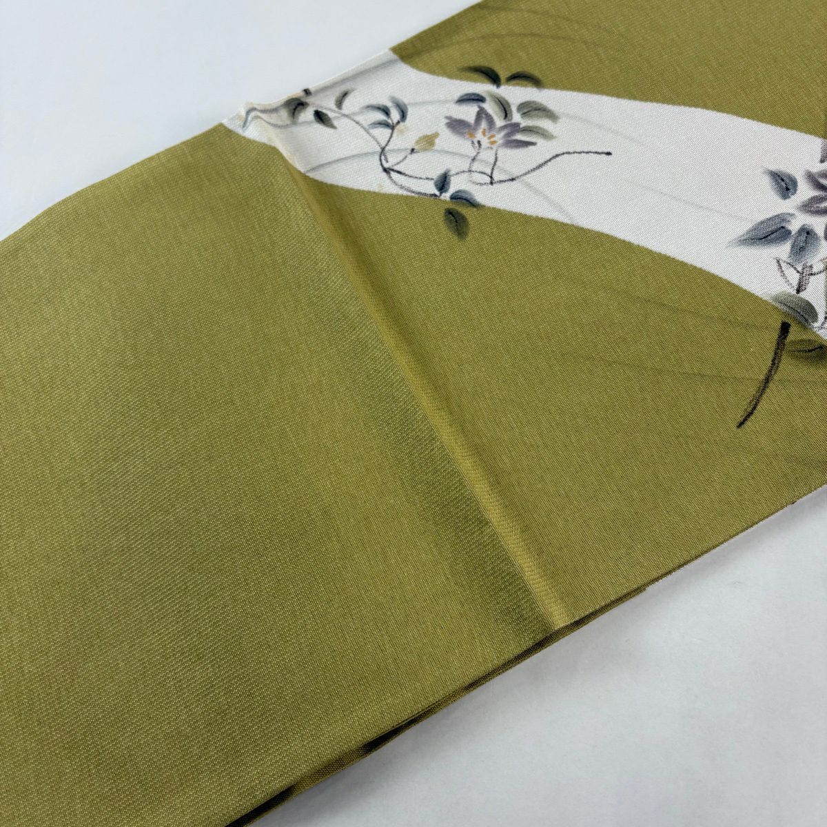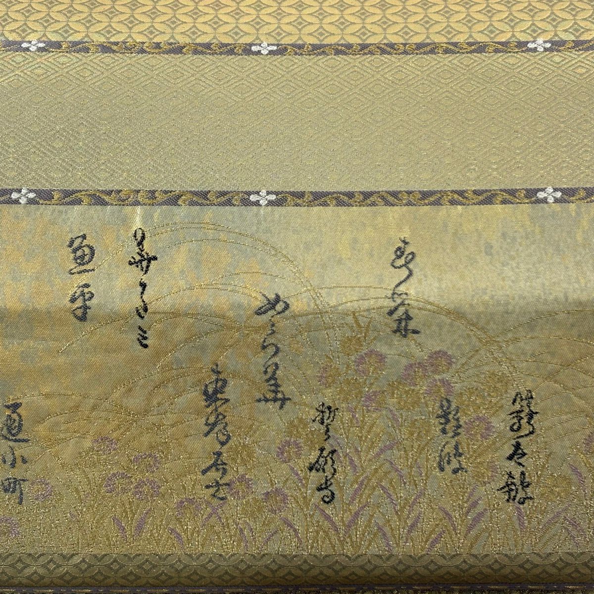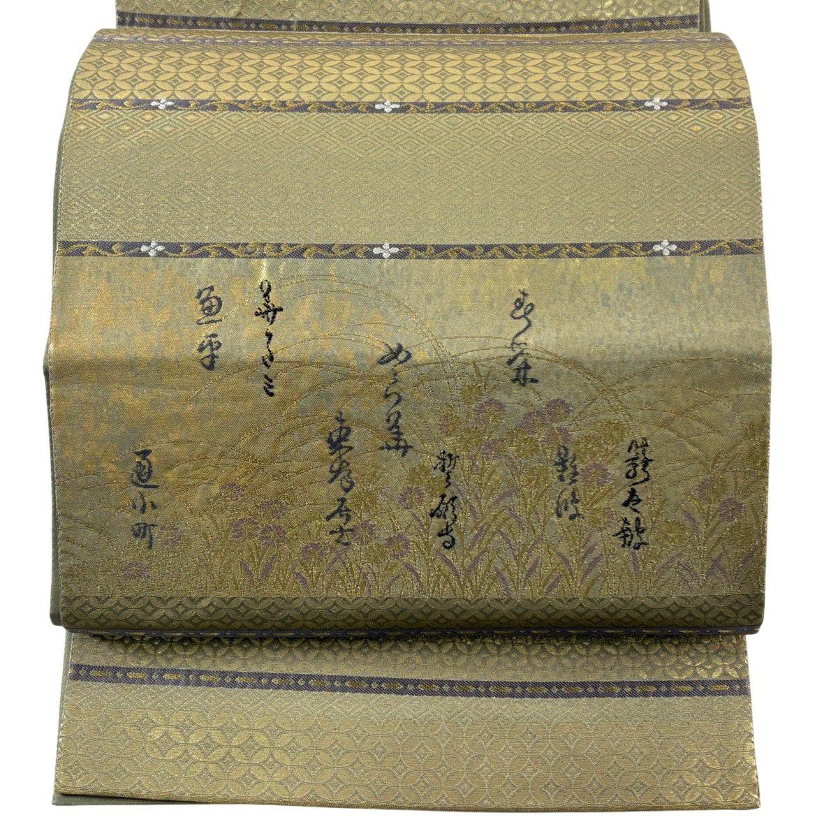 【美品】 袋帯 秀品 文字文 草花 箔 刺繍 鶯色 六通 正絹
