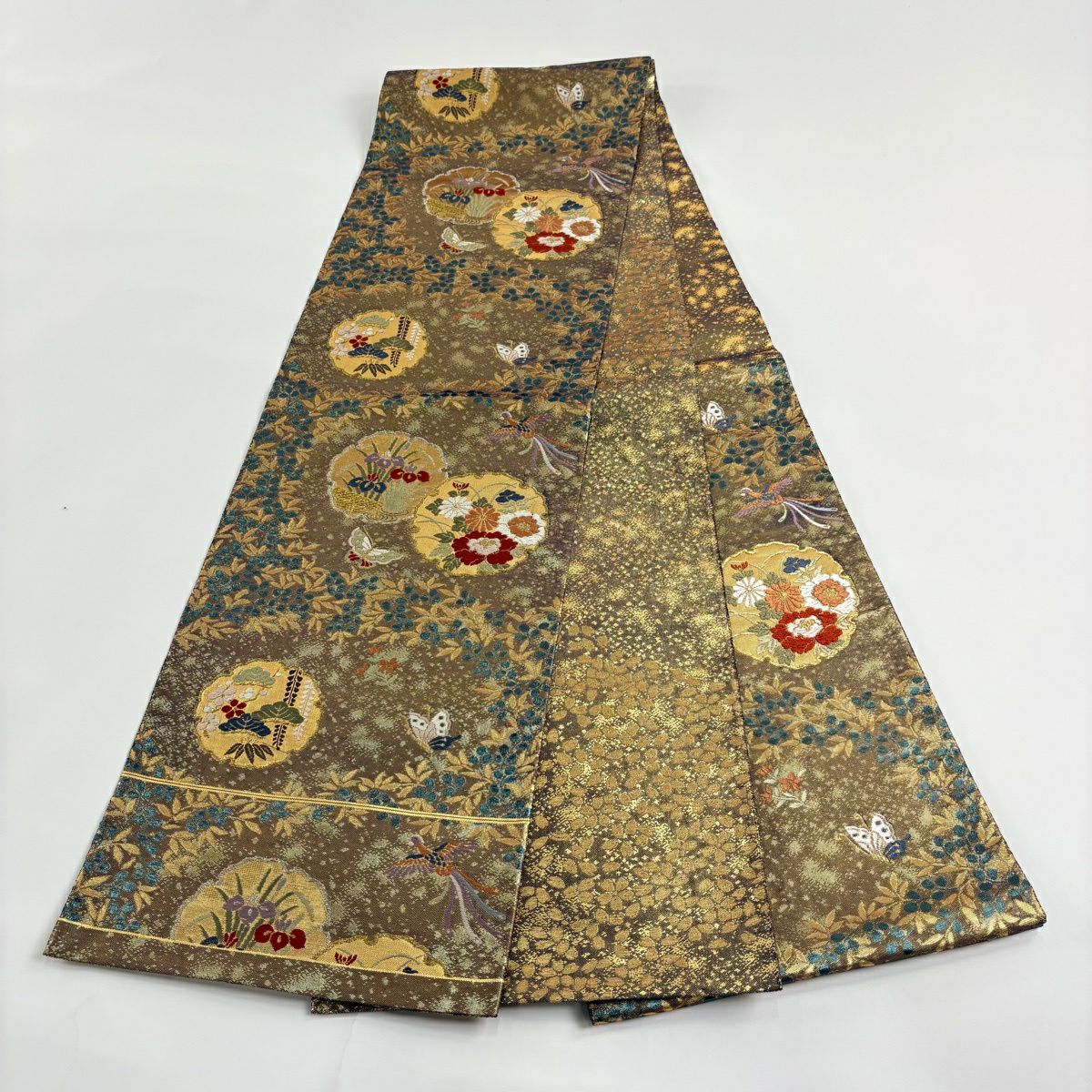 【美品】 袋帯 秀品 花 宝尽くし 金銀糸 箔 金茶 全通 正絹