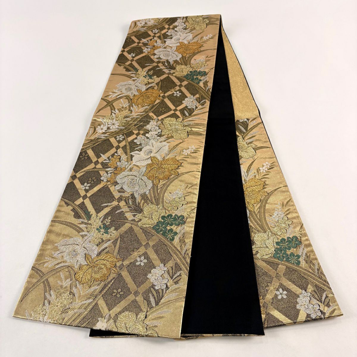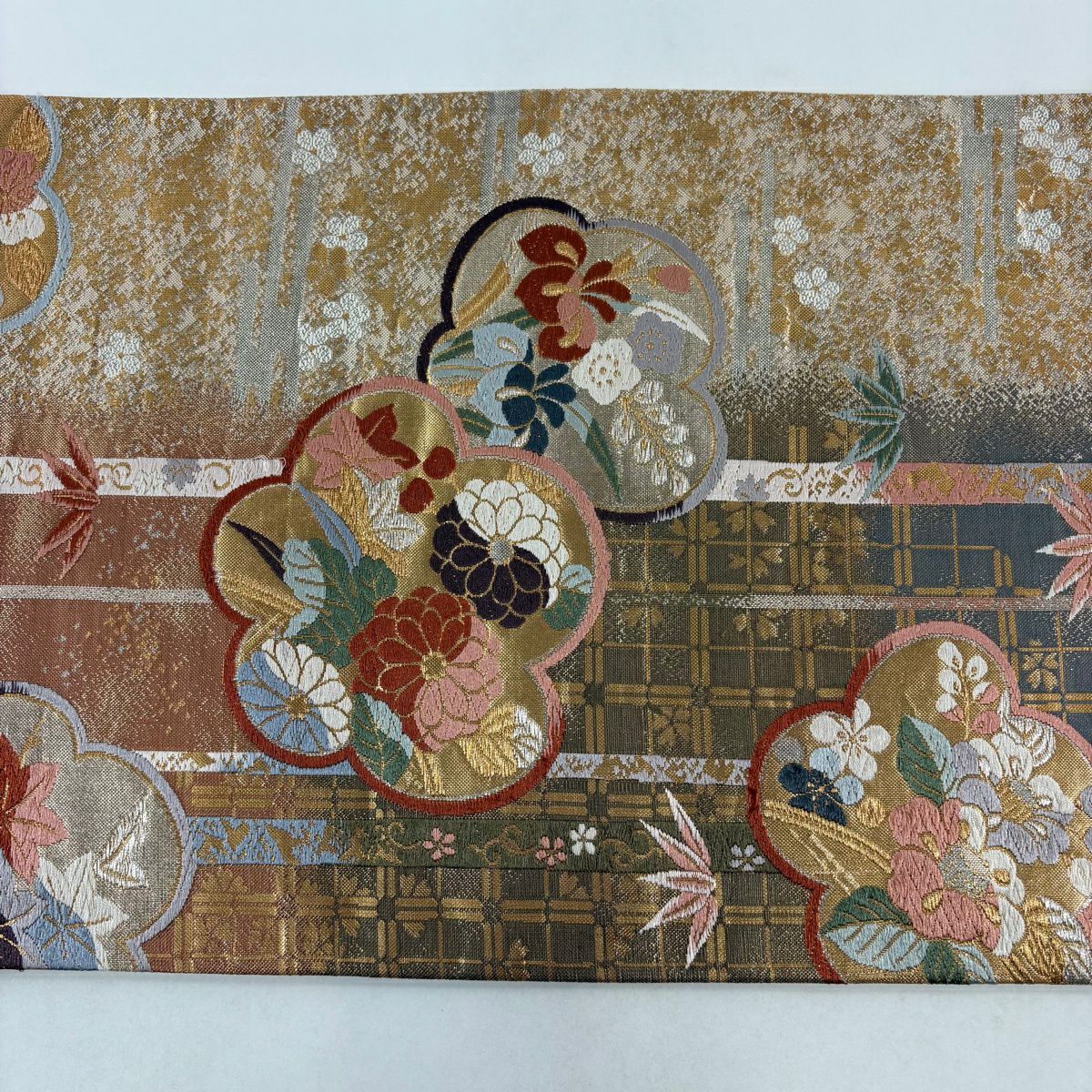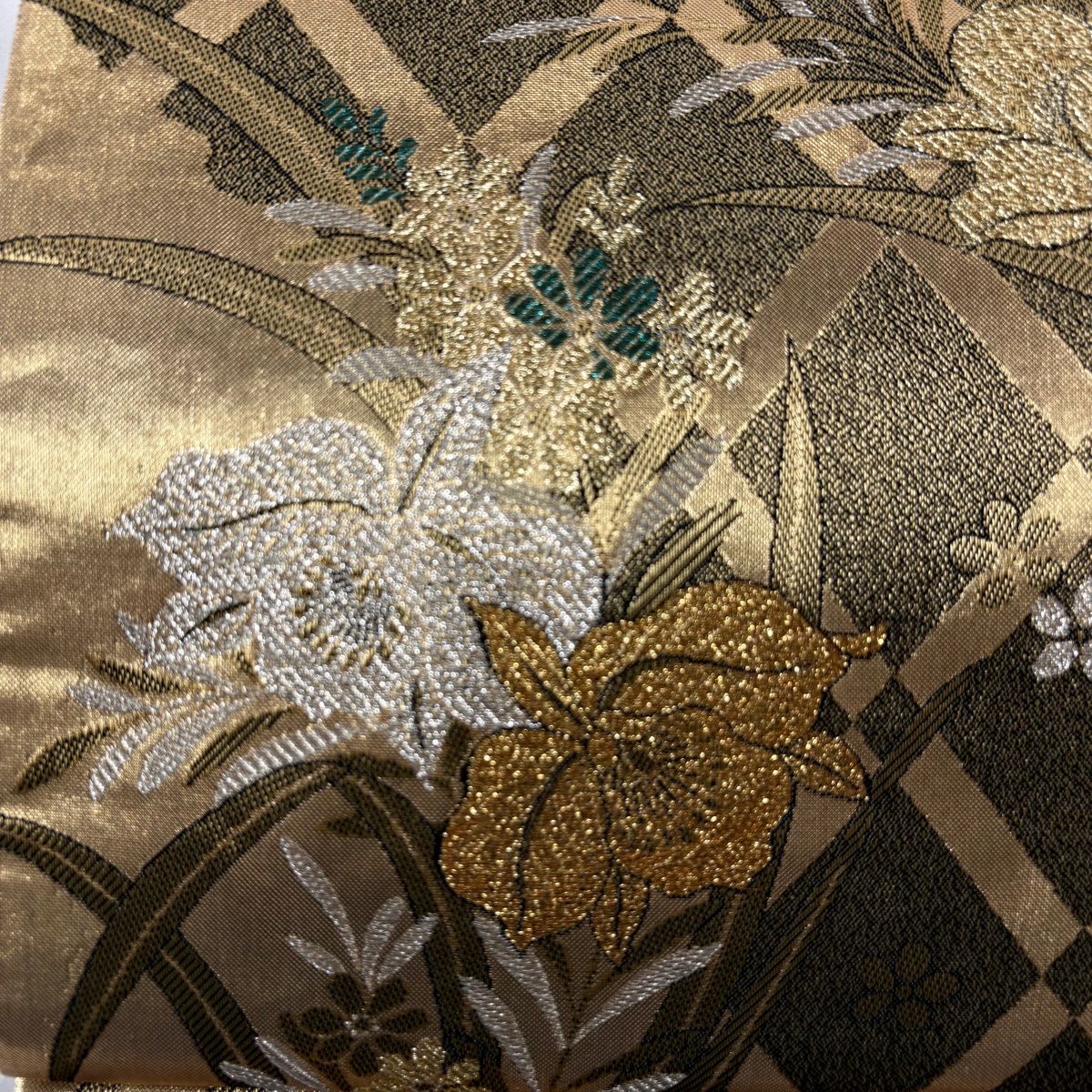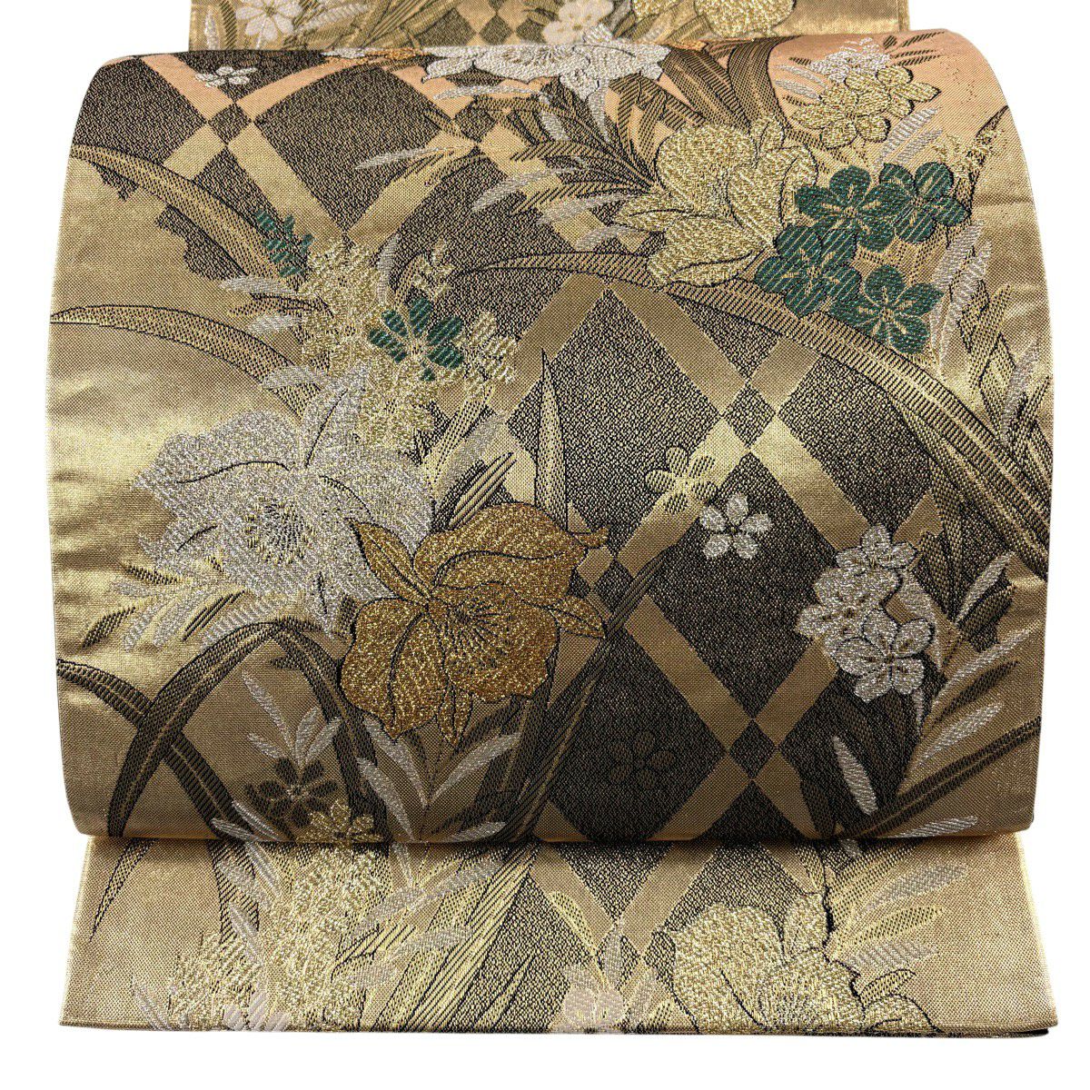 【美品】 袋帯 秀品 草花 斜め格子 金銀糸 箔 金色 六通 正絹