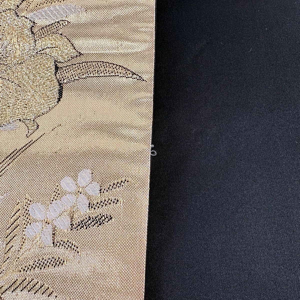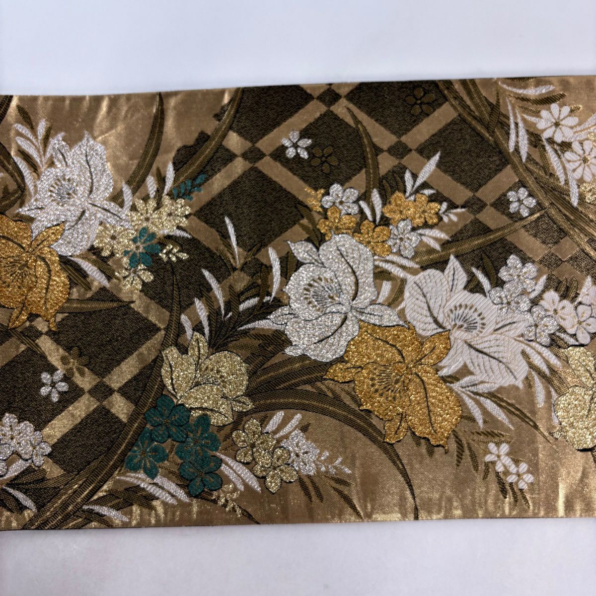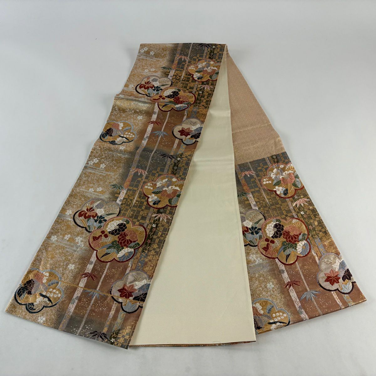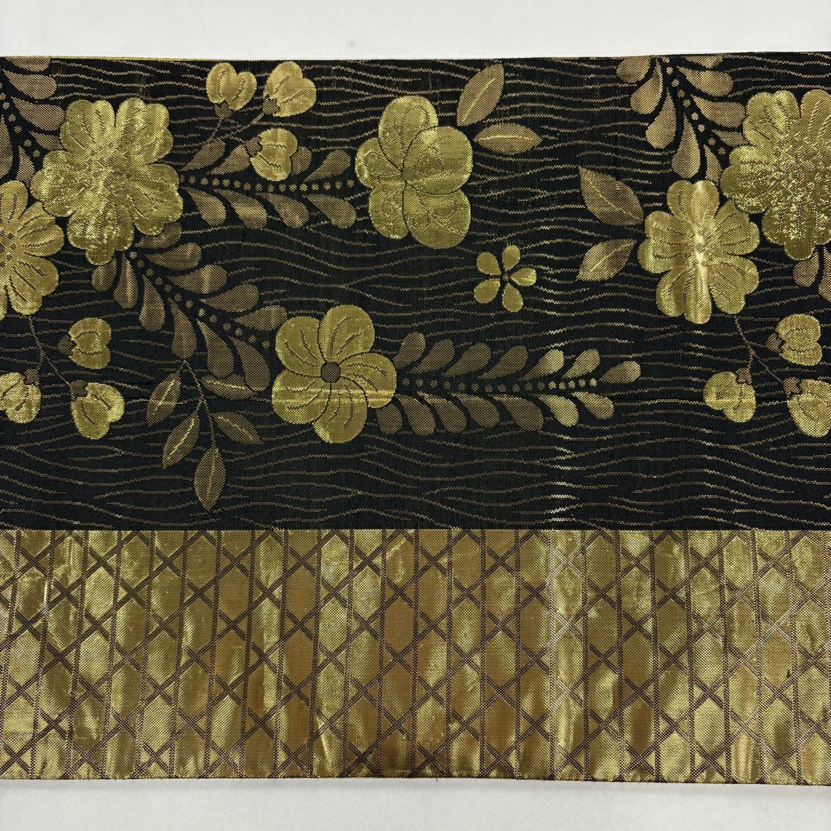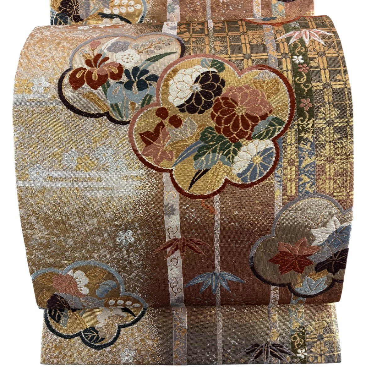 【美品】 袋帯 秀品 草花 斜め格子 金銀糸 箔 金色 六通 正絹