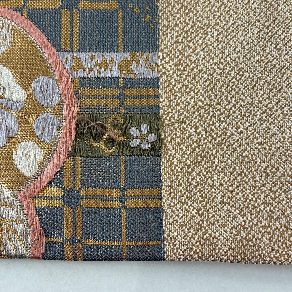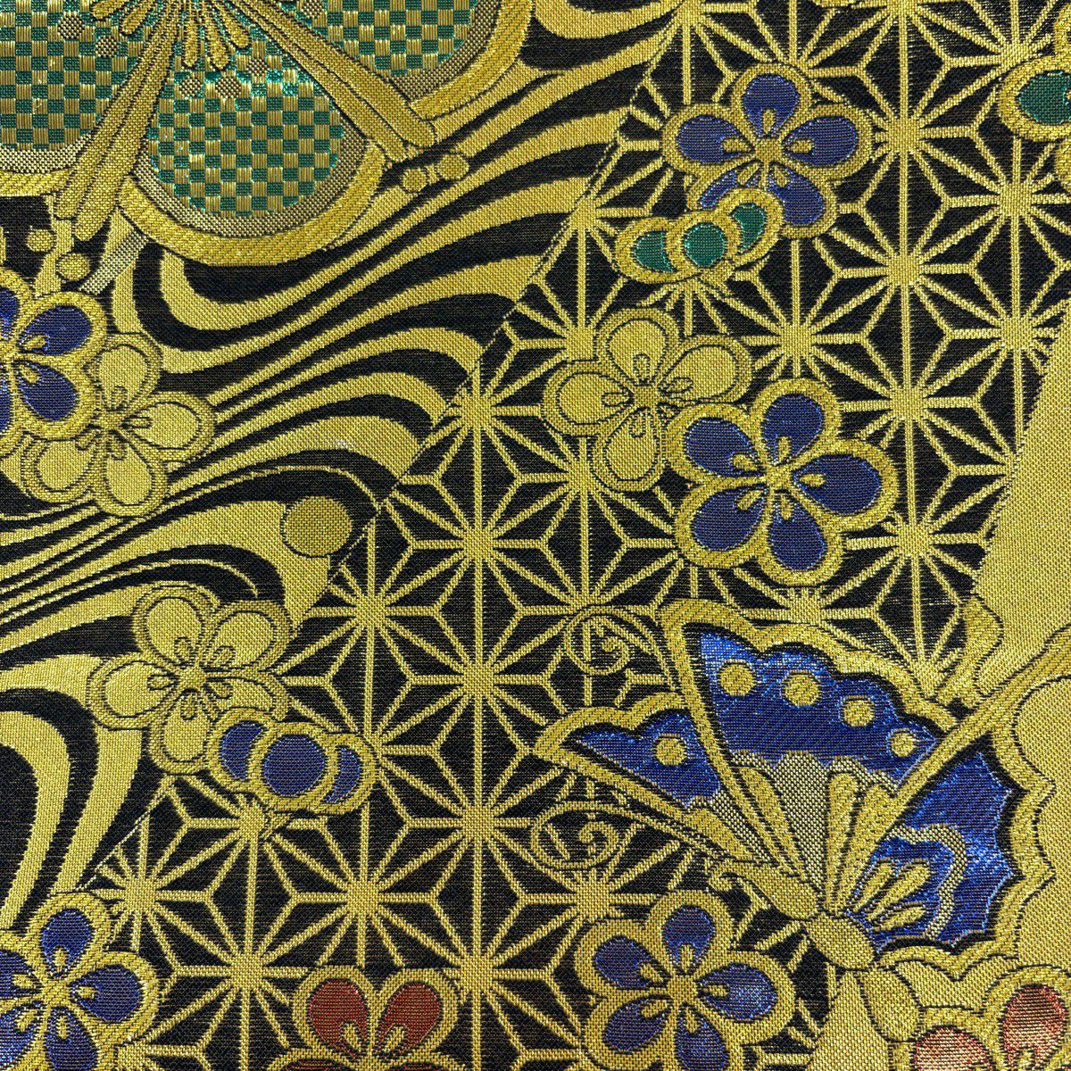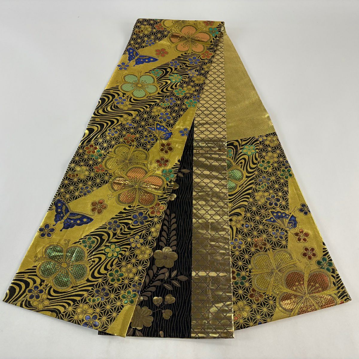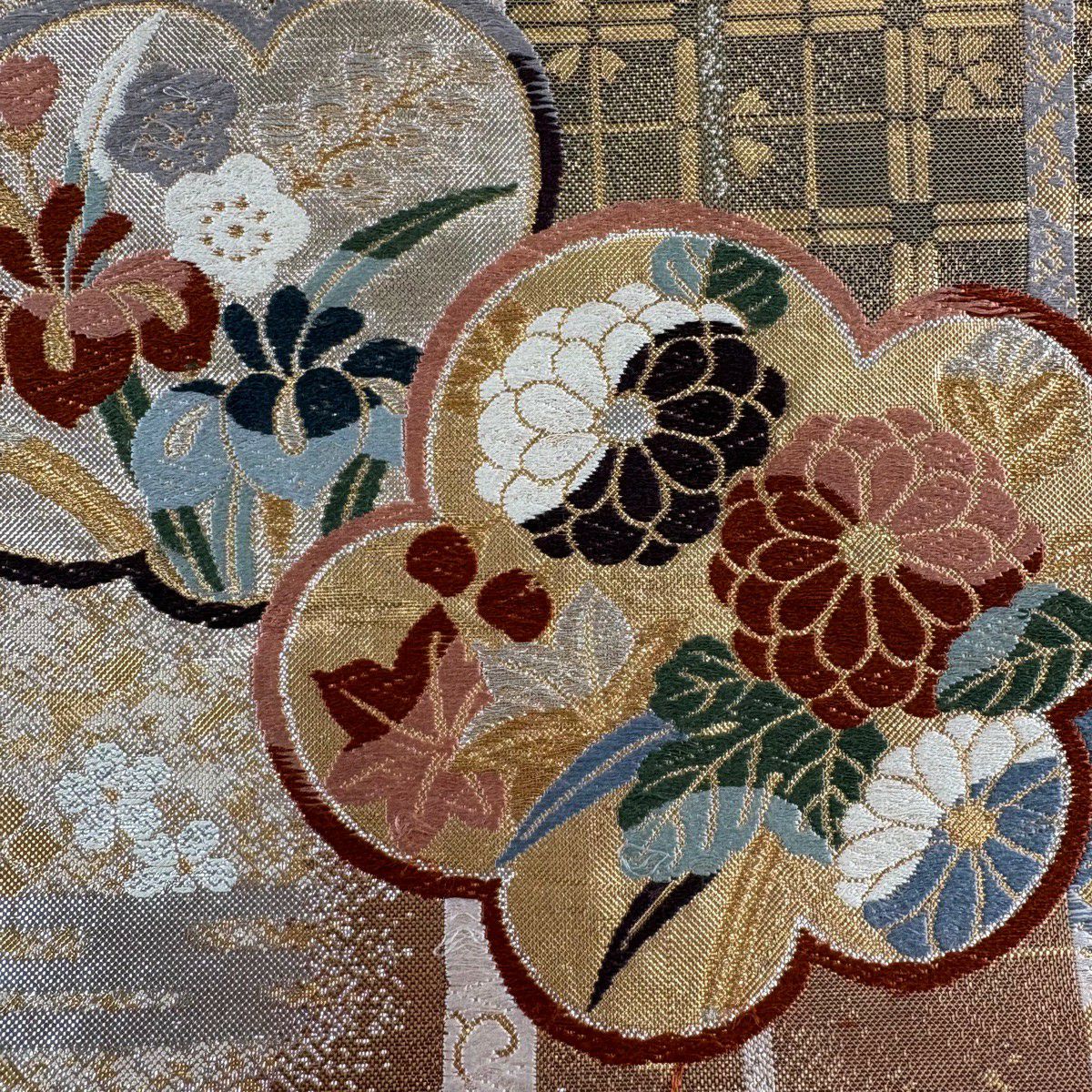 【美品】 袋帯 秀品 草花 斜め格子 金銀糸 箔 金色 六通 正絹