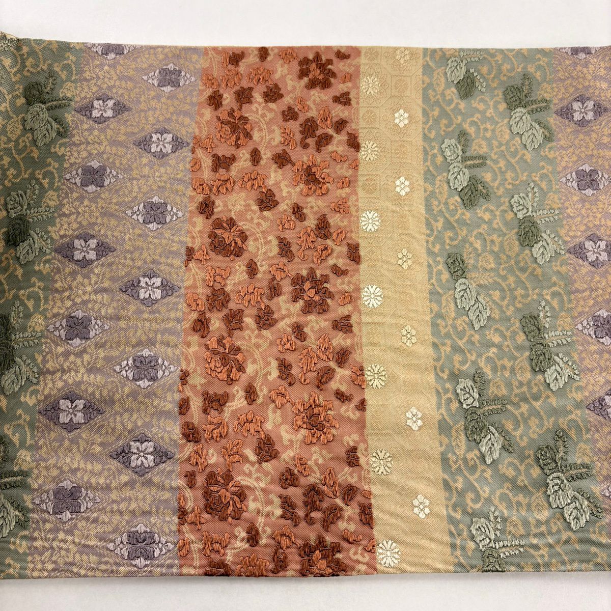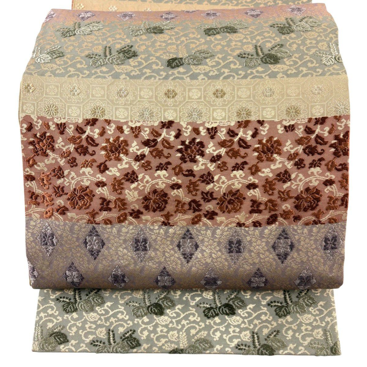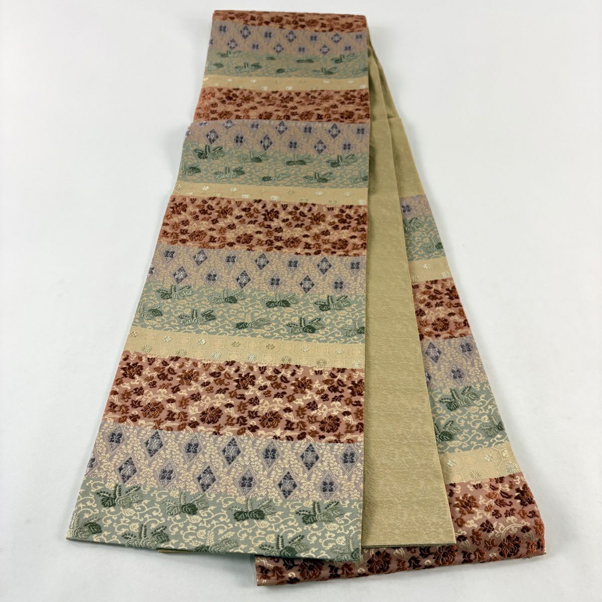 【美品】 袋帯 秀品 花唐草 段縞 刺繍 箔 薄茶色 六通 正絹