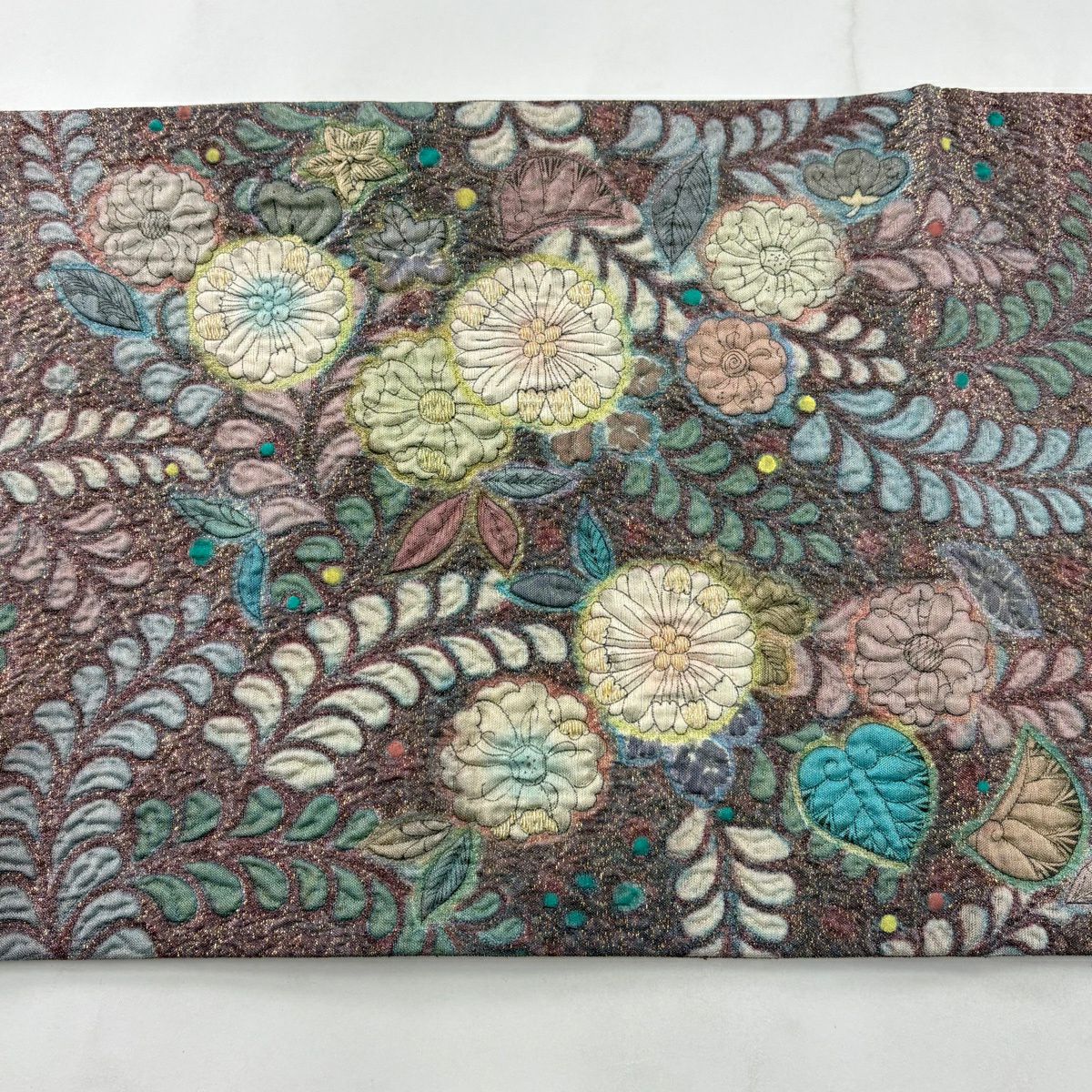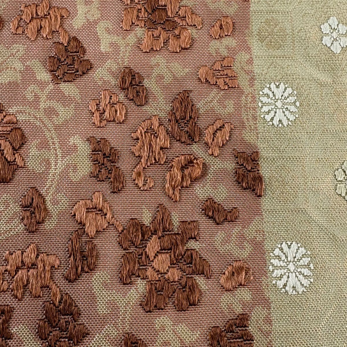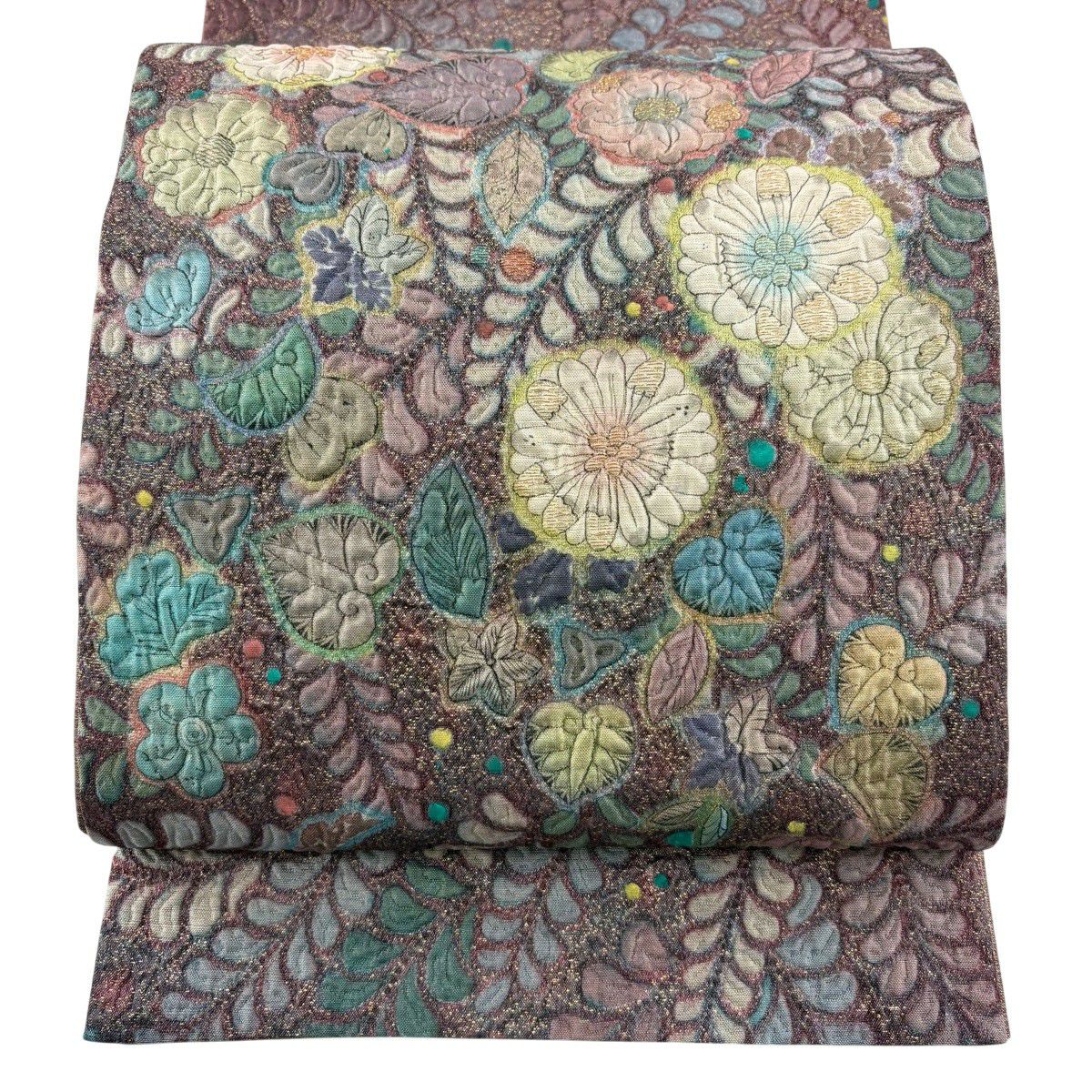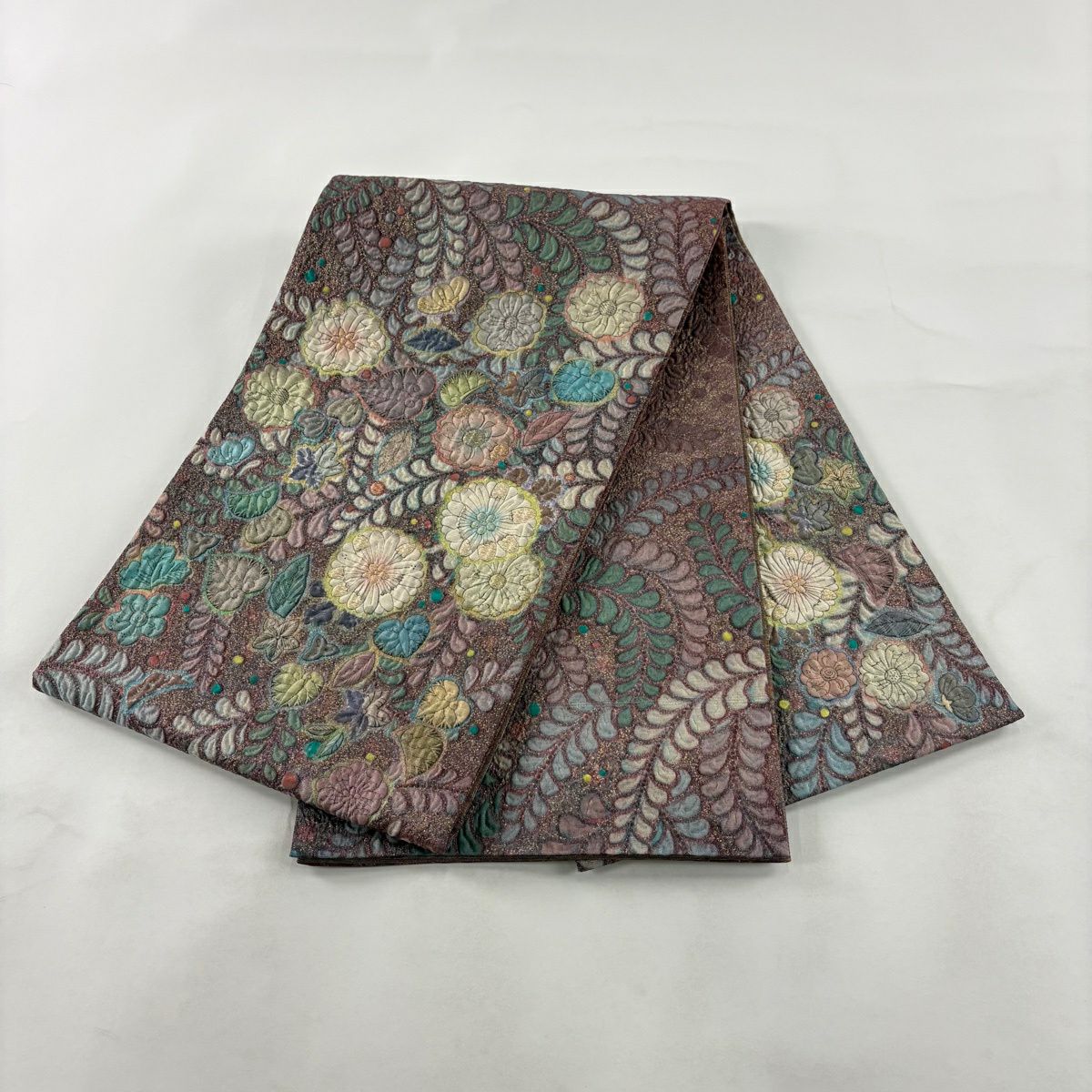 【美品】 袋帯 秀品 花 幾何学模様 金彩 茶色 お太鼓柄 正絹