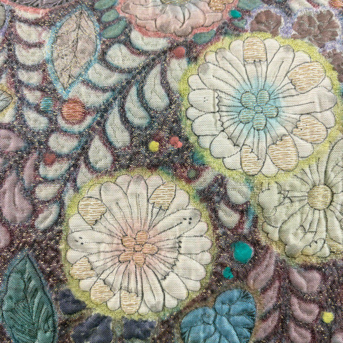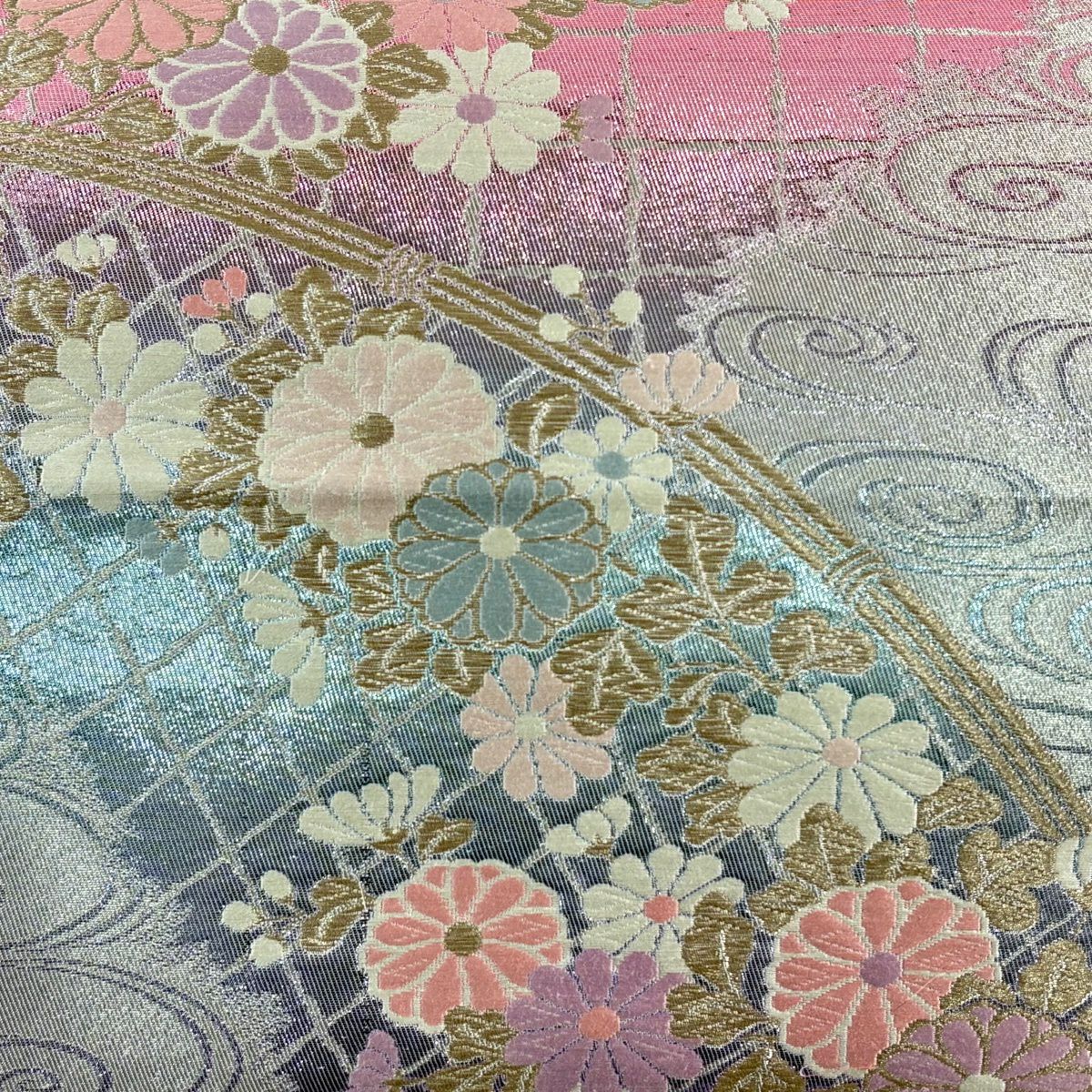 袋帯 秀品 四季の花 菊 流水 銀糸 唐織 ピンク 六通 正絹