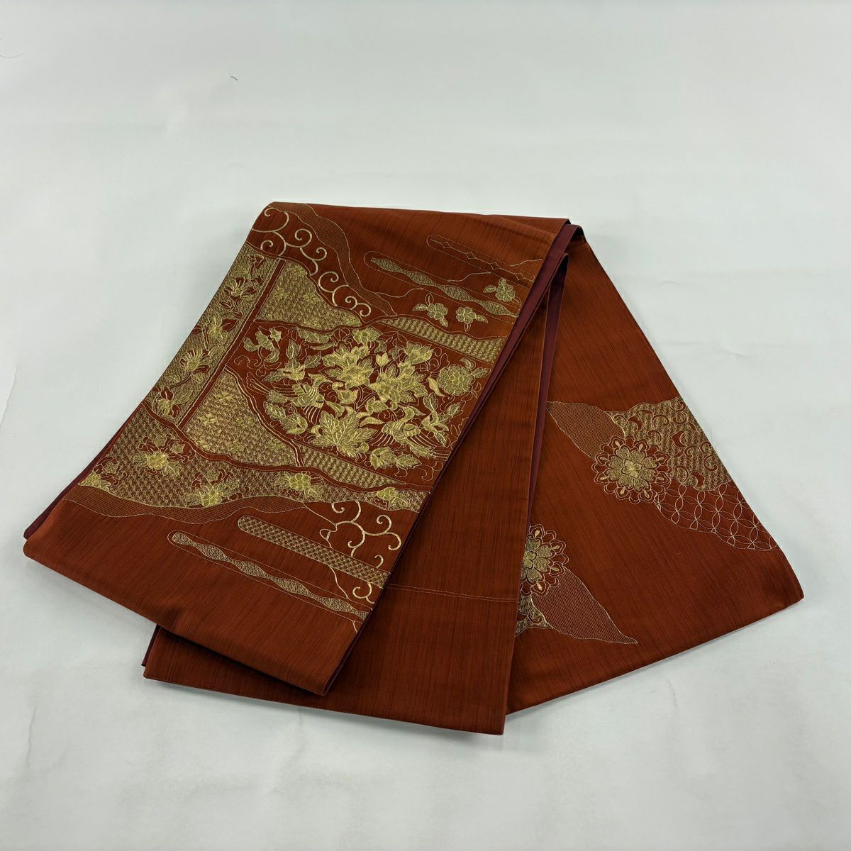 【美品】 袋帯 秀品 向かい鳥 草花 金糸 赤茶 お太鼓柄 正絹