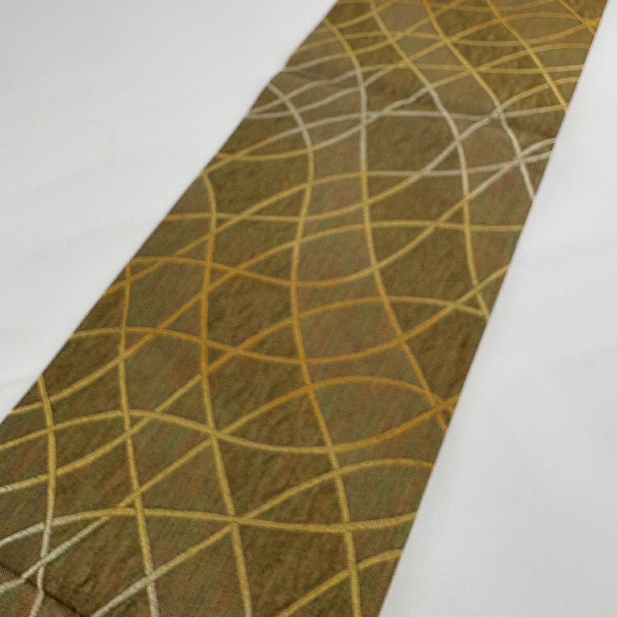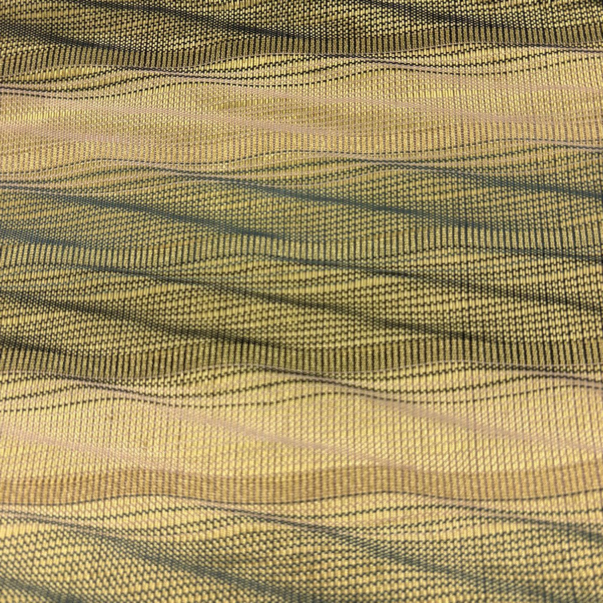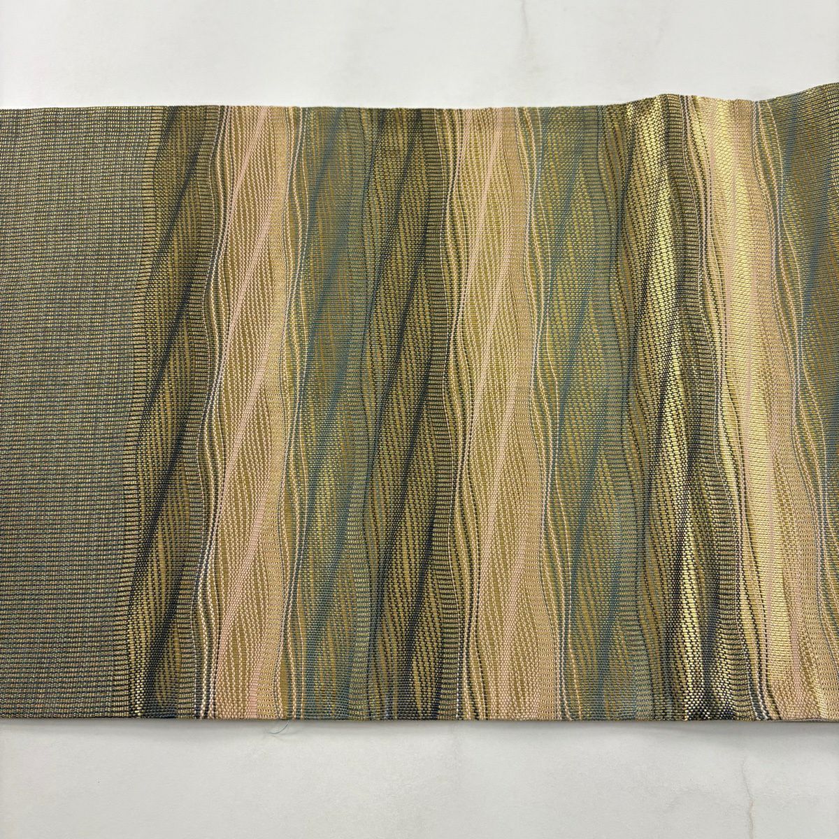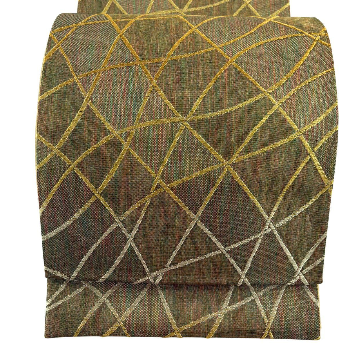 【美品】 袋帯 秀品 幾何学 金銀糸 ラメ糸 茶緑色 全通 正絹