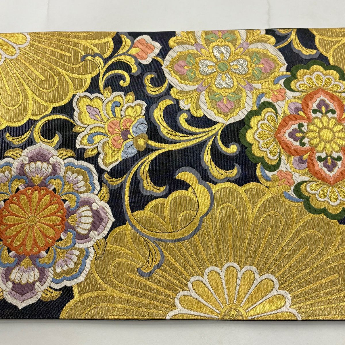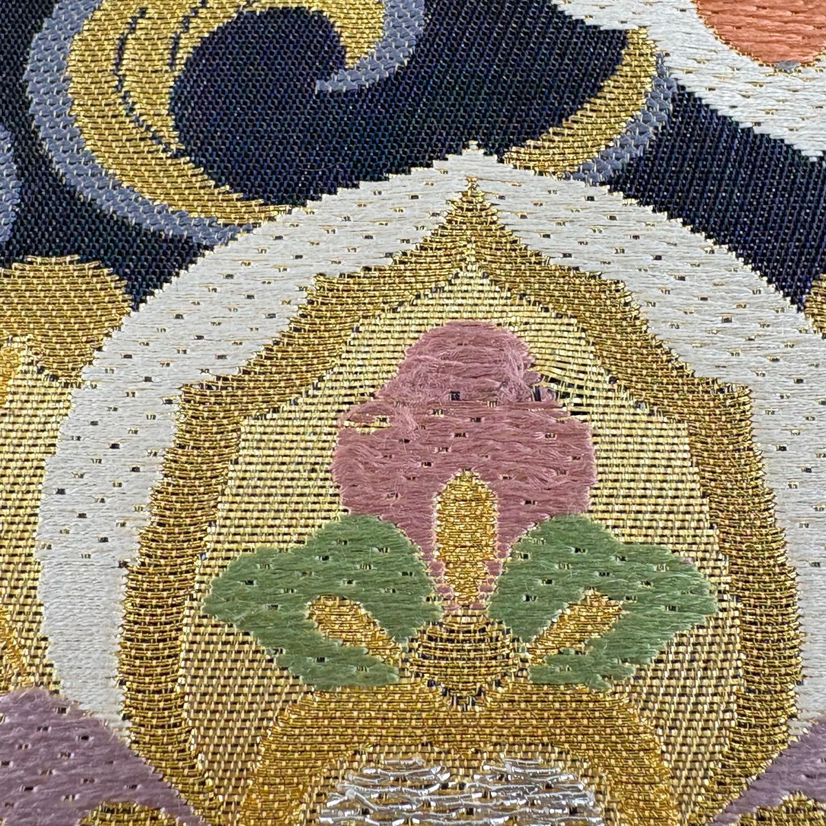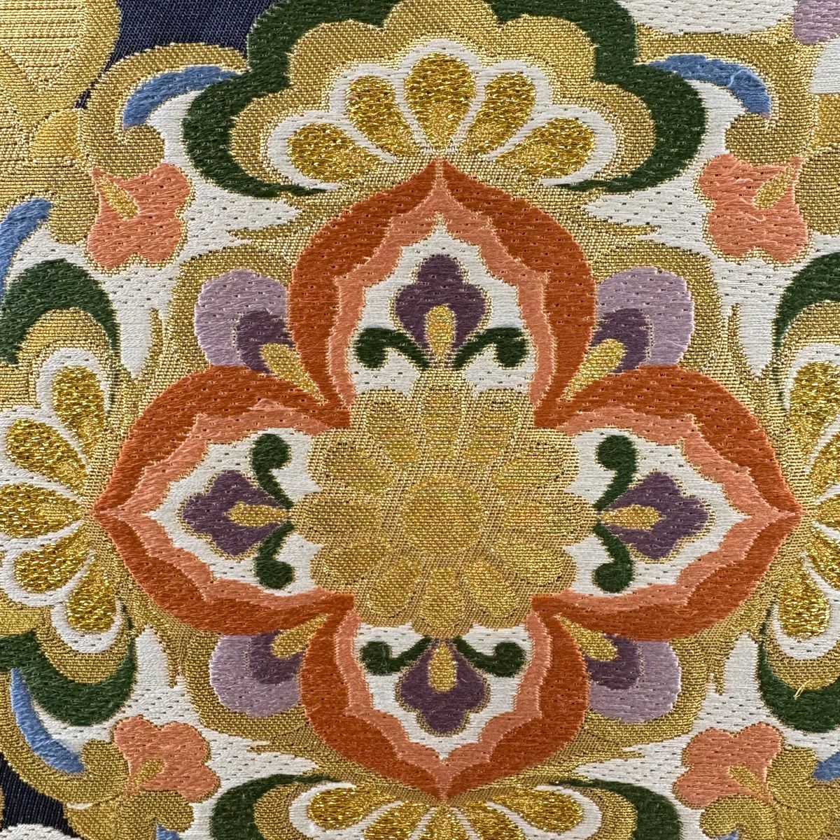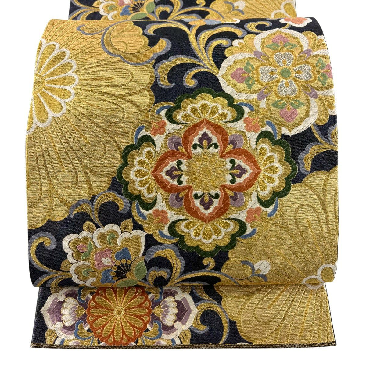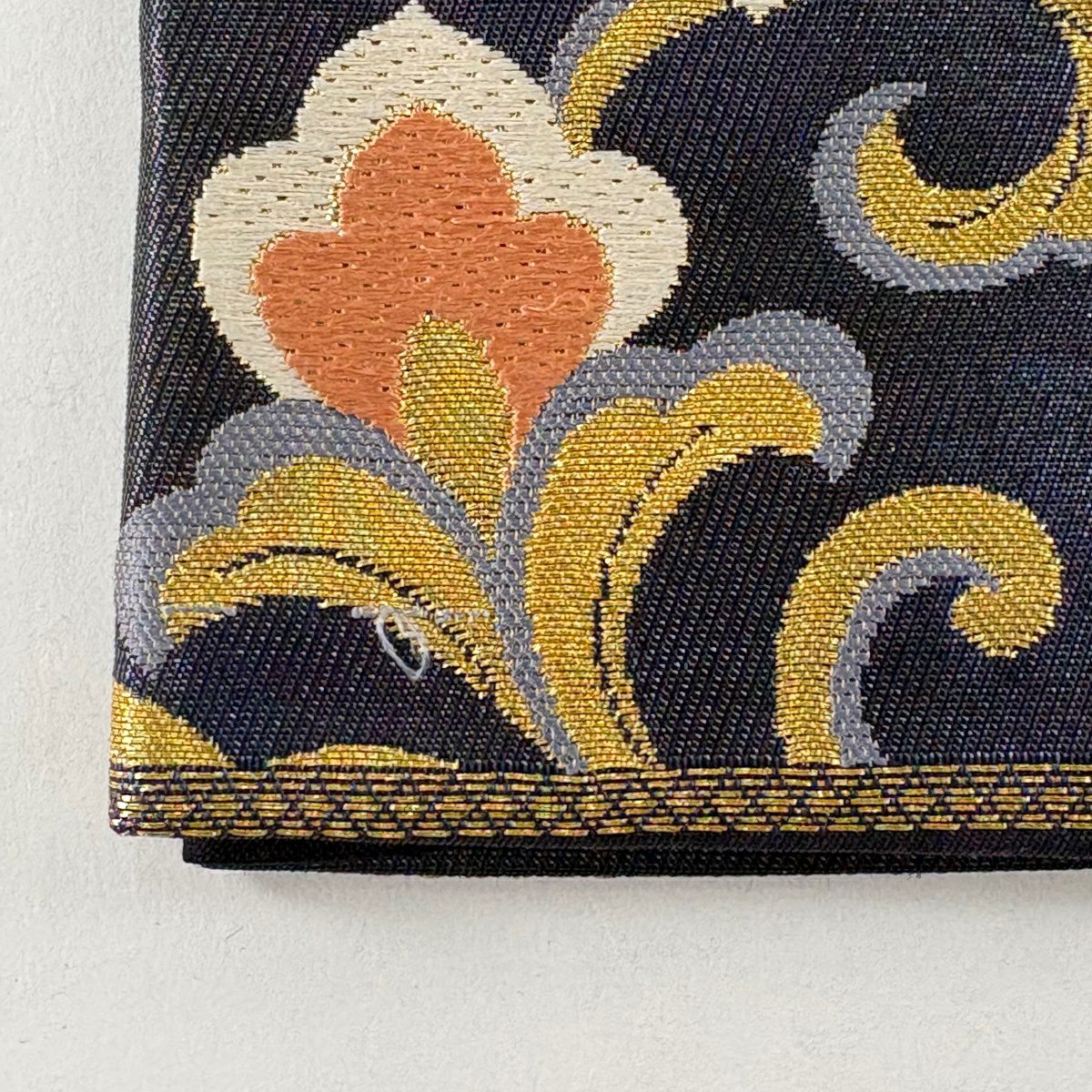 【美品】 袋帯 秀品 華文 花唐草 金銀糸 箔 紺色 六通 正絹
