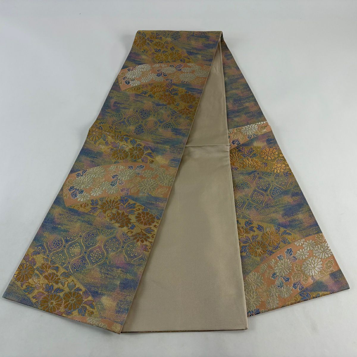 袋帯 秀品 波頭 貝合わせ 金銀糸 箔 ベージュ 六通 正絹