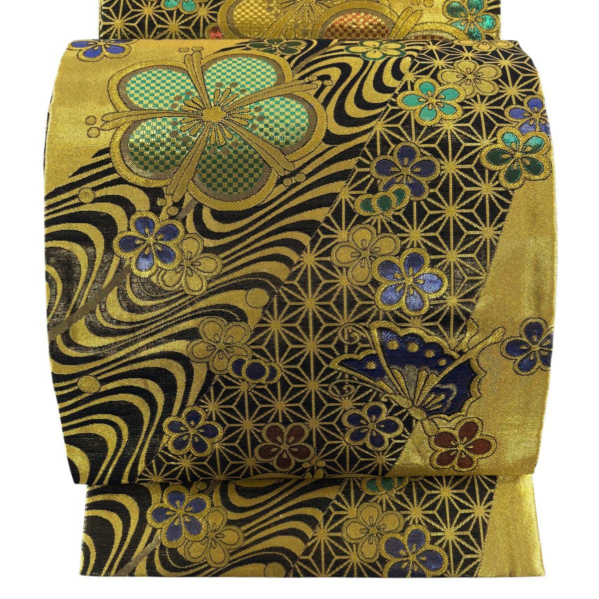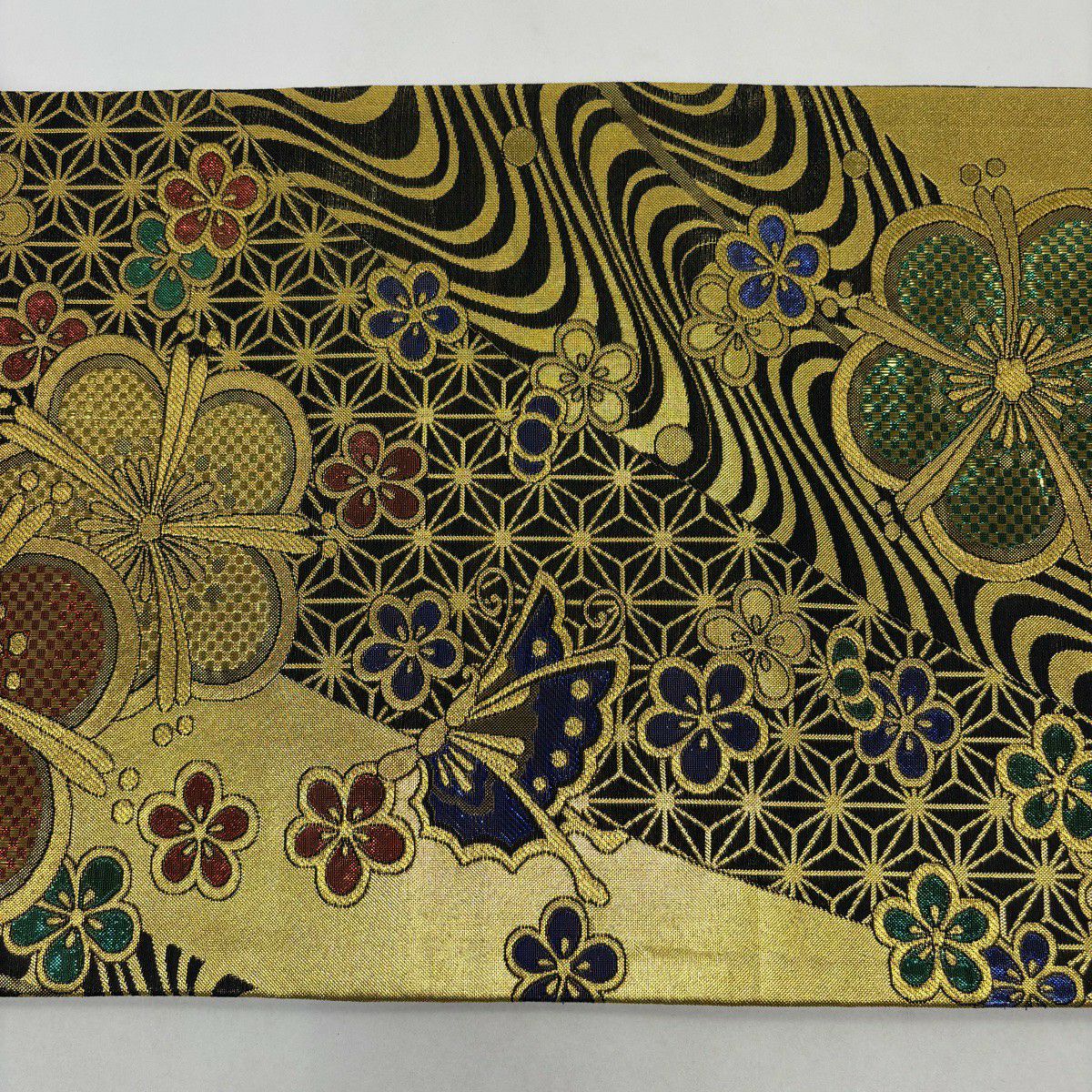 【美品】 袋帯 秀品 振袖向き 梅 蝶 金糸 箔 金色 六通 正絹