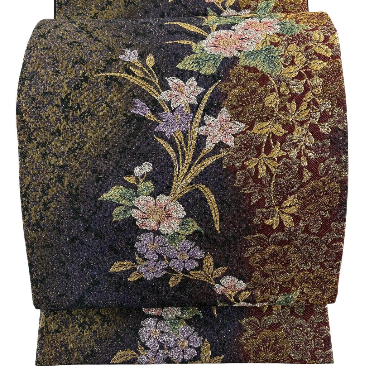 【美品】 袋帯 秀品 やまと 草花 箔 金通し 濃紫 六通 正絹