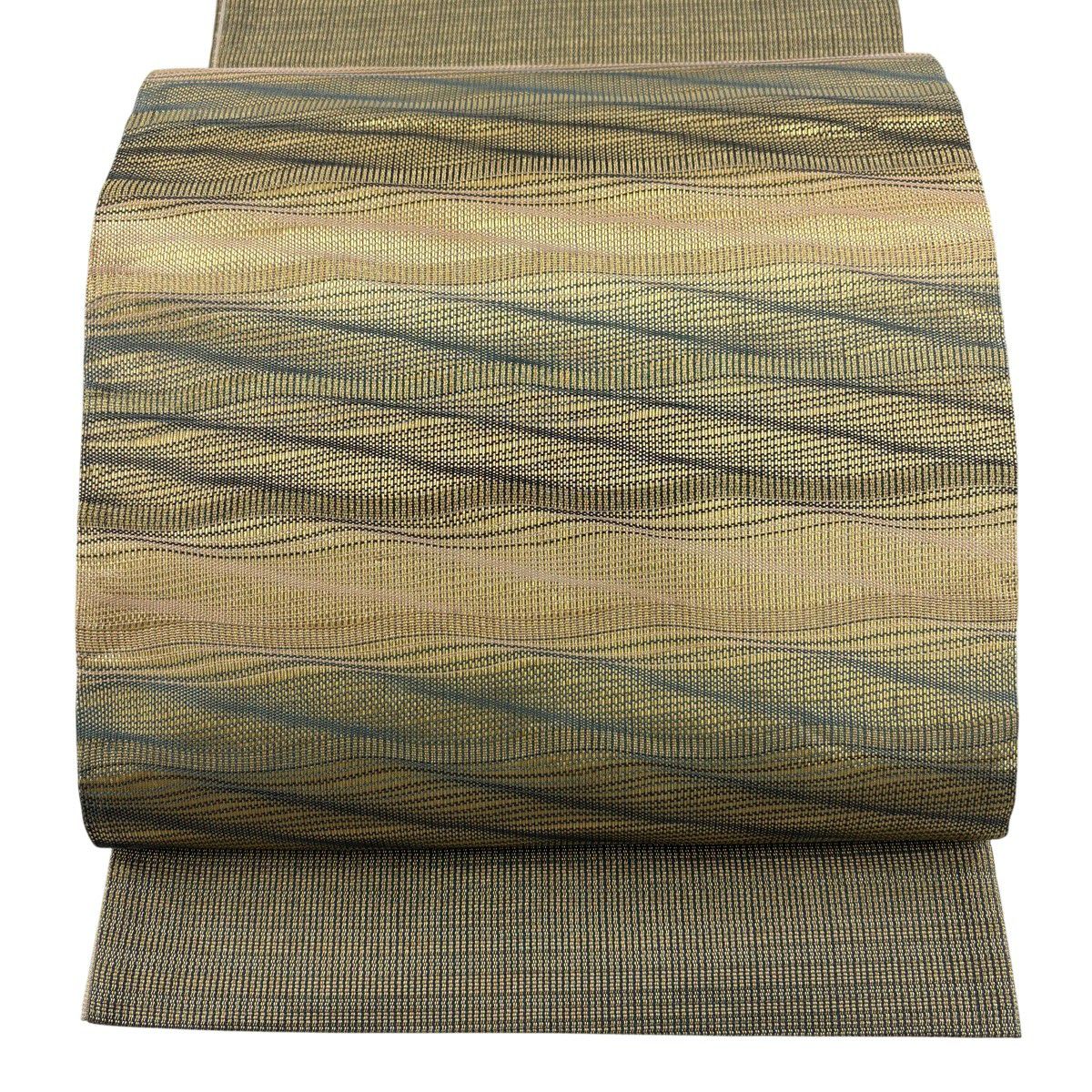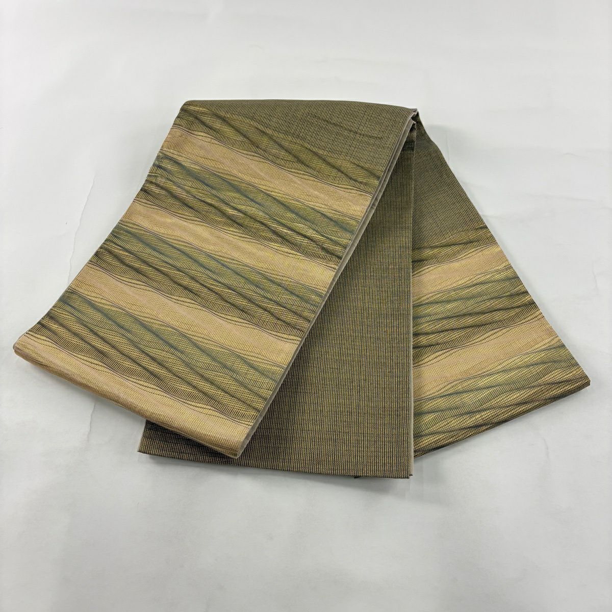 【美品】 袋帯 秀品 斜縞 幾何学模様 箔 灰緑 お太鼓柄 正絹
