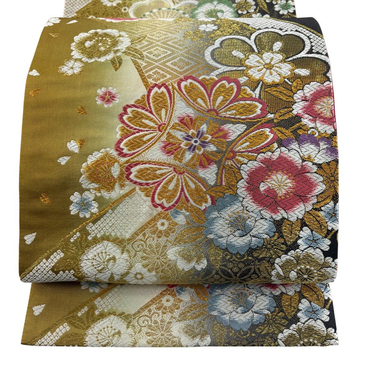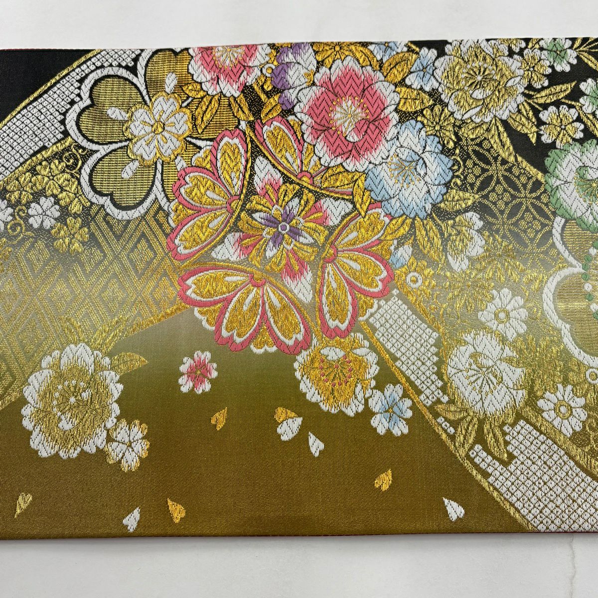 【美品】 袋帯 秀品 振袖向き 桜 霞 金糸 箔 金色 六通 正絹