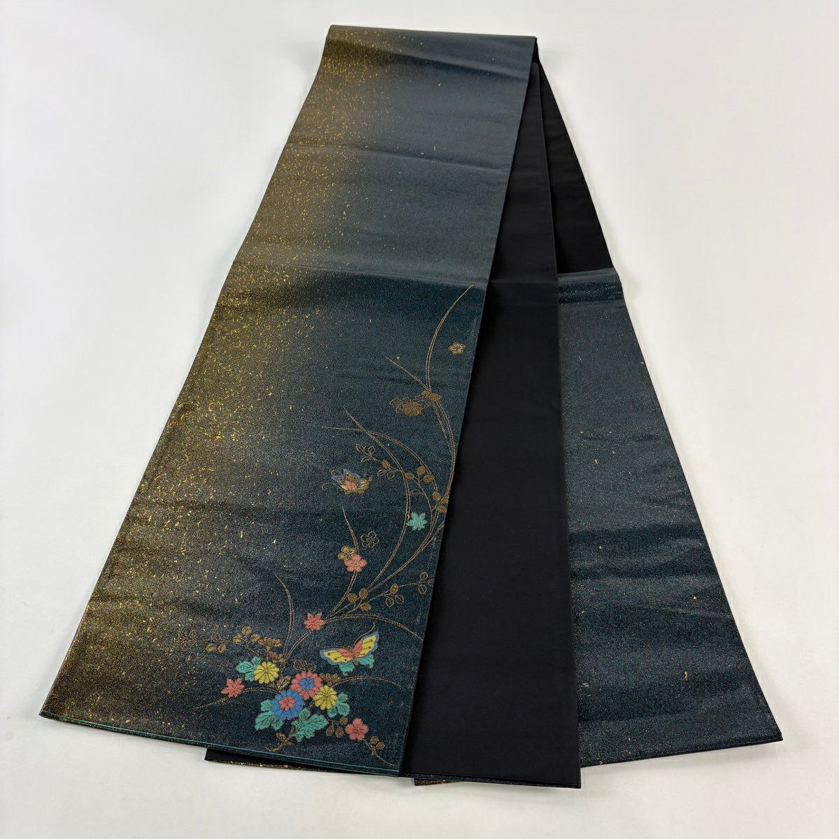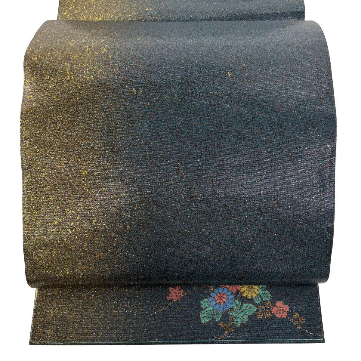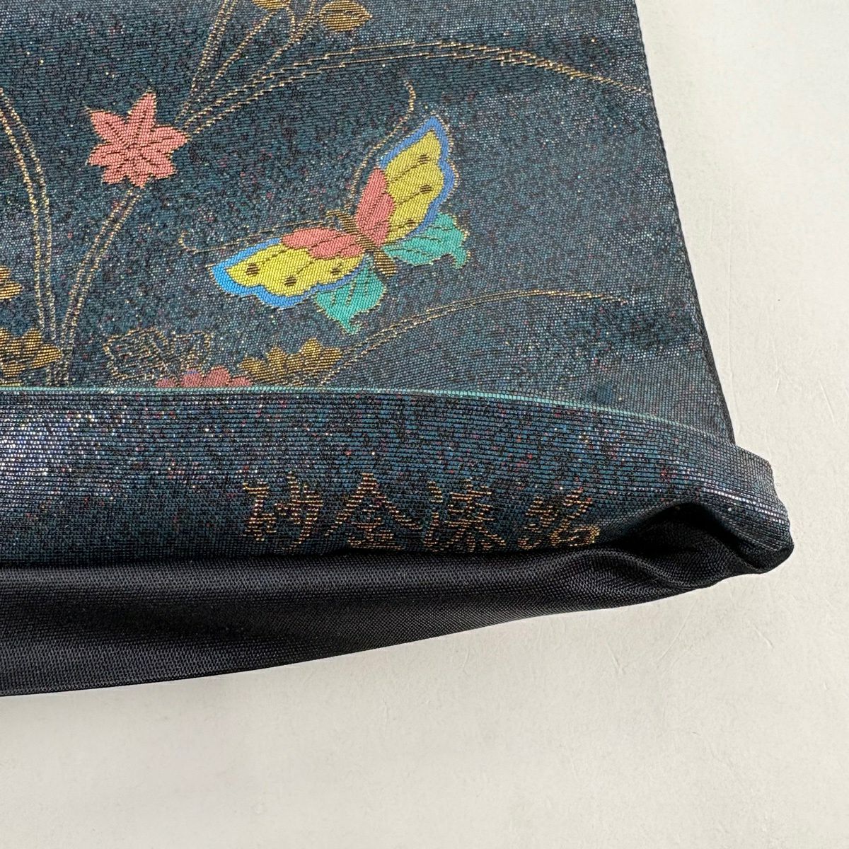 【美品】 袋帯 秀品 草花 幾何学 金銀糸 箔 墨色 六通 正絹