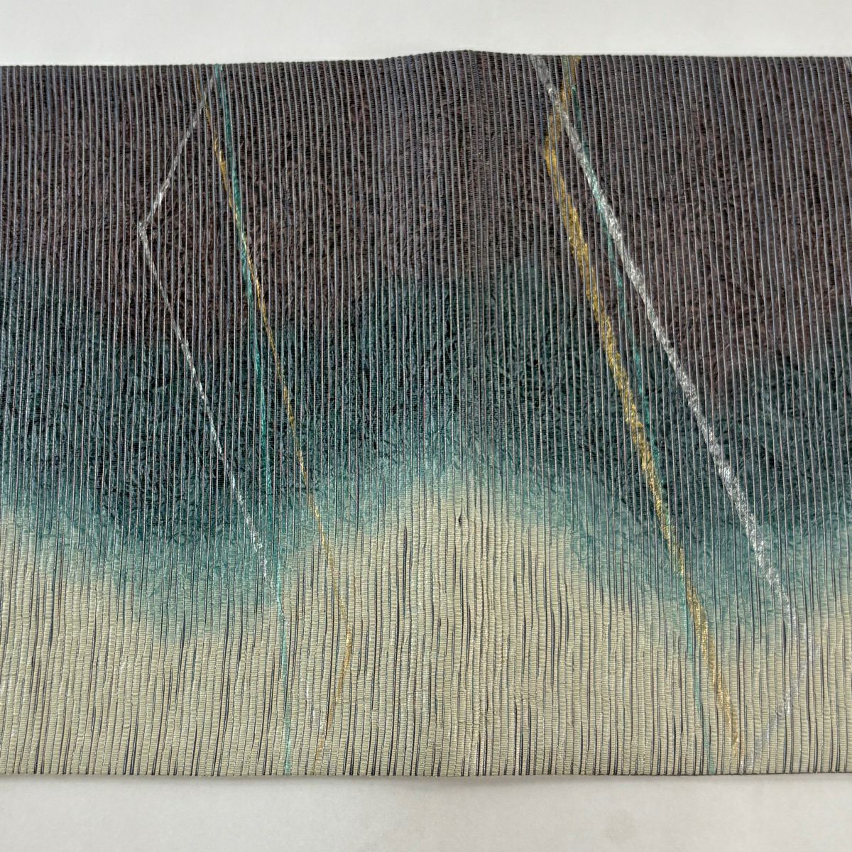 【美品】 袋帯 秀品 波 幾何学 金糸 箔 灰緑 お太鼓柄 正絹