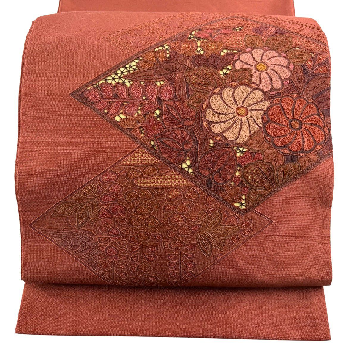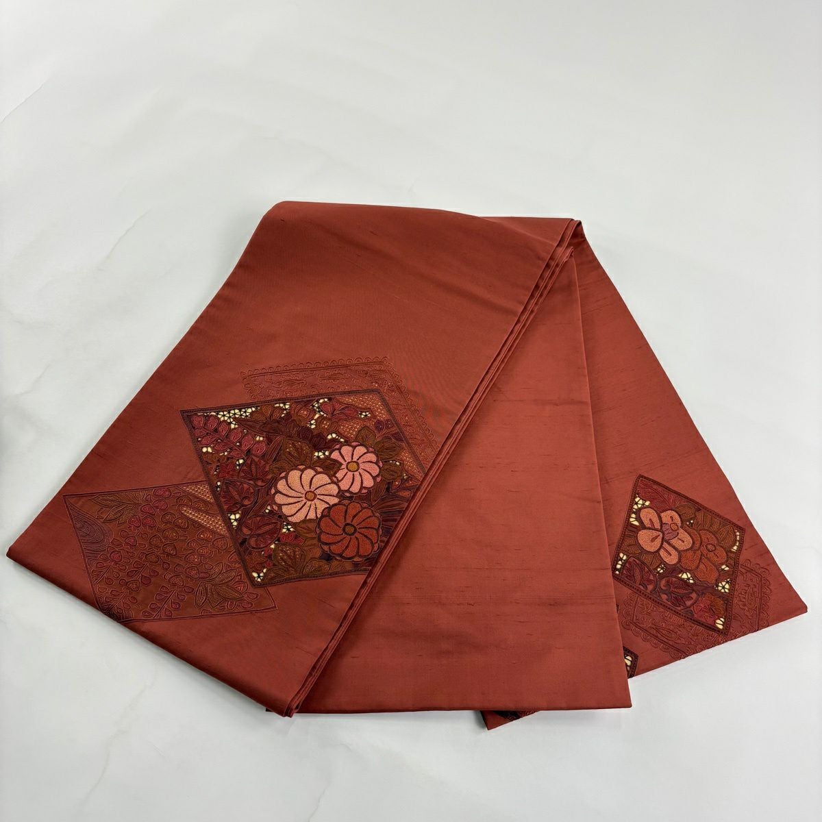 【美品】 袋帯 秀品 紬地 菱 草花 刺繍 赤茶 お太鼓柄 正絹