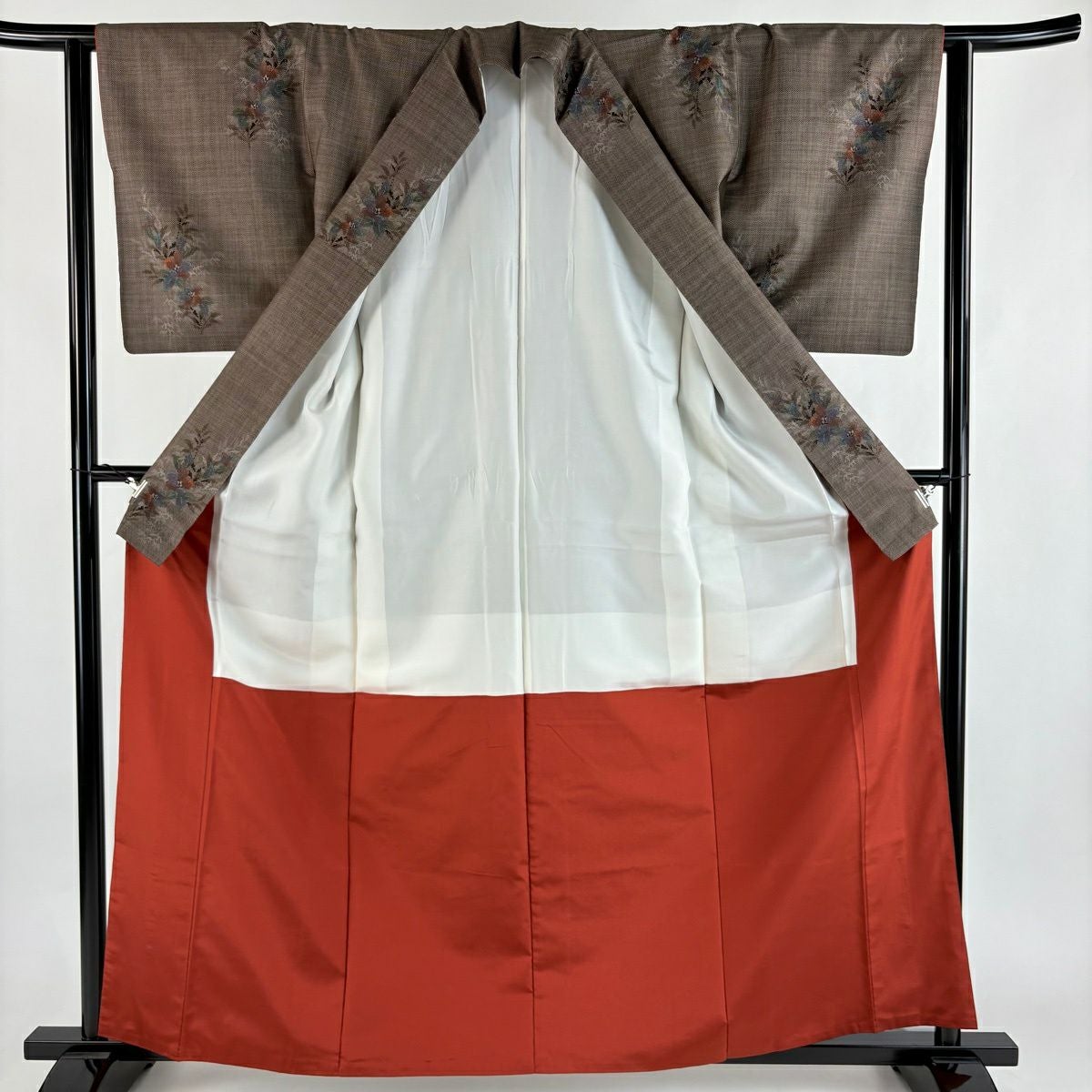 紬 身丈161cm 裄丈63cm S 袷 草花 焦茶色 正絹 秀品