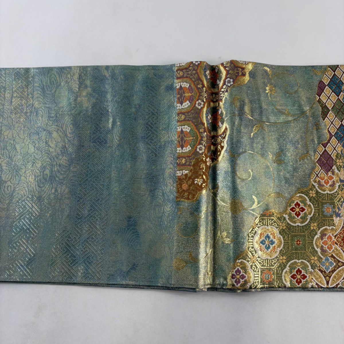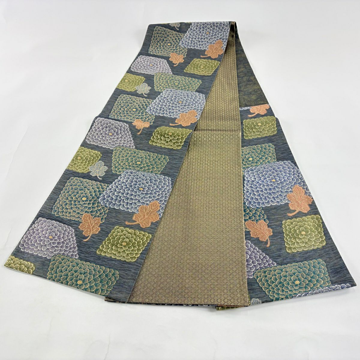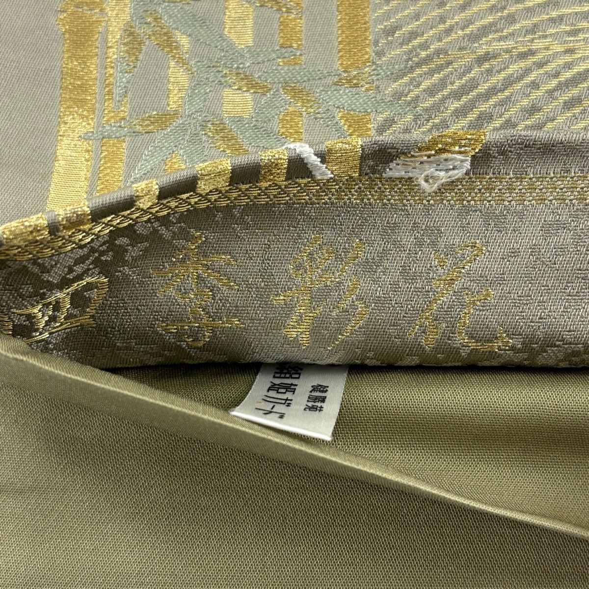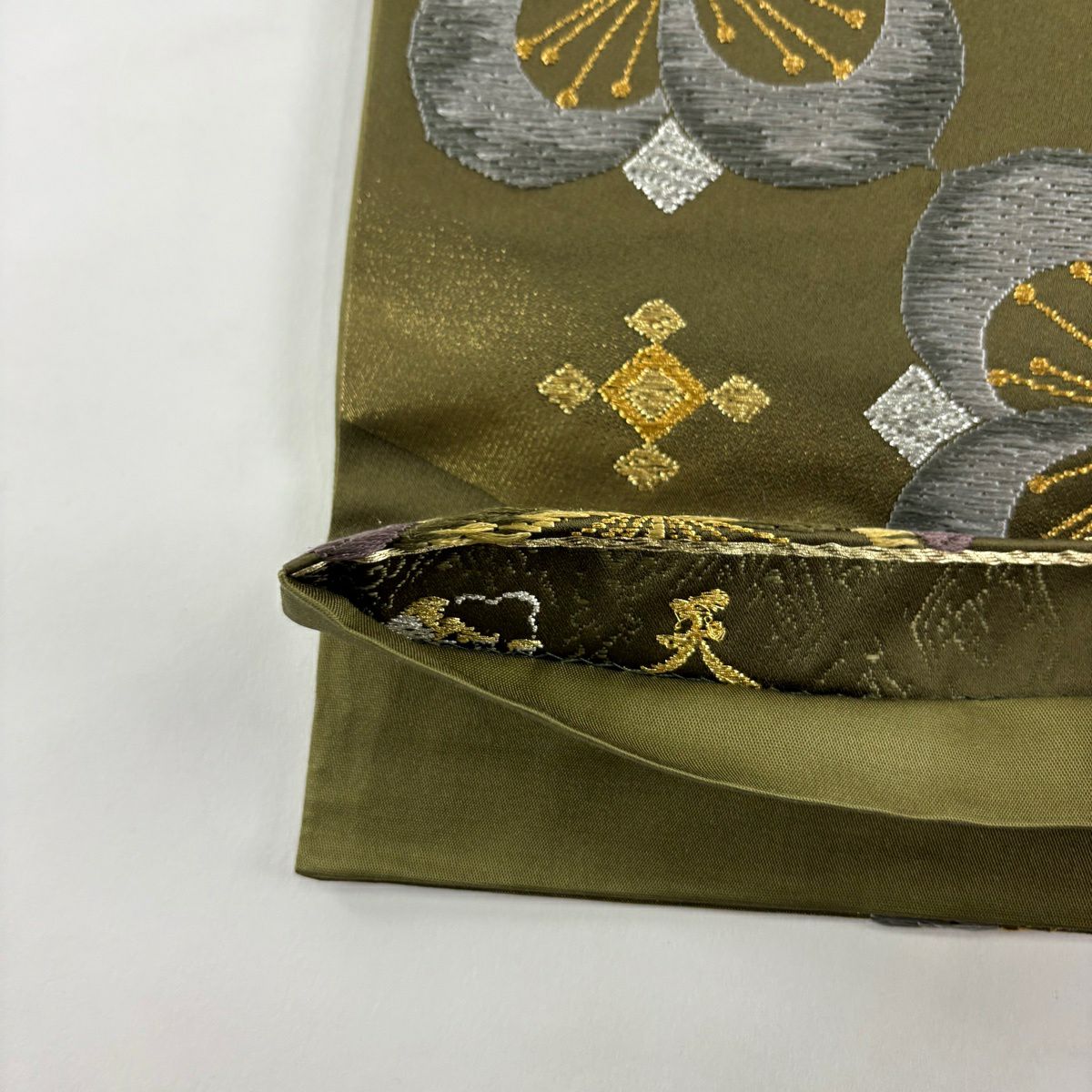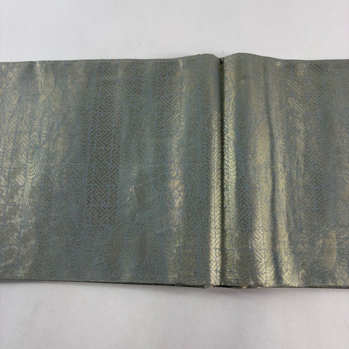 【美品】 袋帯 秀品 菊 幾何学模様 唐織 箔 灰緑 六通 正絹