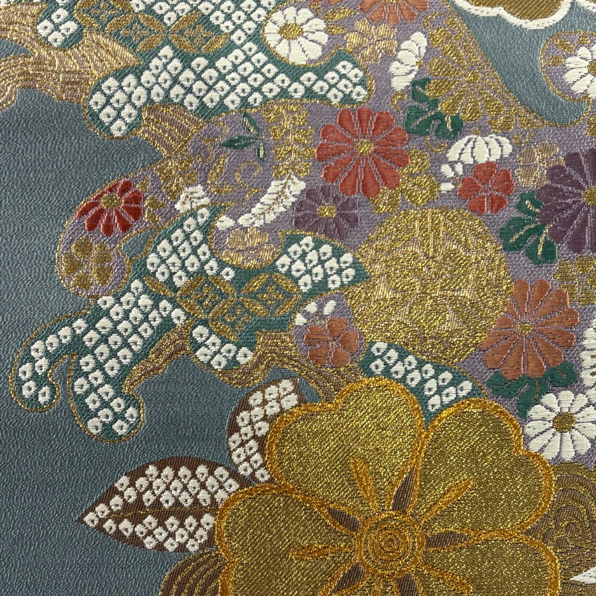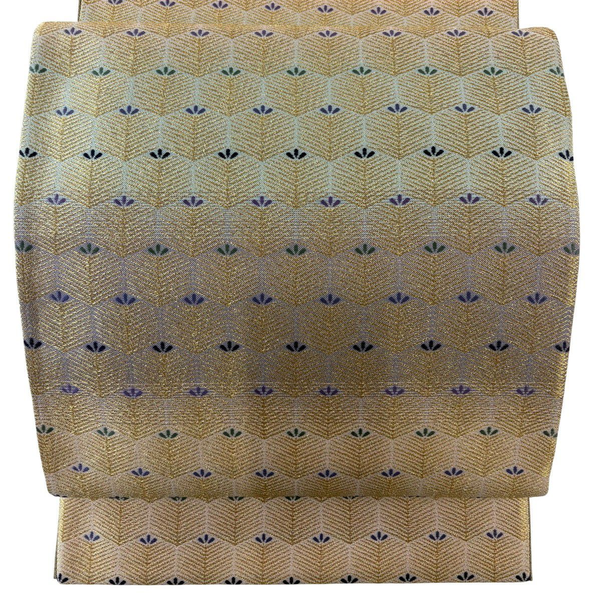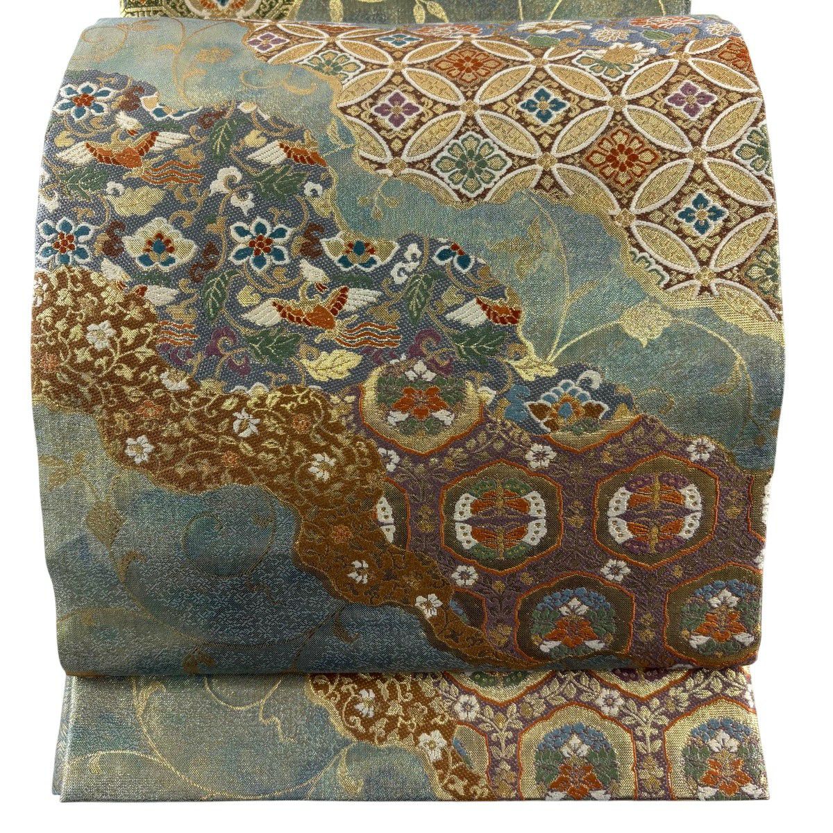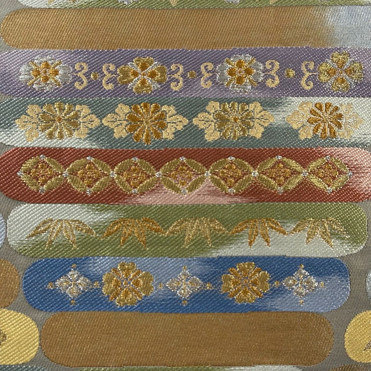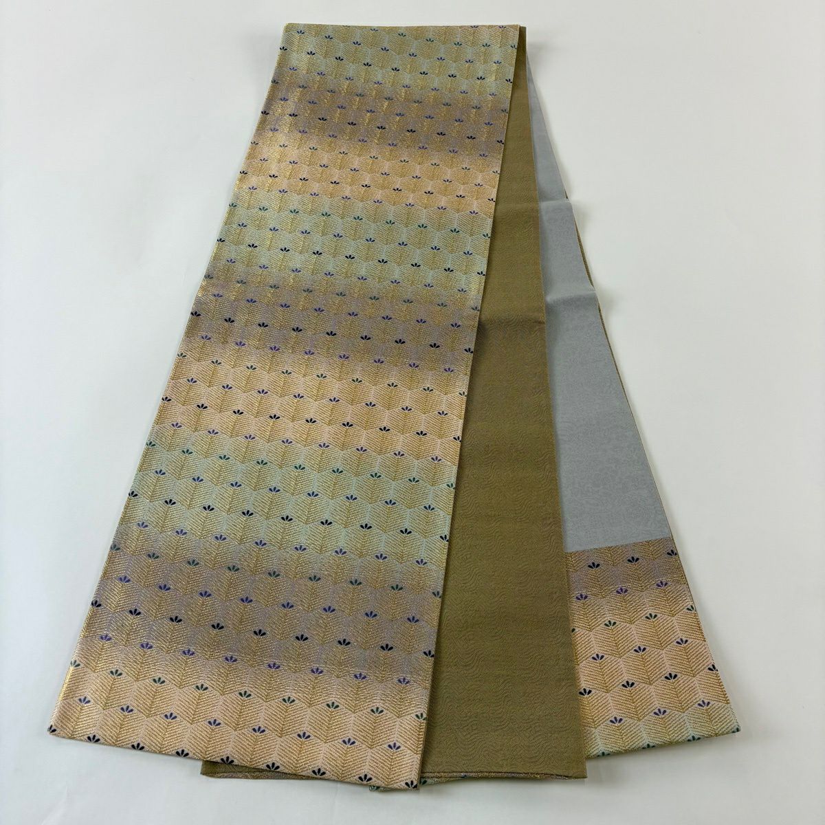 【美品】 袋帯 秀品 菊 幾何学模様 唐織 箔 灰緑 六通 正絹