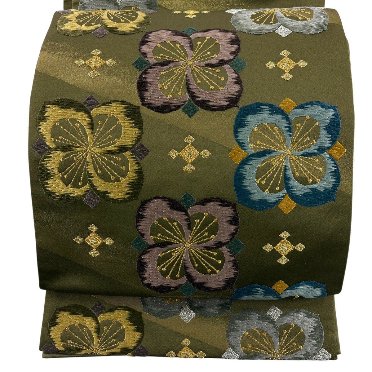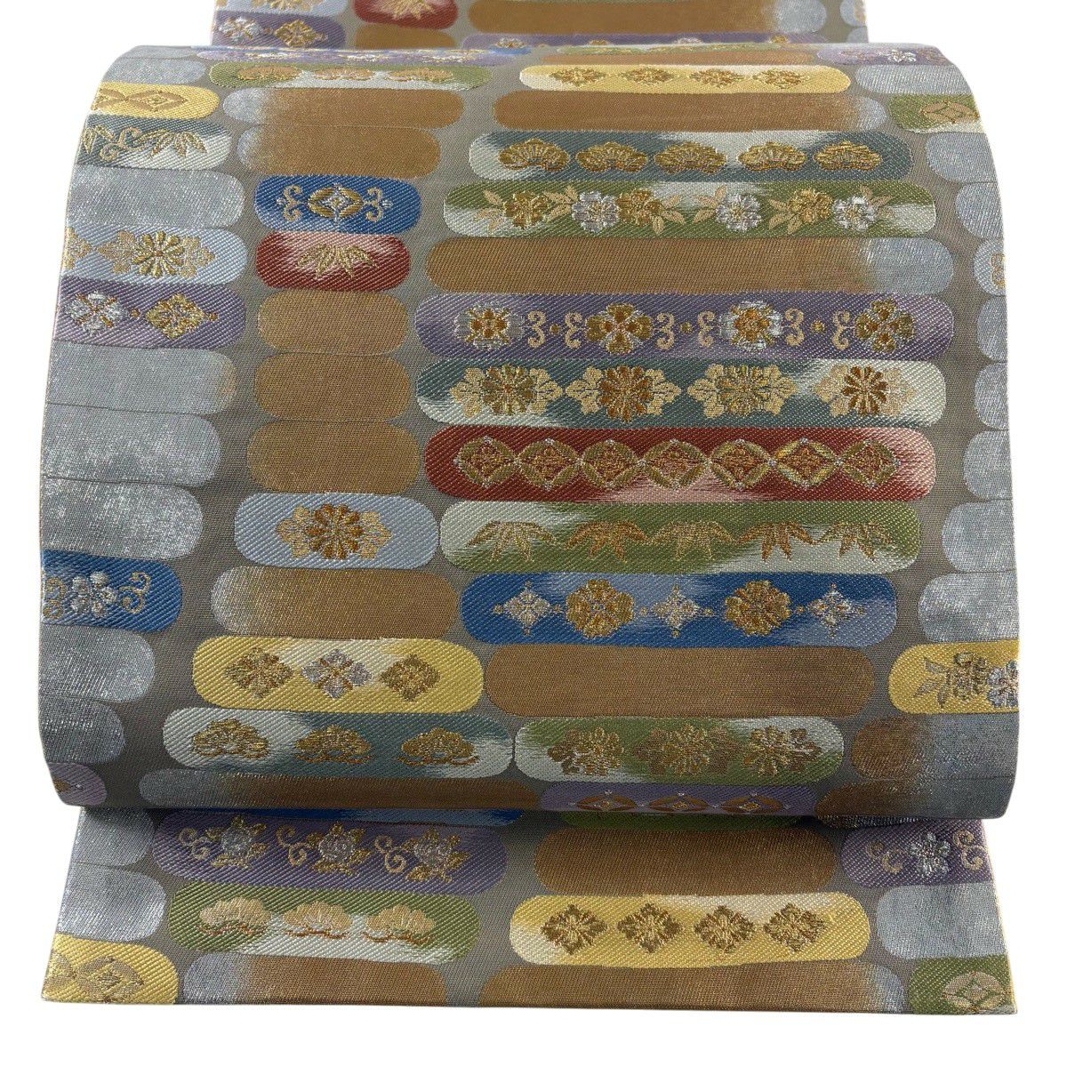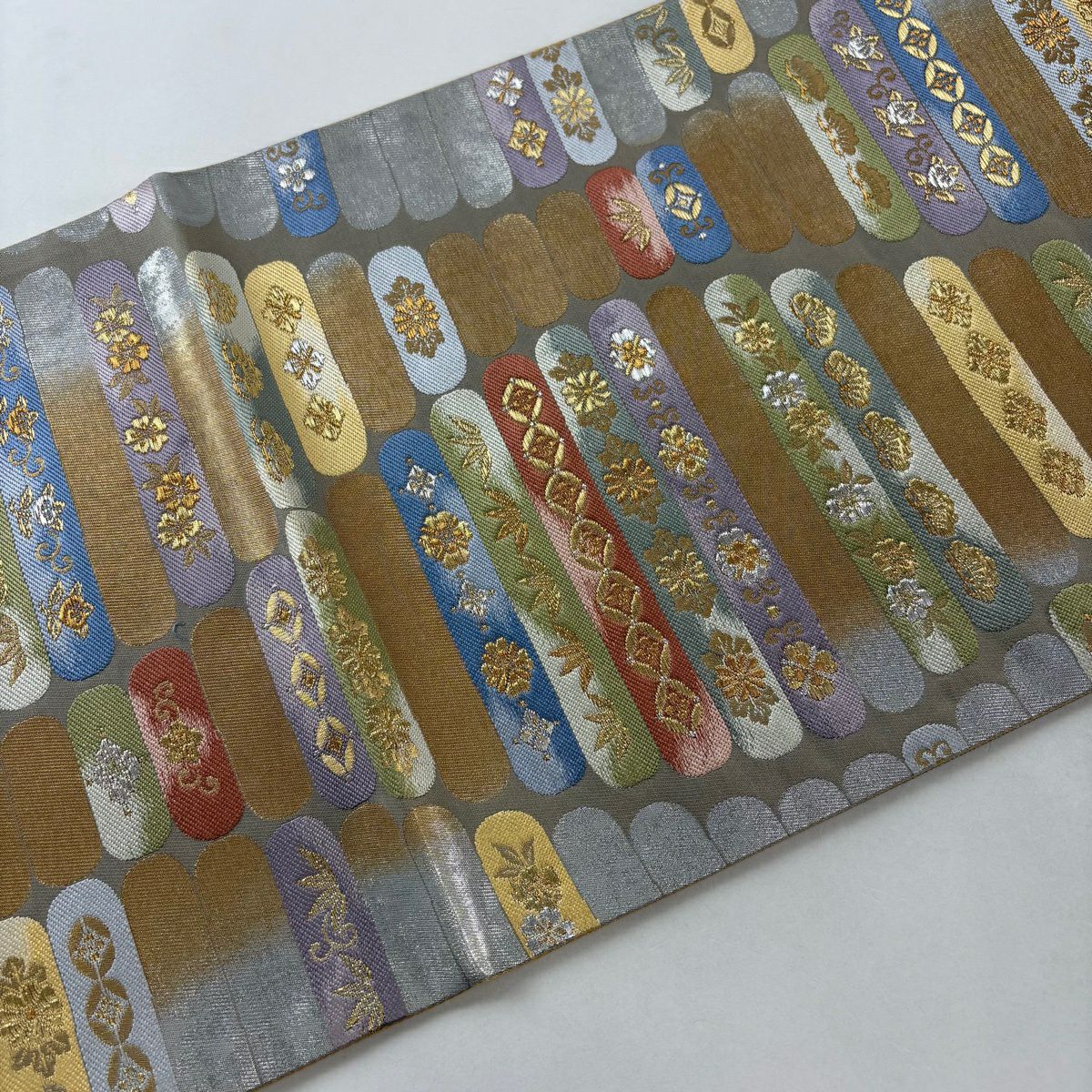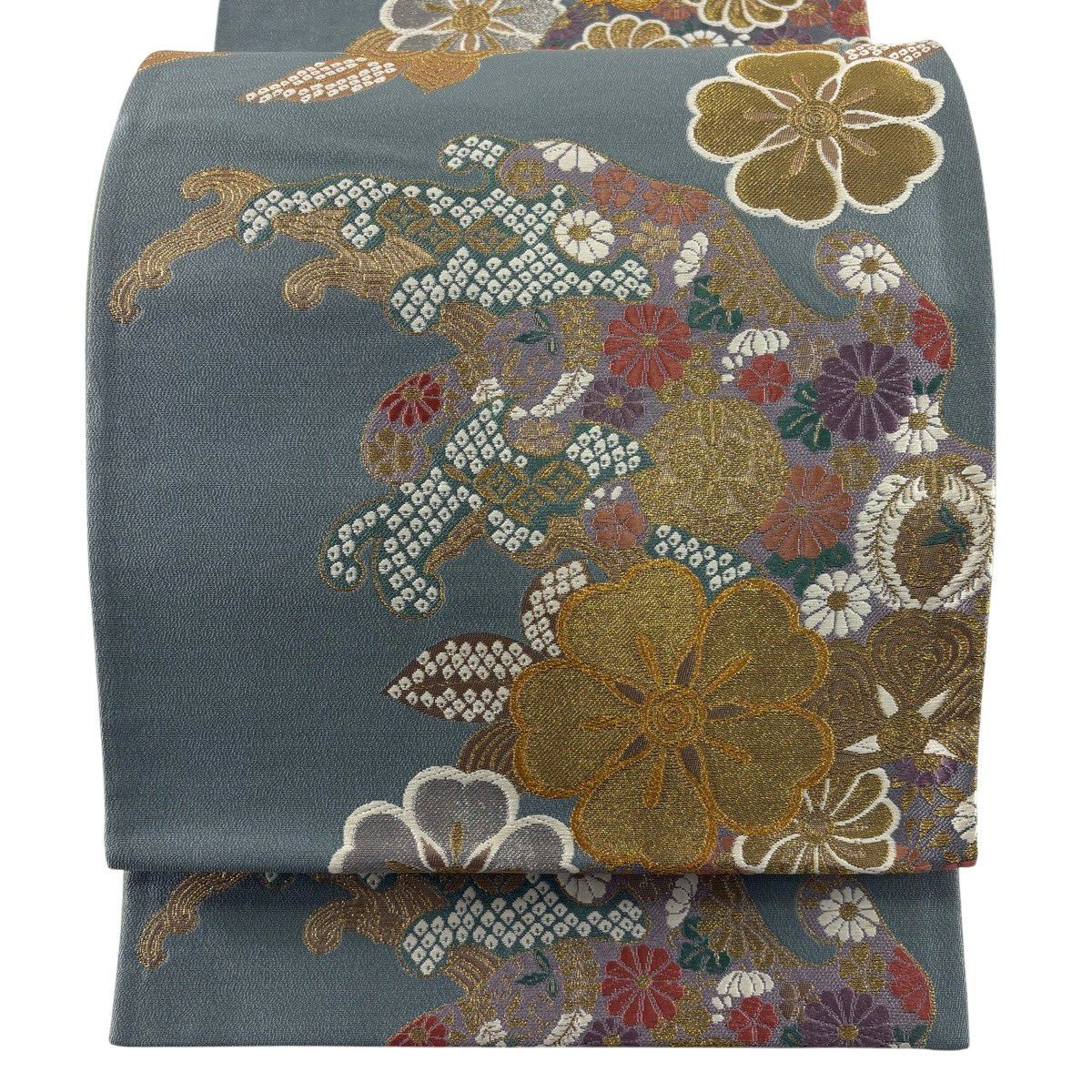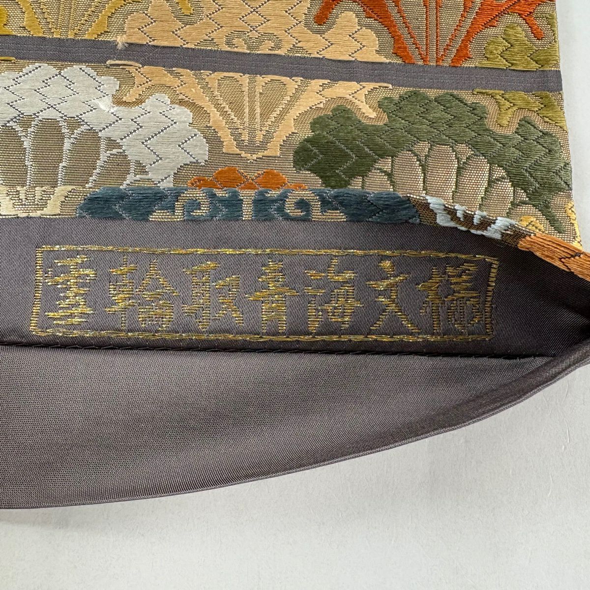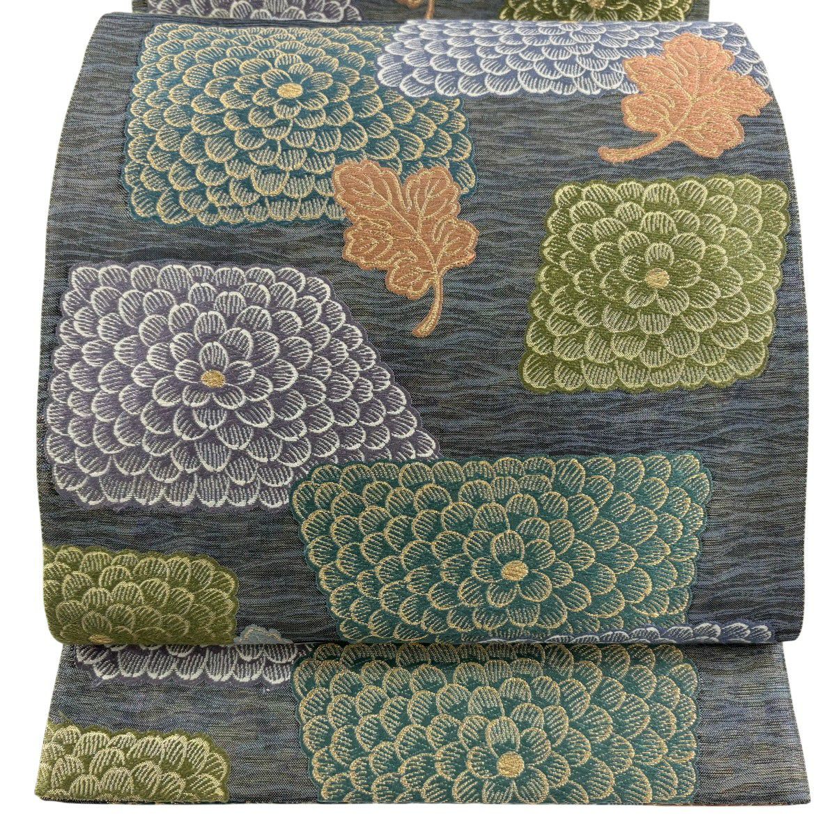 【美品】 袋帯 秀品 菊 幾何学模様 唐織 箔 灰緑 六通 正絹