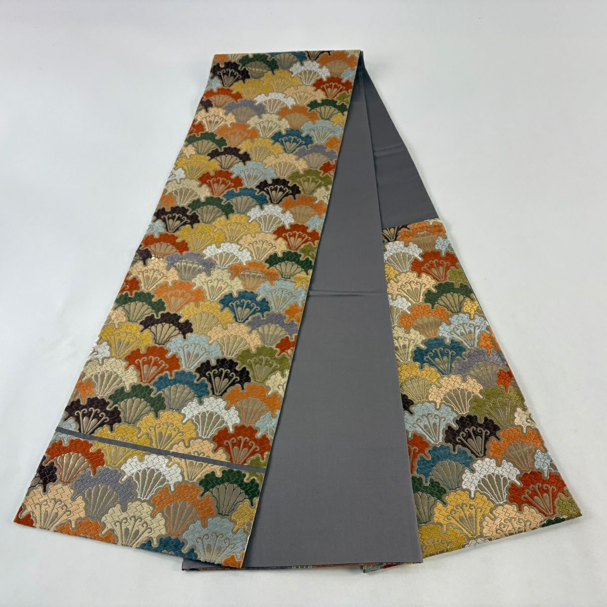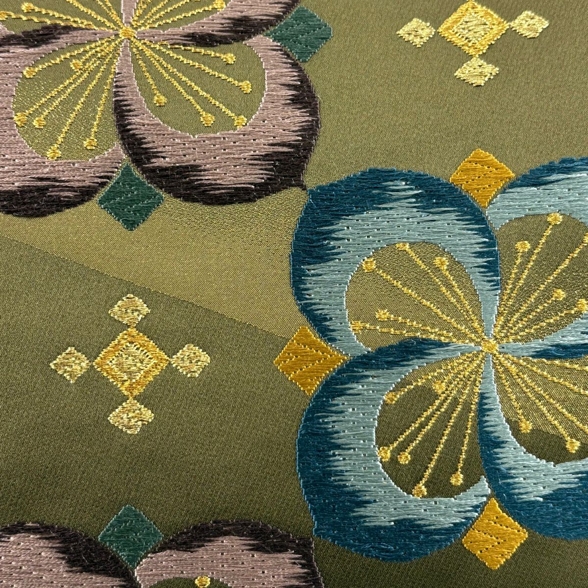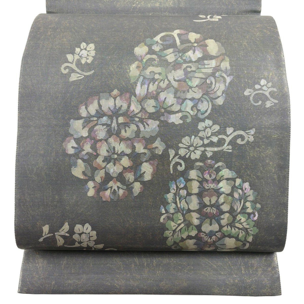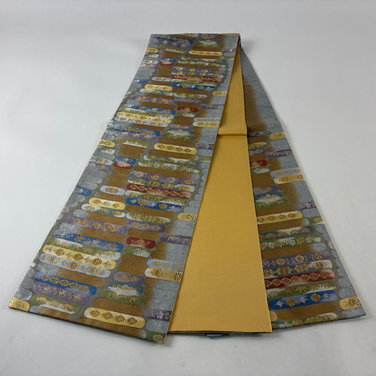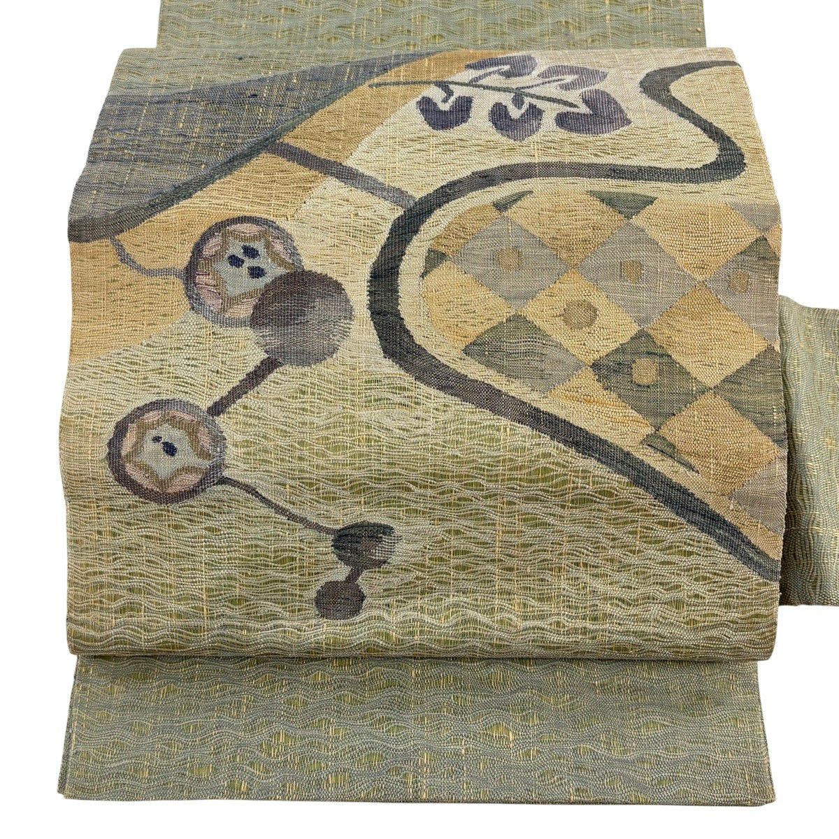 【美品】 袋帯 秀品 菊 幾何学模様 唐織 箔 灰緑 六通 正絹