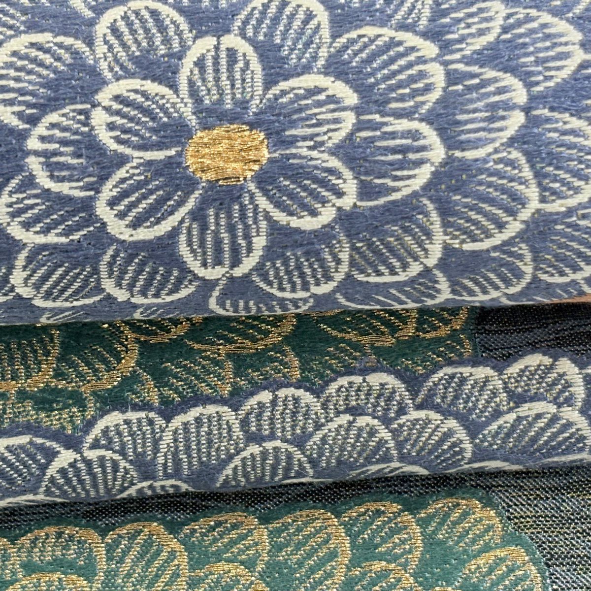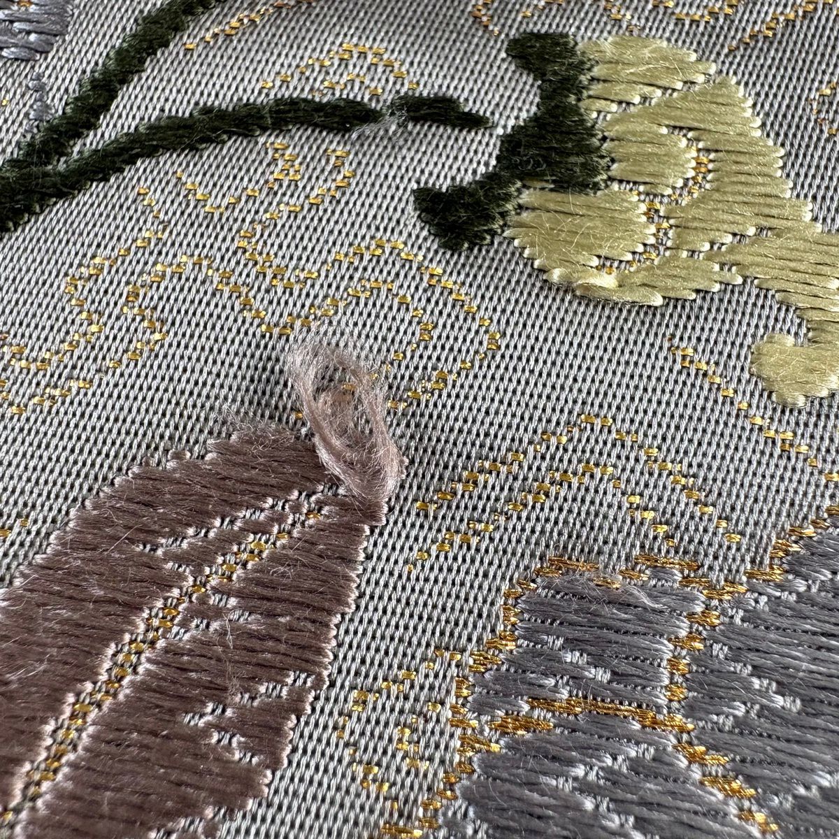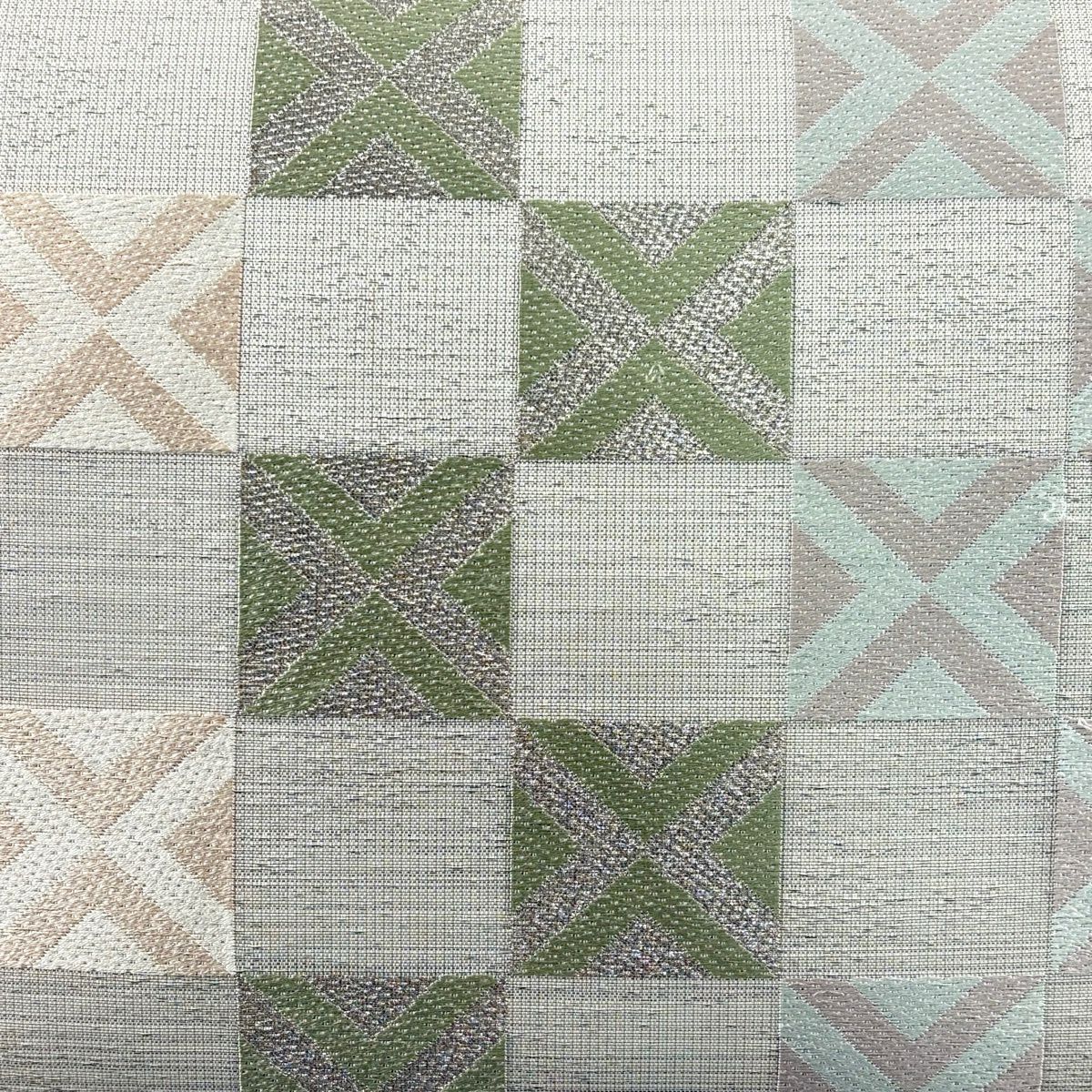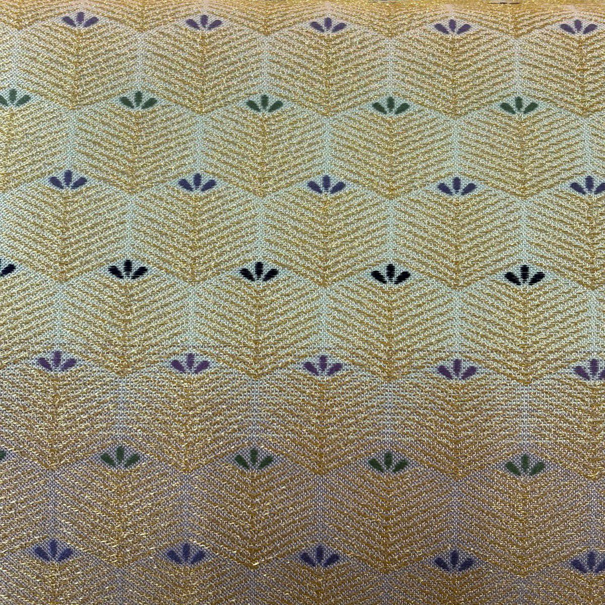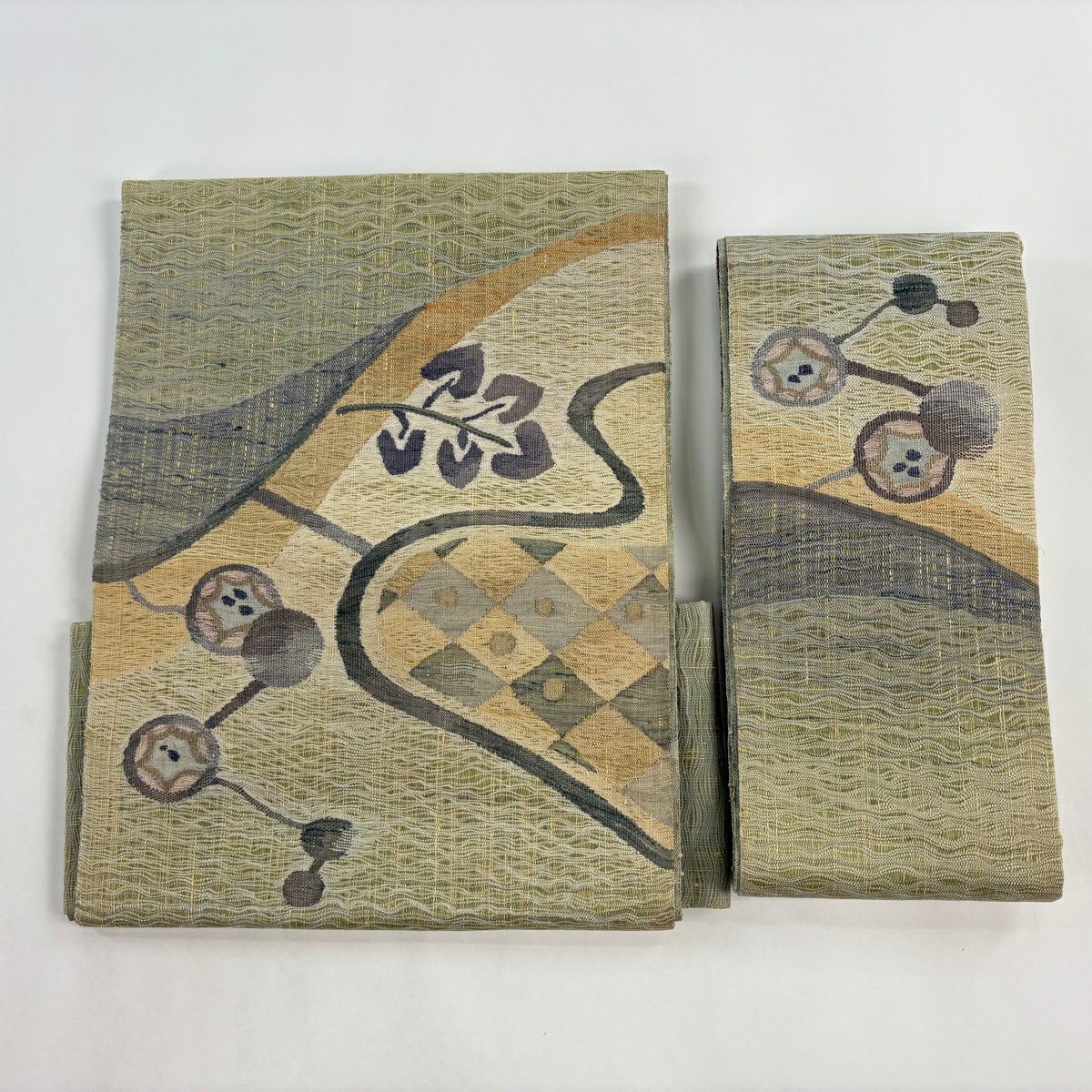 【美品】 袋帯 秀品 菊 幾何学模様 唐織 箔 灰緑 六通 正絹