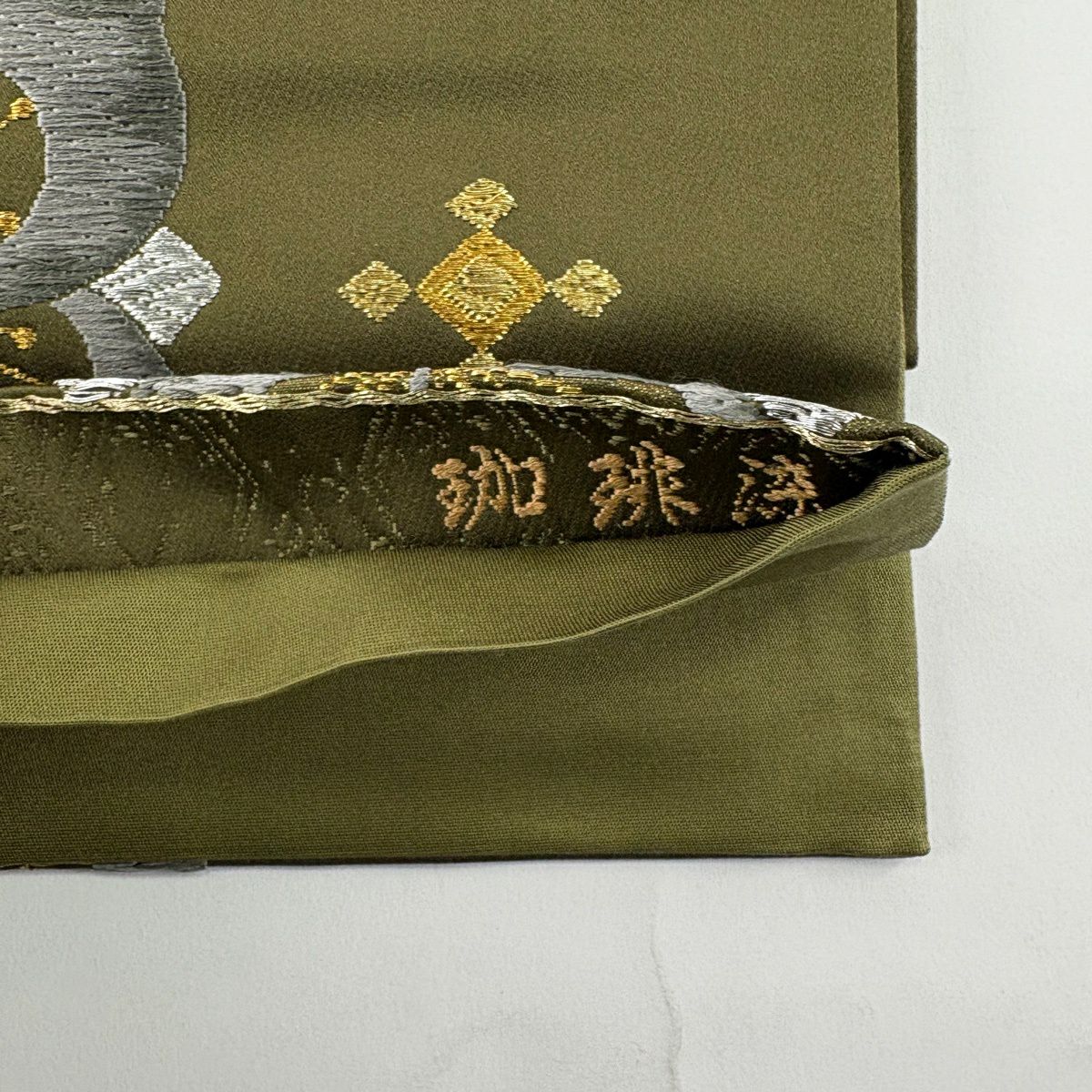 【美品】 袋帯 秀品 夢優花 幾何学 刺繍 箔 深緑 六通 正絹